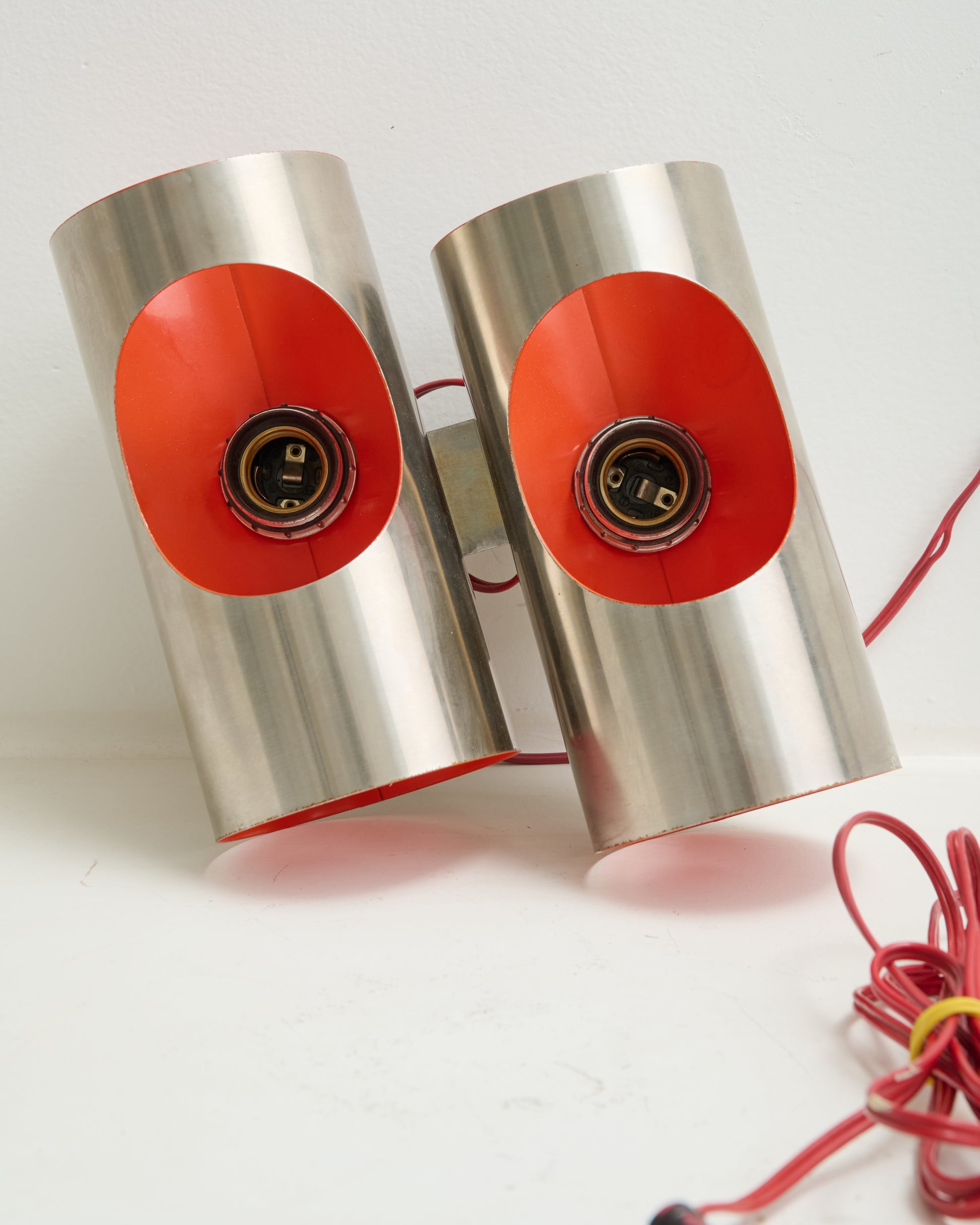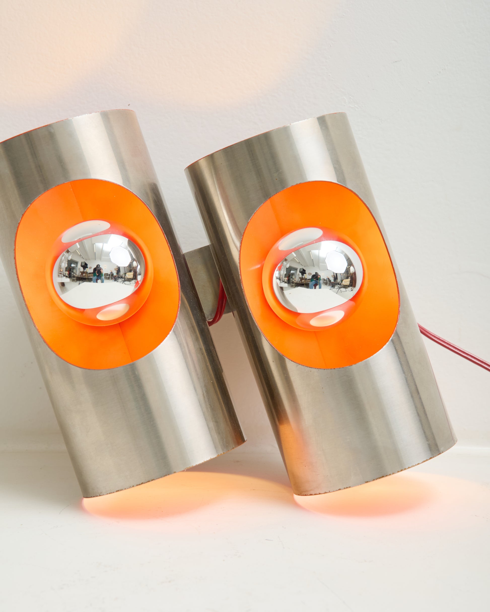Double Space Age wall light with a brushed stainless steel front and a reddish-orange metal back. The back structure is circular, and the front is also brushed stainless steel with a hole for an E27 bulb (not included). When lit, the back appears light orange. In good condition despite a few minor marks on the back, barely noticeable once mounted.