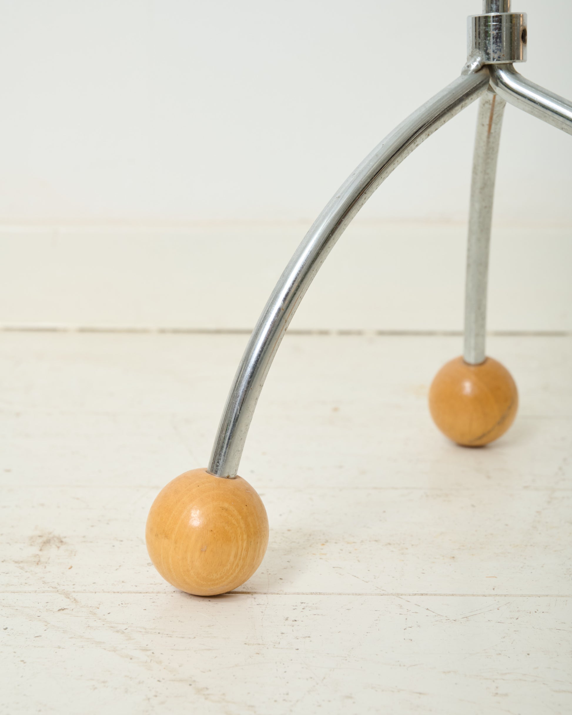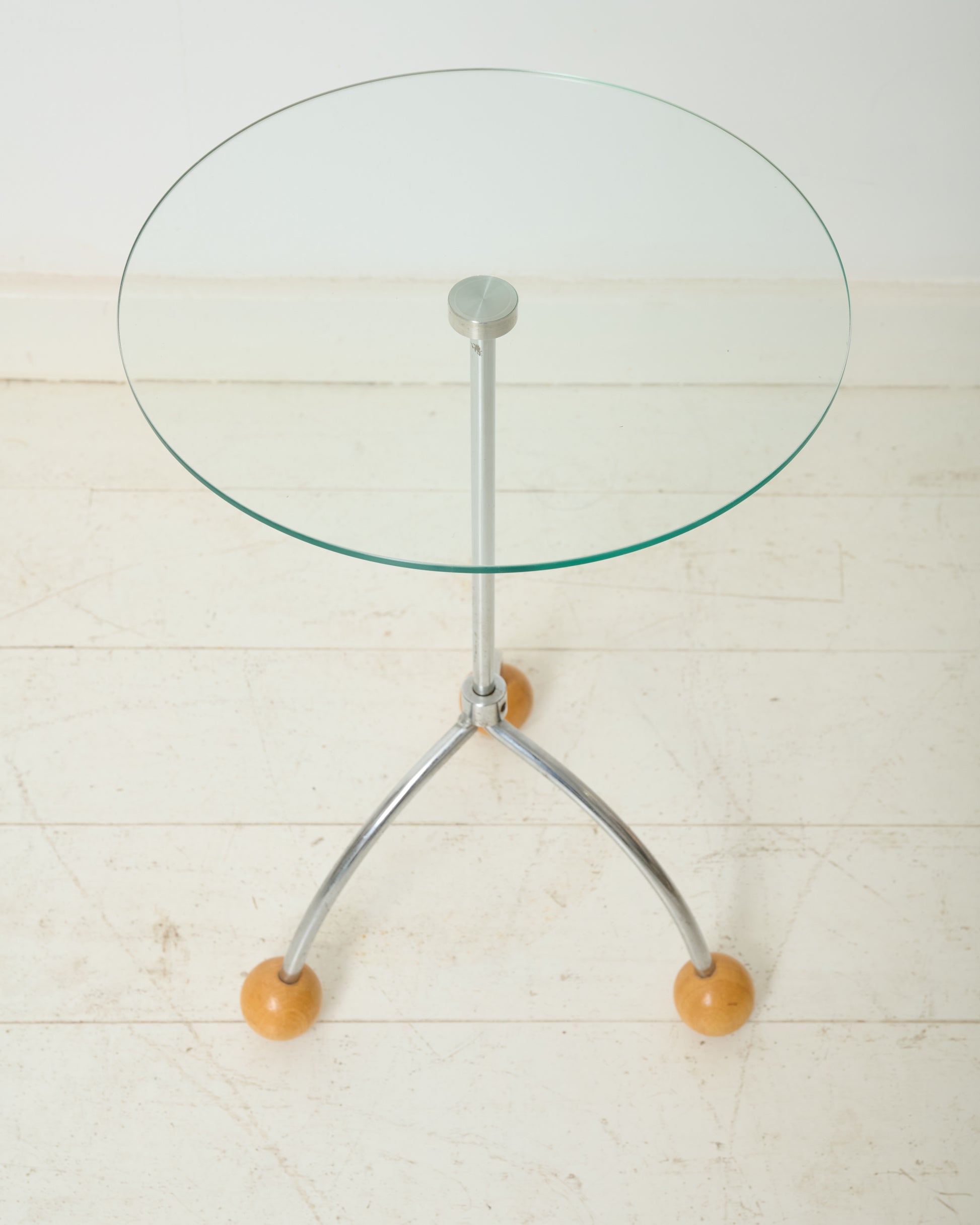 Glass side table with chrome base featuring three wooden balls. Memphis style. Very good condition.