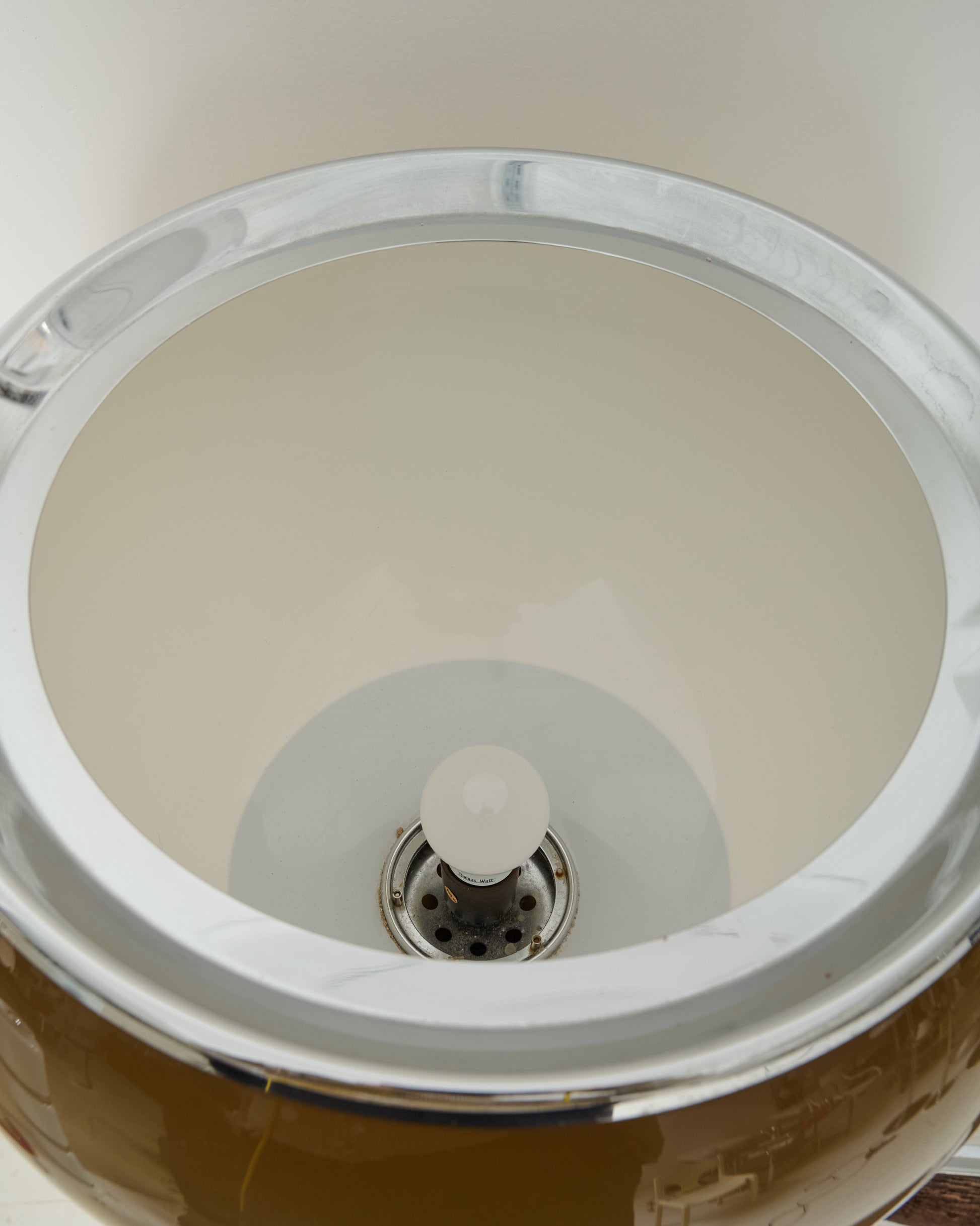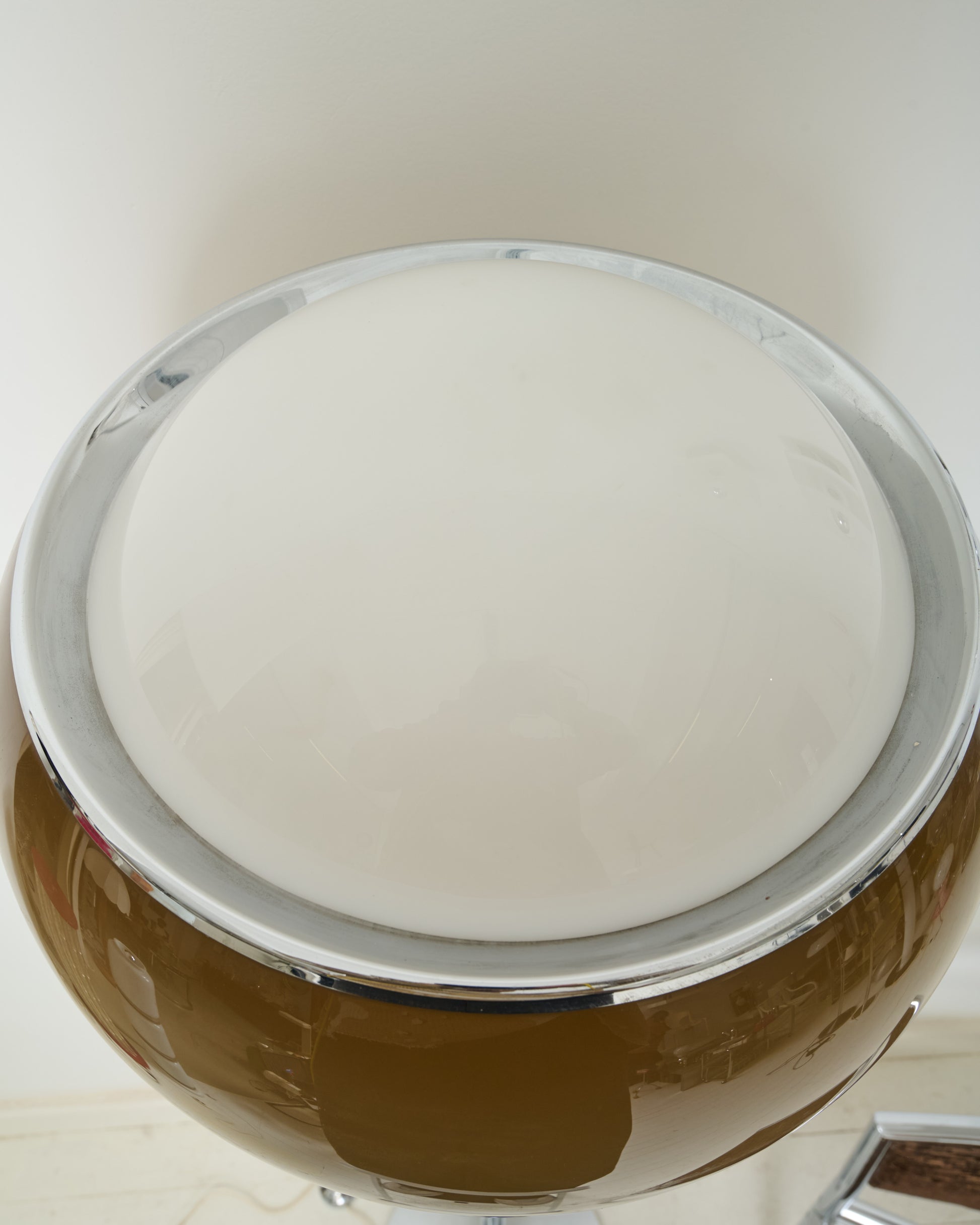"B" Floor Lamp "Bud Grande Flash" or "Bud Grande", emblematic of the space age in the 1970s. Chromed steel structure and translucent champagne acrylic diffuser. Soft and warm light. The lamp requires an E27 bulb. The second set of photos shows an older model we had for sale. It's the same model available but with a more champagne tint.