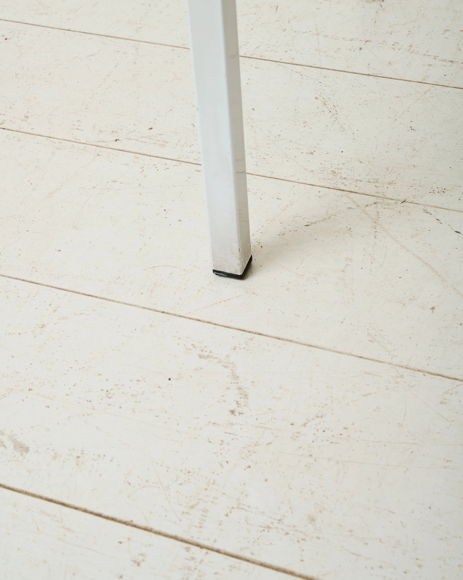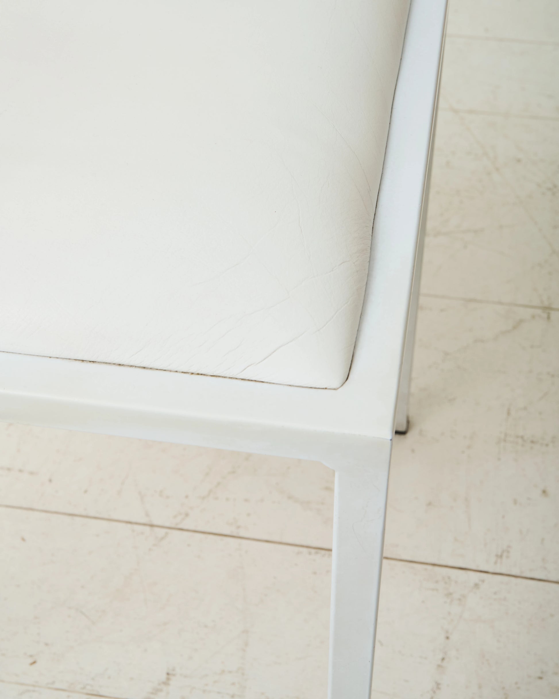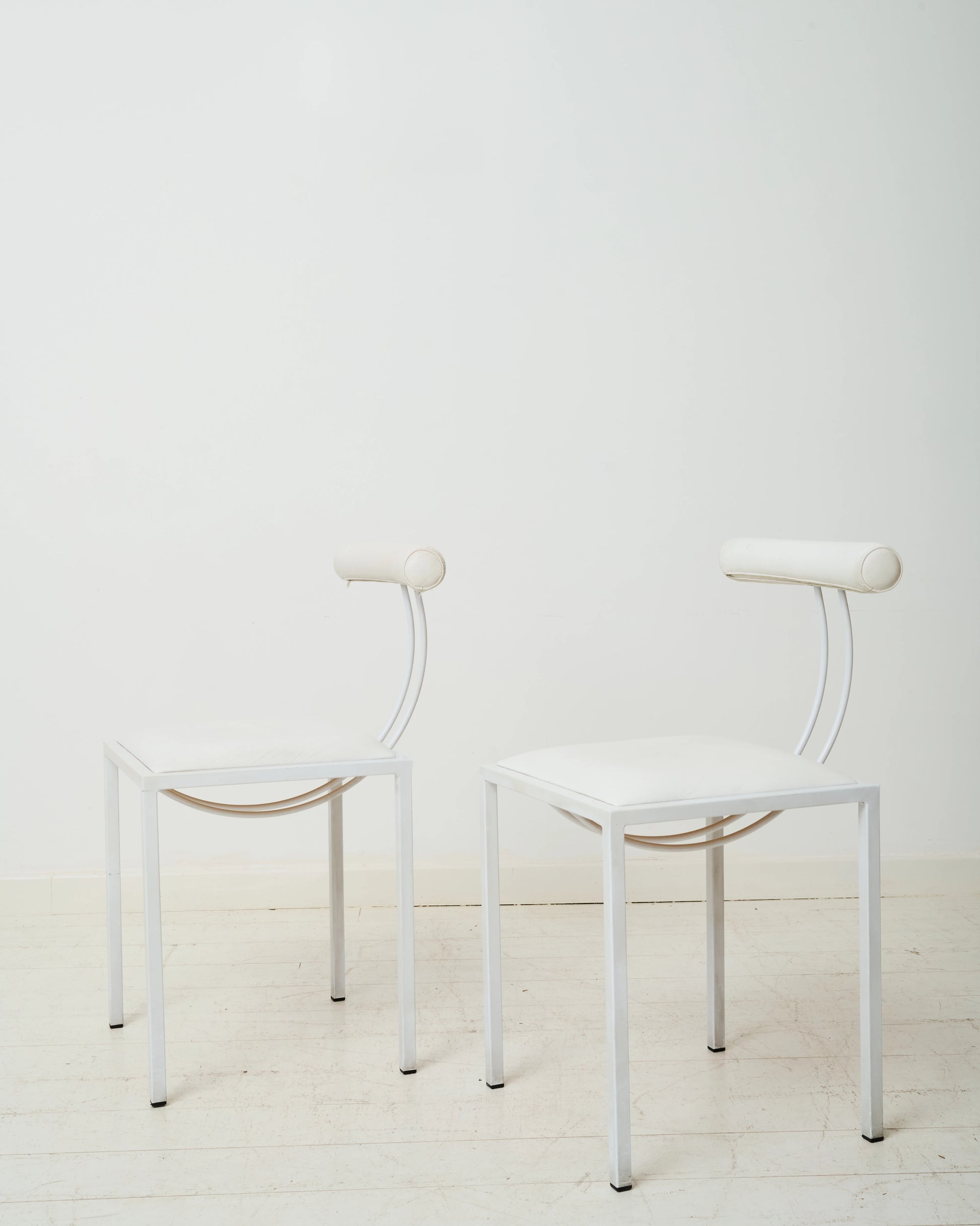Pair of chairs produced by Artelano in Italy in the 1980s. Made of white lacquered metal with a white leather roll back, supported by a double rod connected to the square, white leather-upholstered seat. In very good condition despite slight wear on the bottom of the legs.
