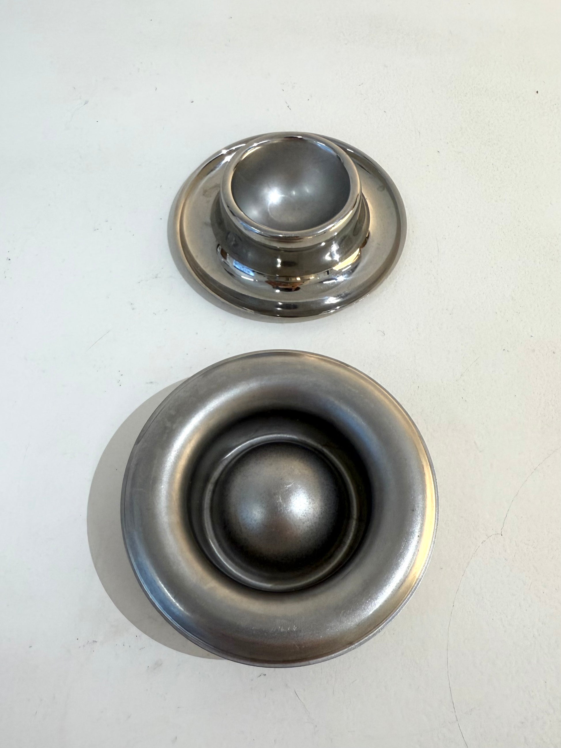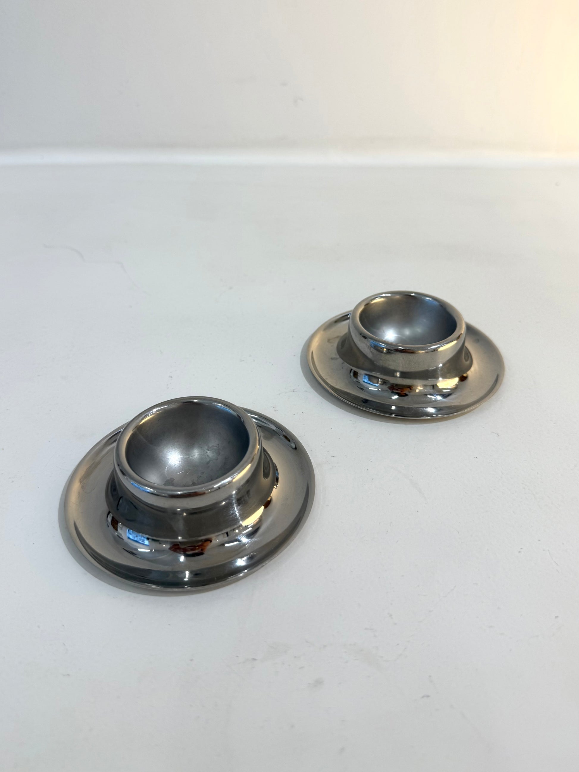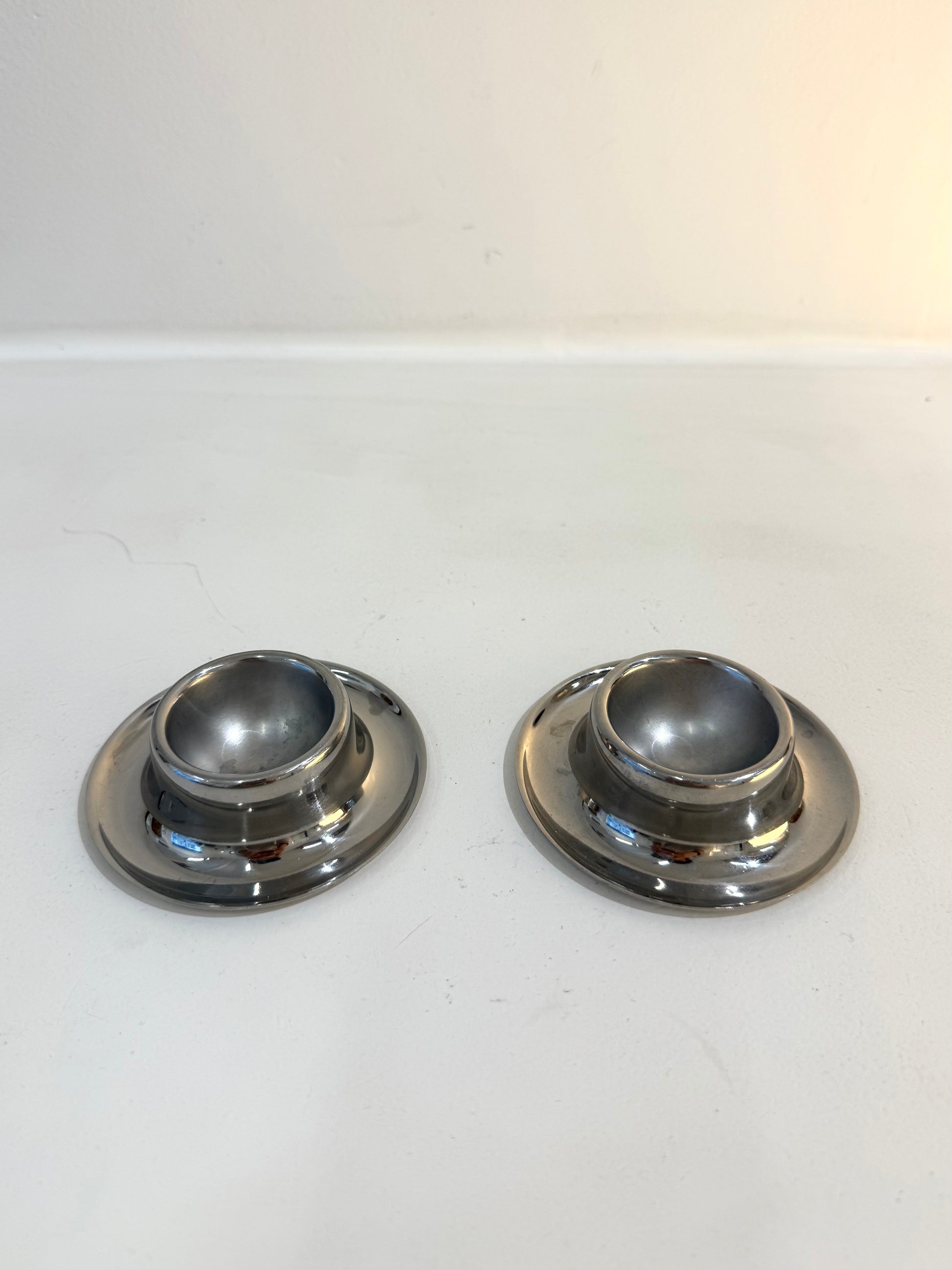 Set of two Space Age egg cups with rounded shapes, made of stainless steel, from the 70s. Very good condition.