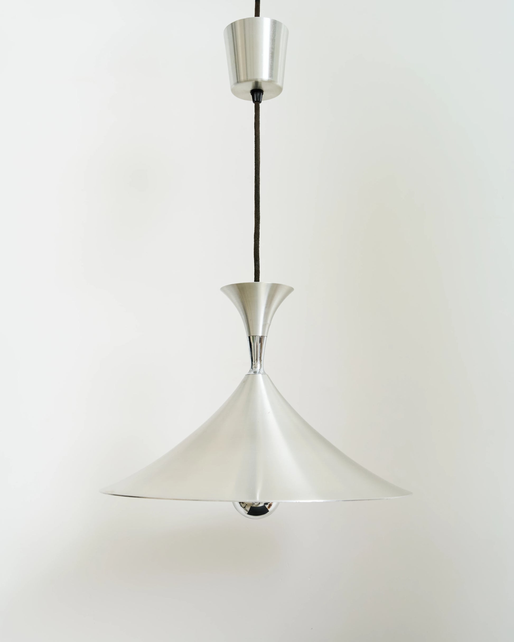 Brushed aluminum pendant light by Polam Bielsko from the 1970s. Three lights. Space Age style. Very good condition despite some light scratches.