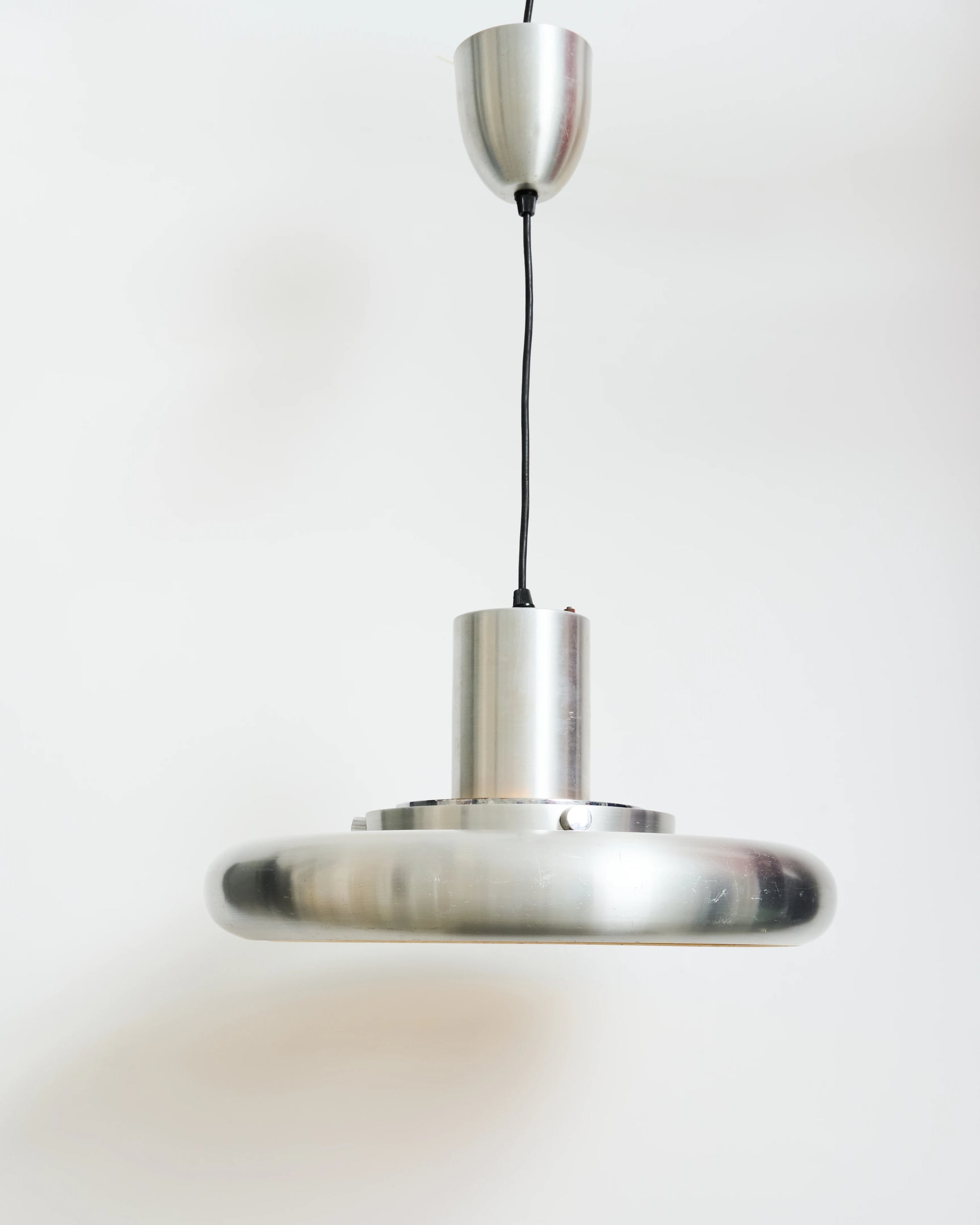 Brushed aluminum pendant light by Polam Bielsko from the 1970s. Three lights. Space Age style. Very good condition despite some light scratches.