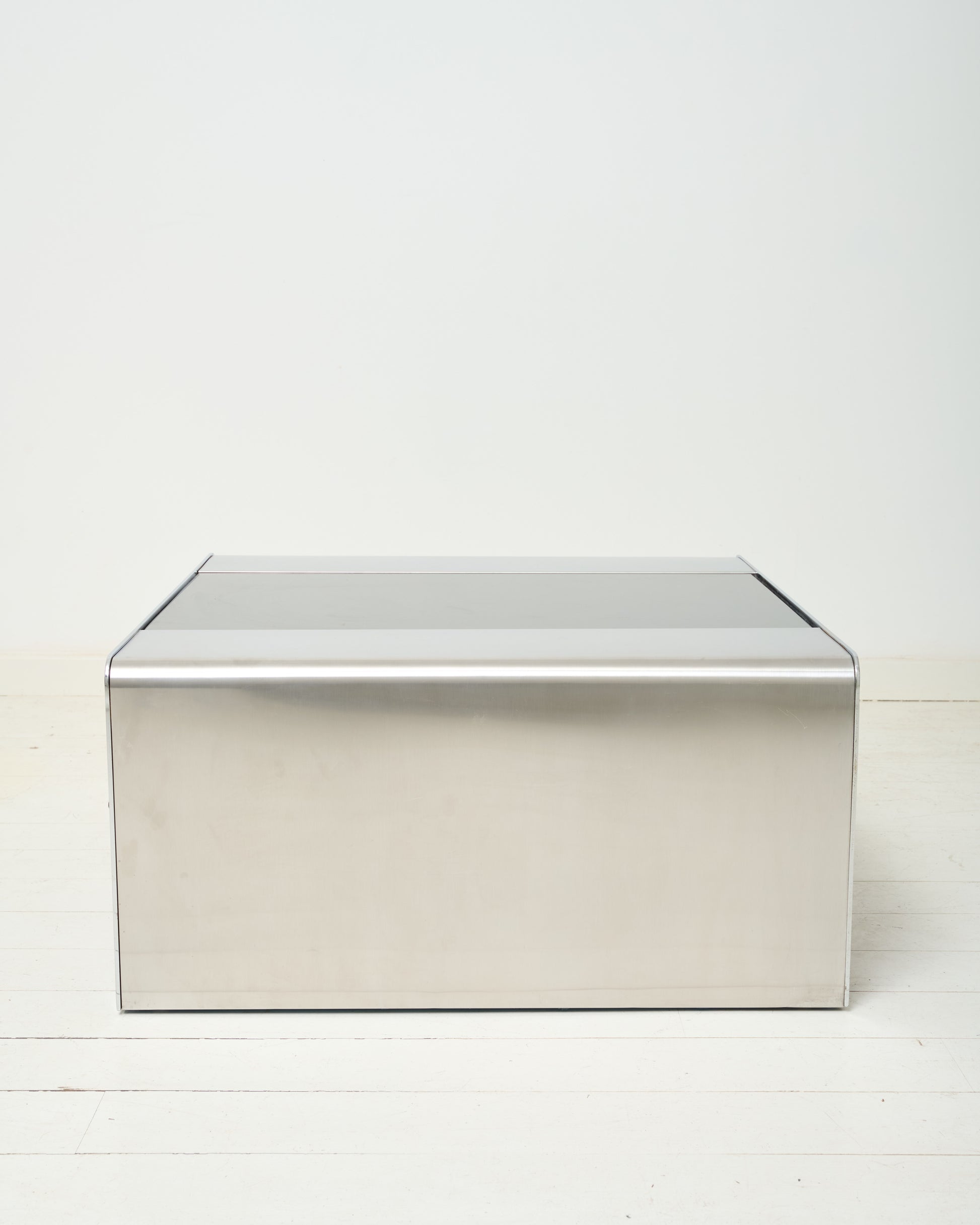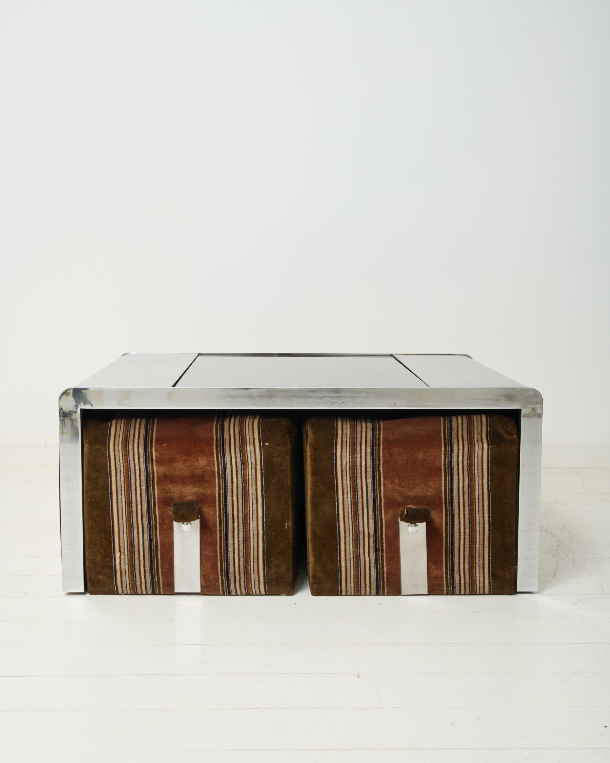 Coffee table in brushed aluminum and smoked glass. Four velvet poufs with chrome details slide perfectly under the table. Very good condition despite some signs of wear (light scratches).