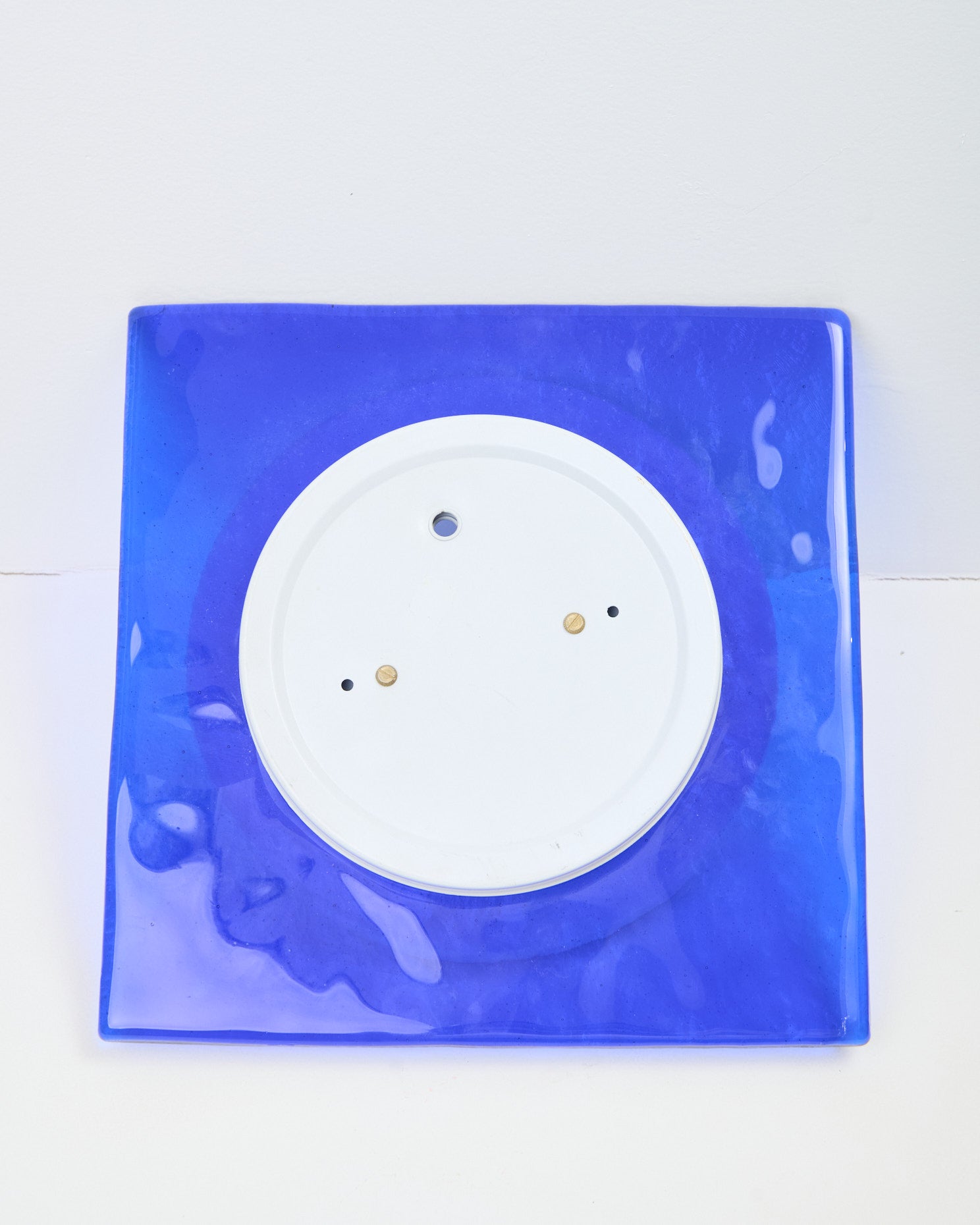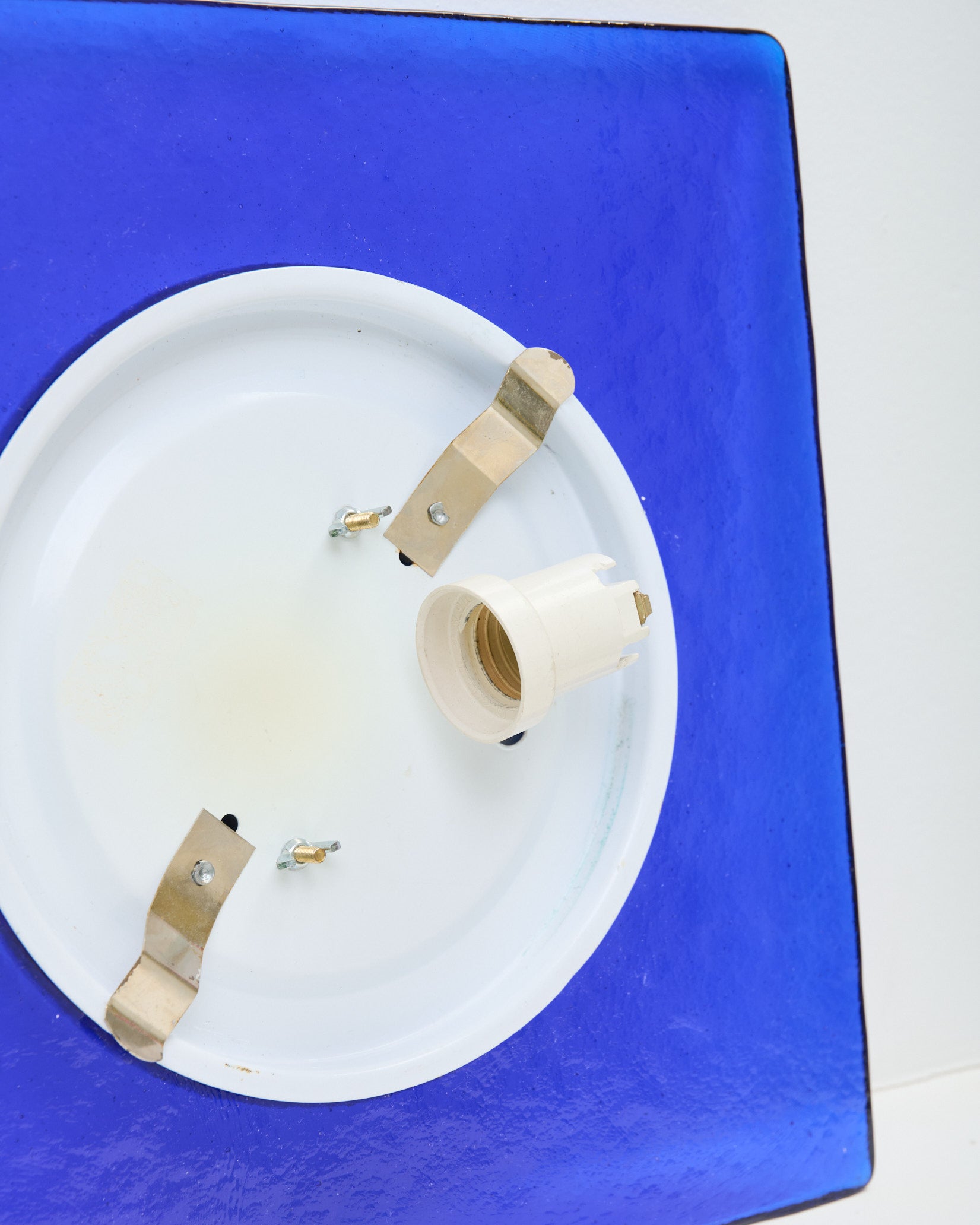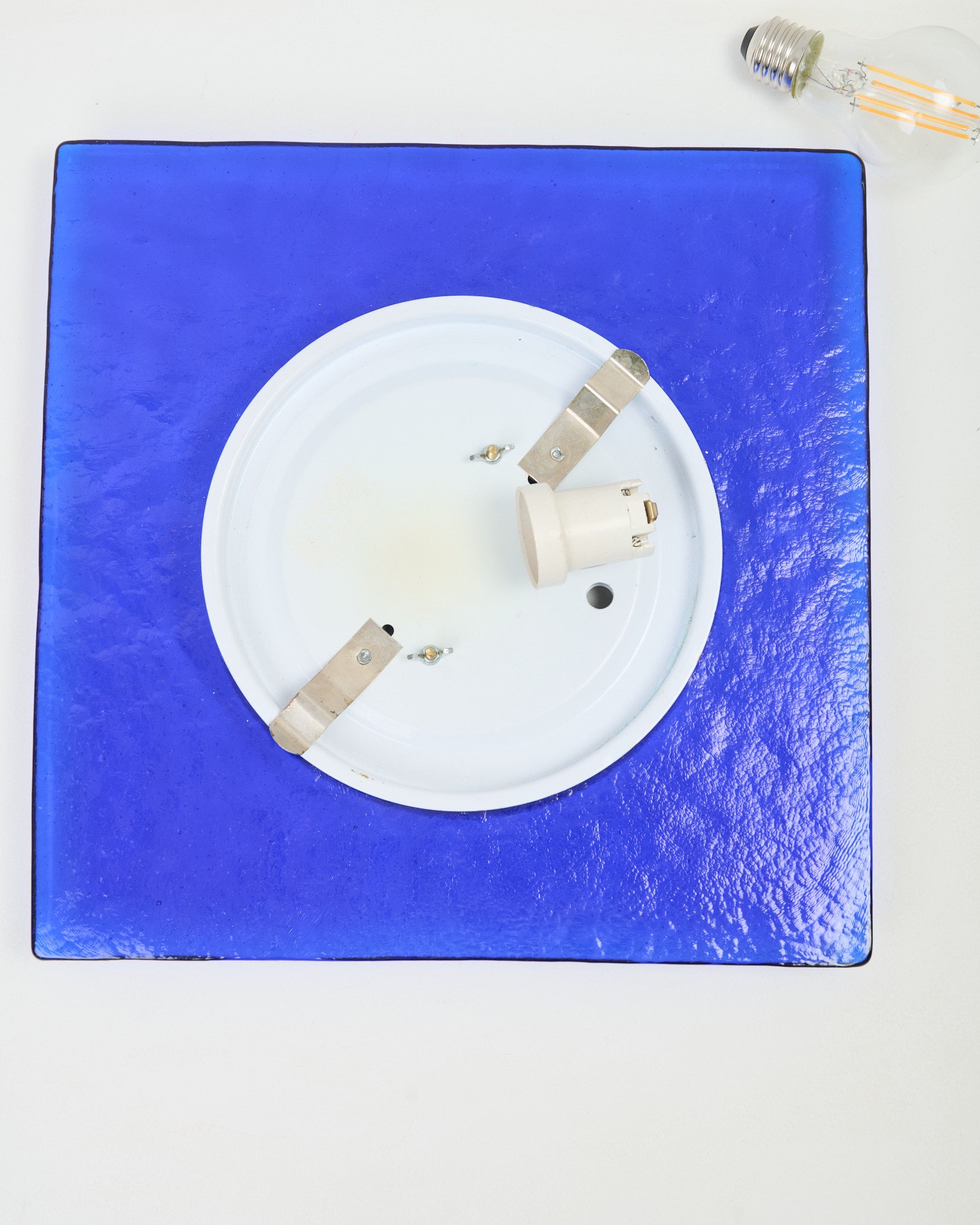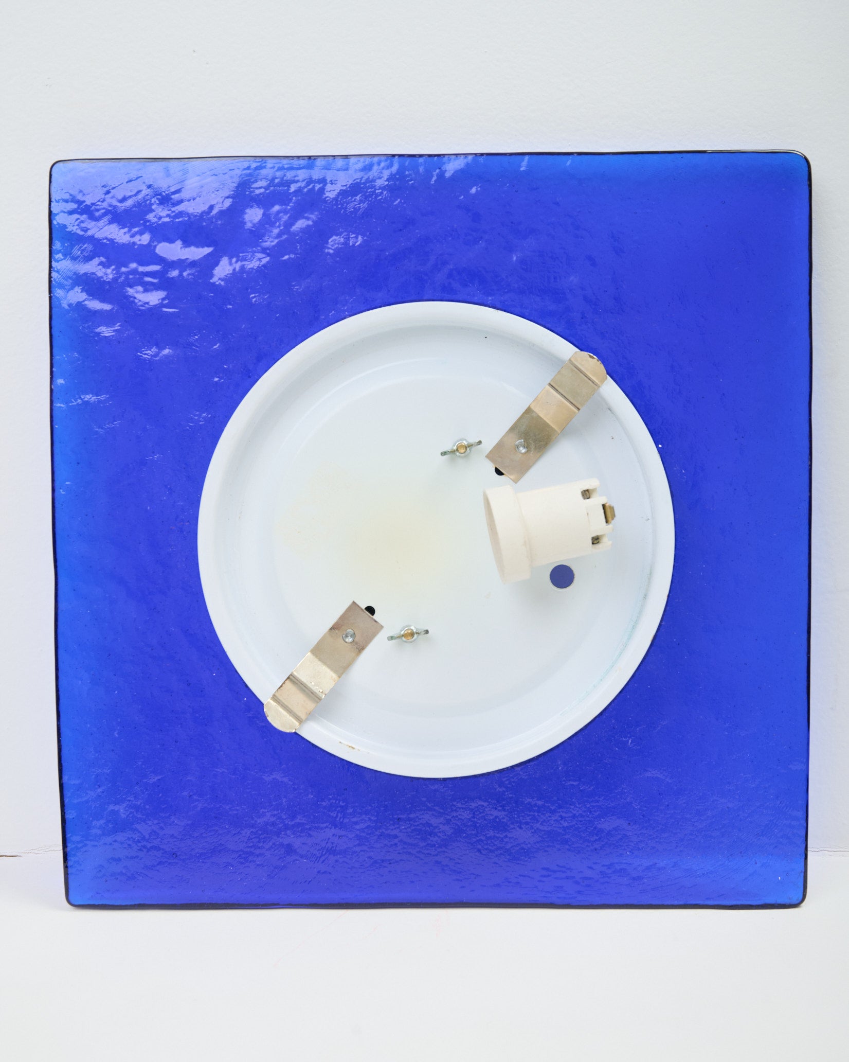 Applique carrée en verre de Murano bleu par Vetri dans les années 70-80 en Italie. Composé d'un rond dans un carré. Bases en verre soufflé de Murano bleu et globe en verre blanc. Douille E27. Le système électrique sera remplacé entièrement. Parfait état.