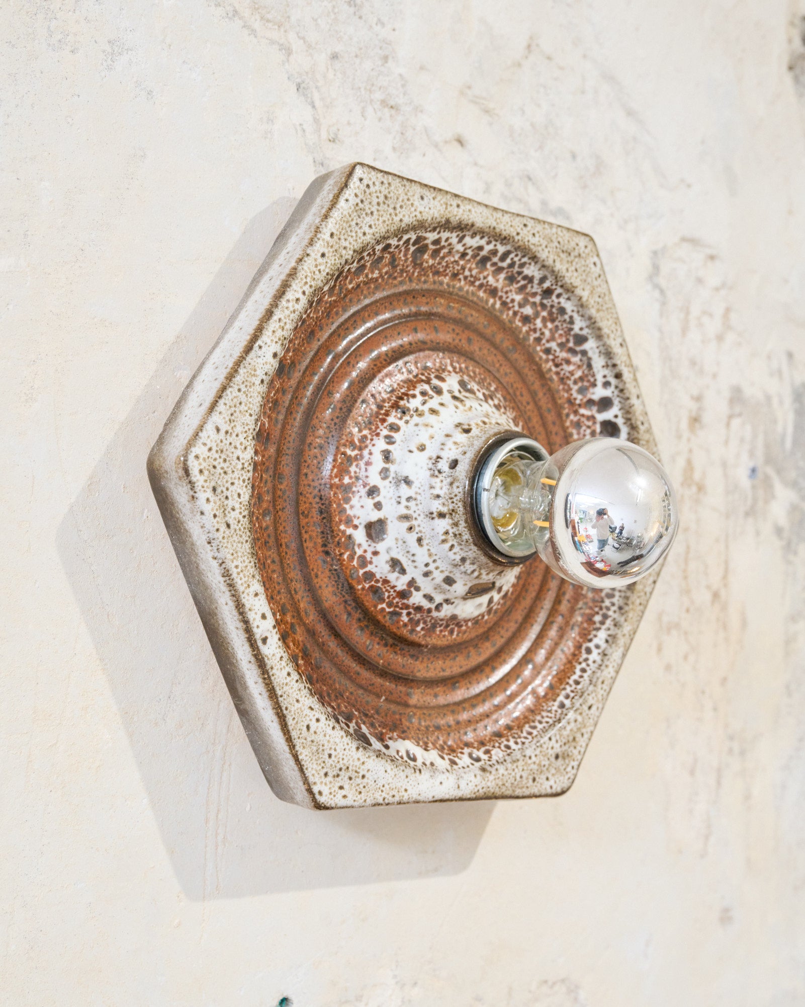 Applique murale en céramique Fat lava de la fin des années 60. Forme hexagonale. Émail dans différentes nuances de brun, gris et beige. Très bel état, artisanal et vintage.