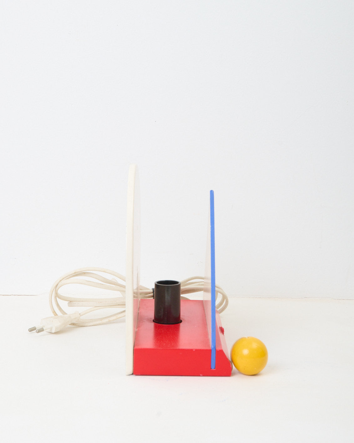 Applique murale design Ikea des années 1980. Conçue par Ettore Sottsass pour Ikea Pays-Bas. Design Memphis. Lampe est en bois et en métal. Dans les couleurs blanc, bleu, rouge et jaune. Cordon marche/arrêt. Avec une boule en bois jaune à la fin. Bel état.
