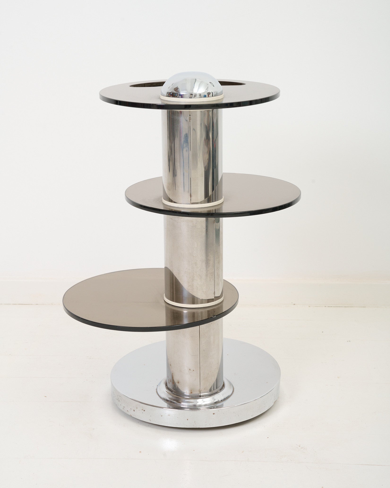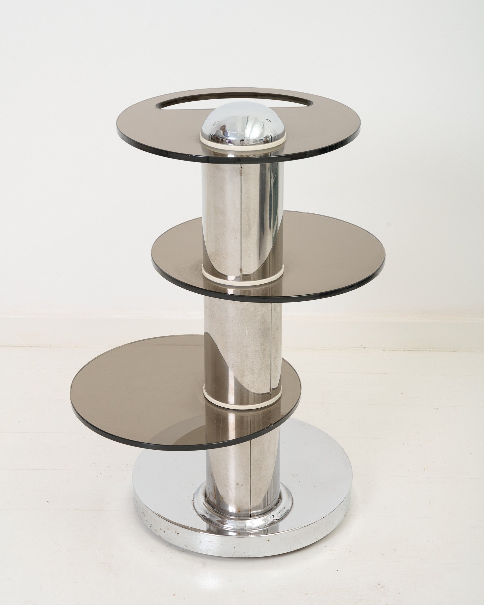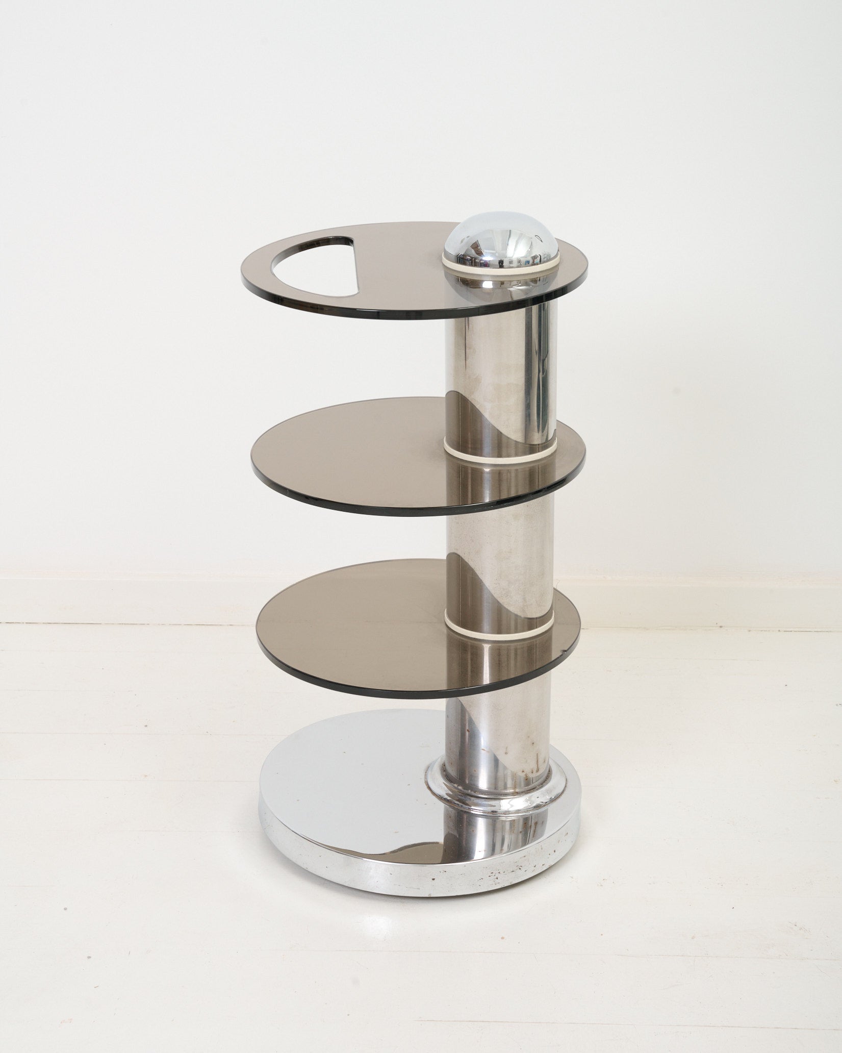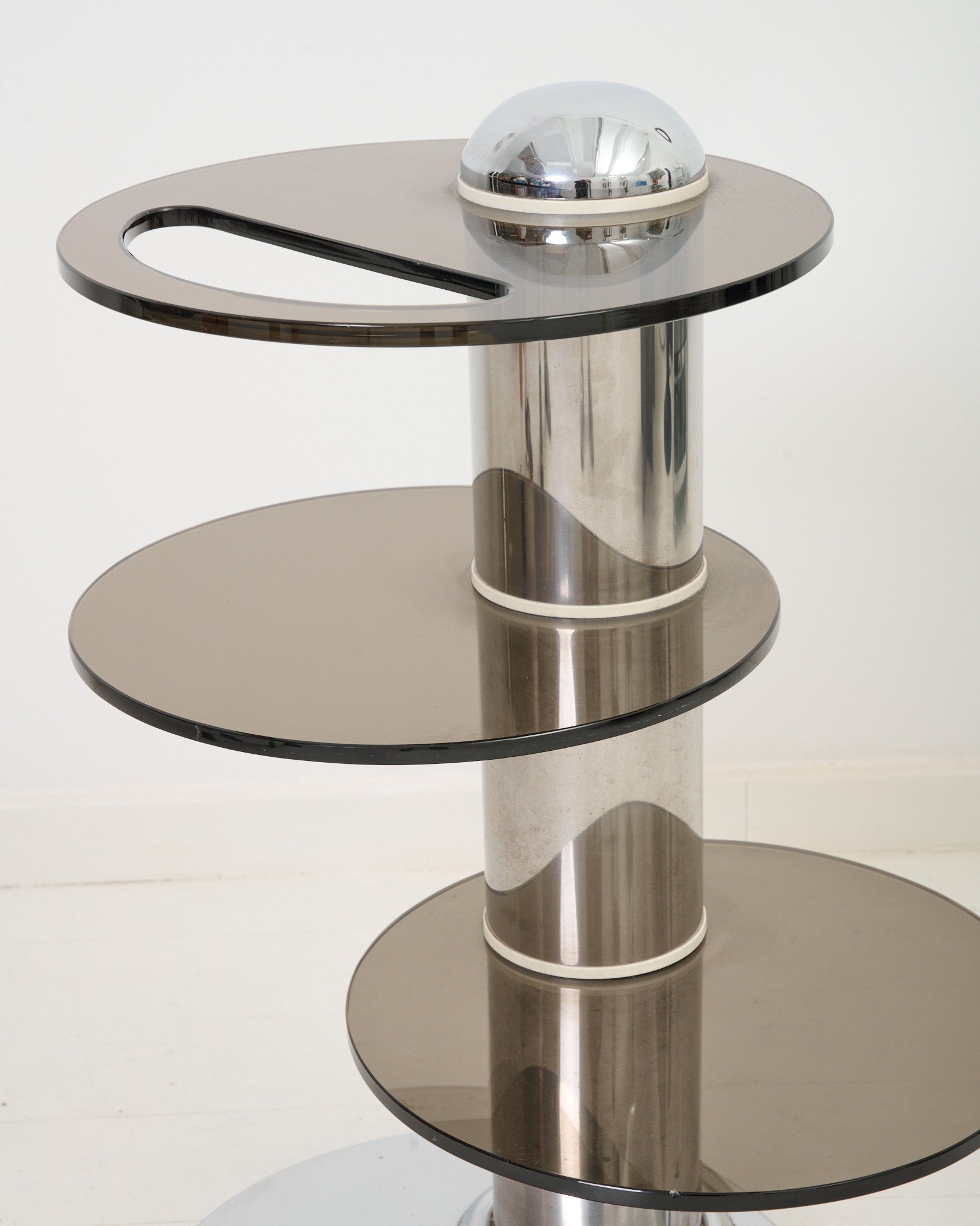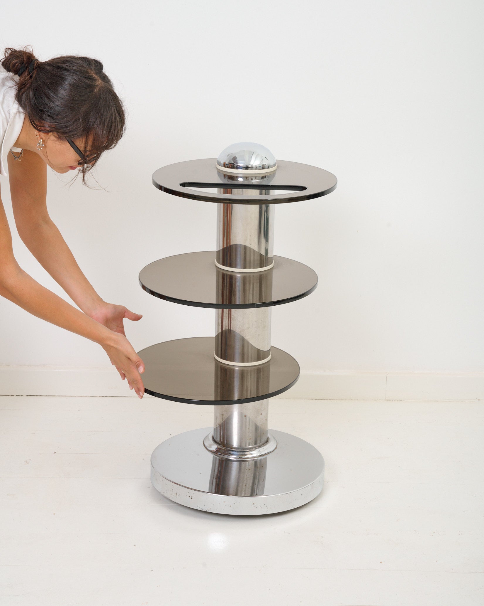 Bout de canapé italien doté de trois plateaux ronds coulissants sur une base en chrome avec roulettes. Space age. Très bel état.
