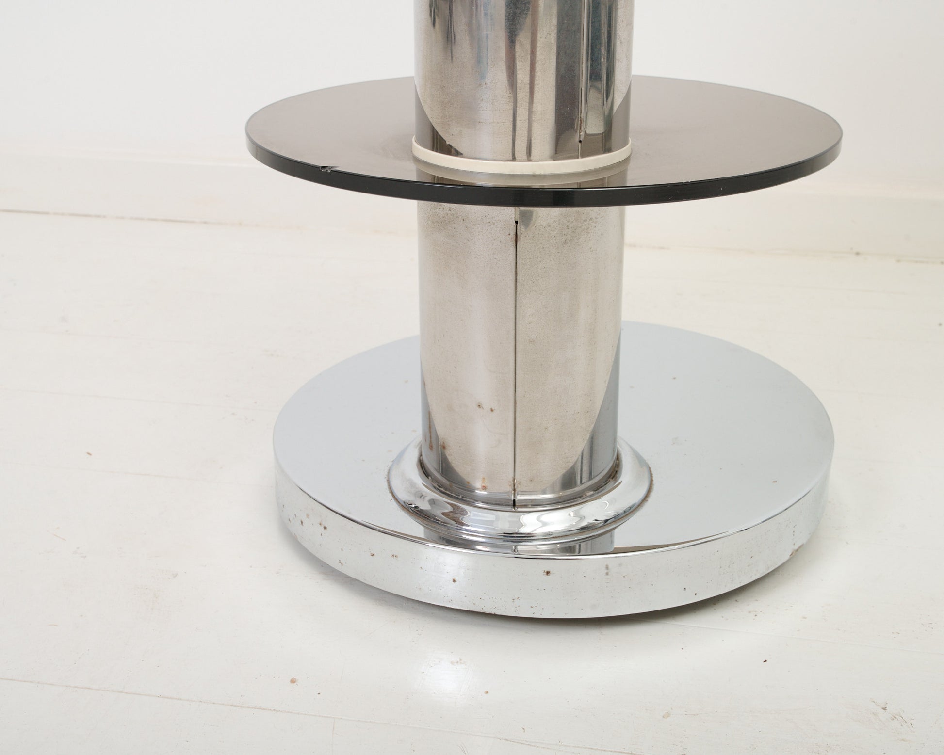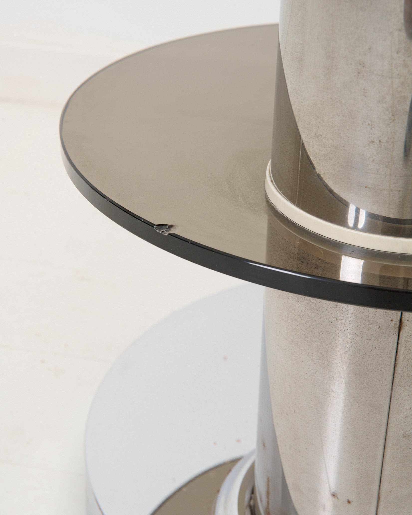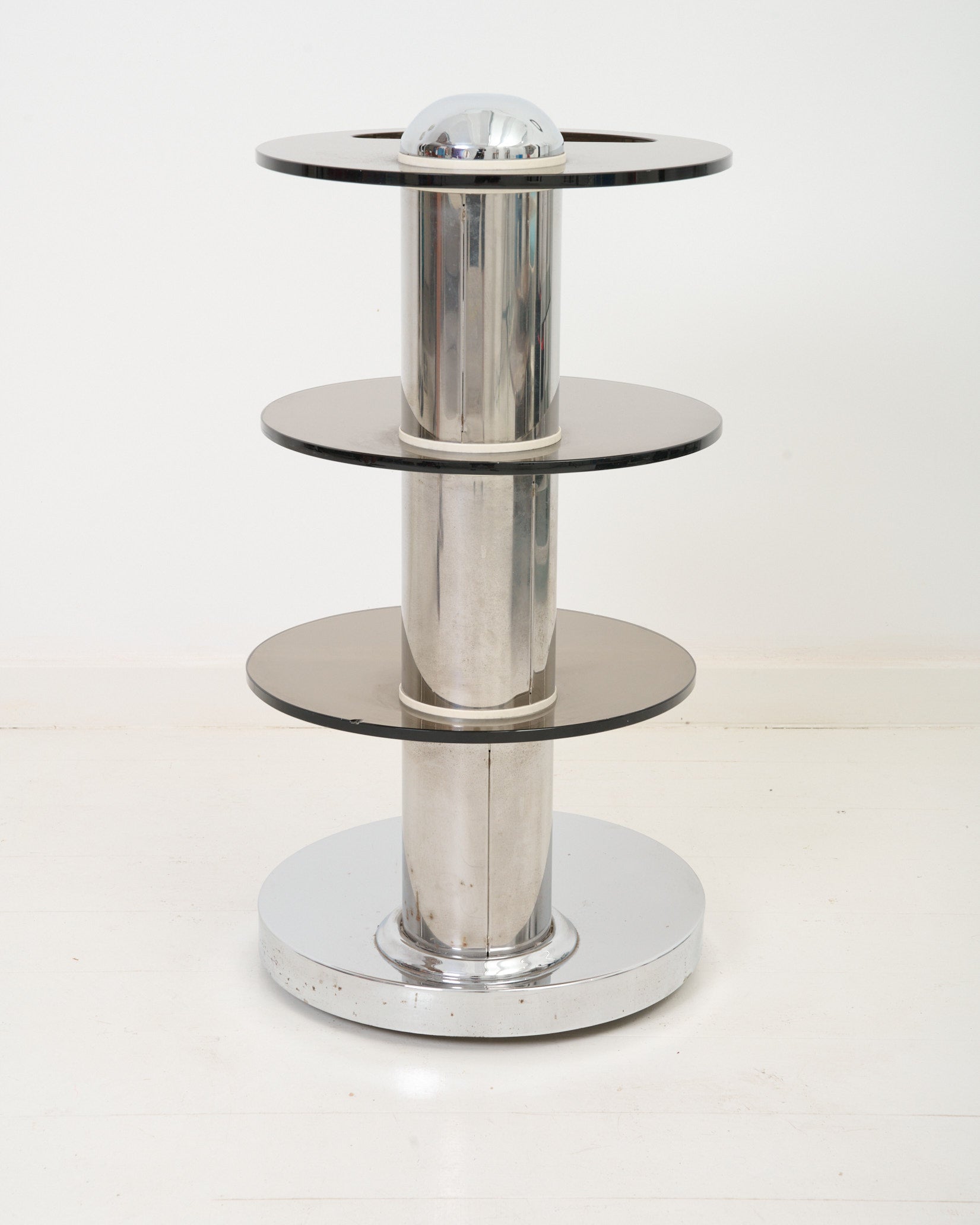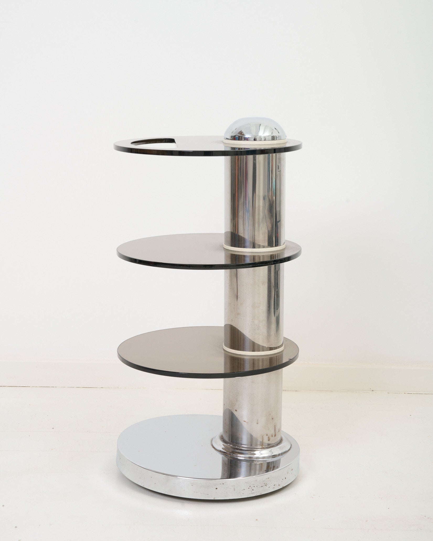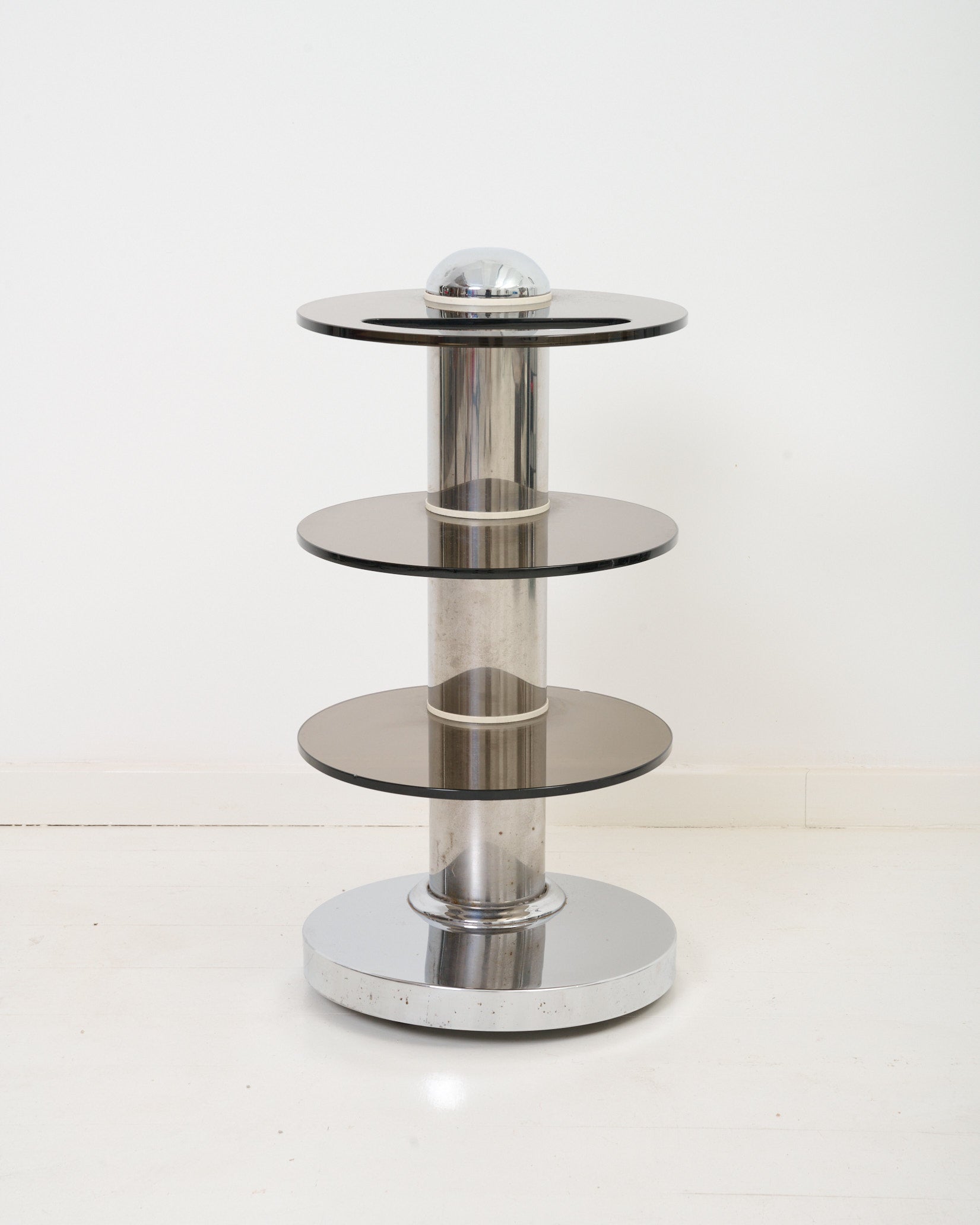 Bout de canapé italien doté de trois plateaux ronds coulissants sur une base en chrome avec roulettes. Space age. Très bel état.