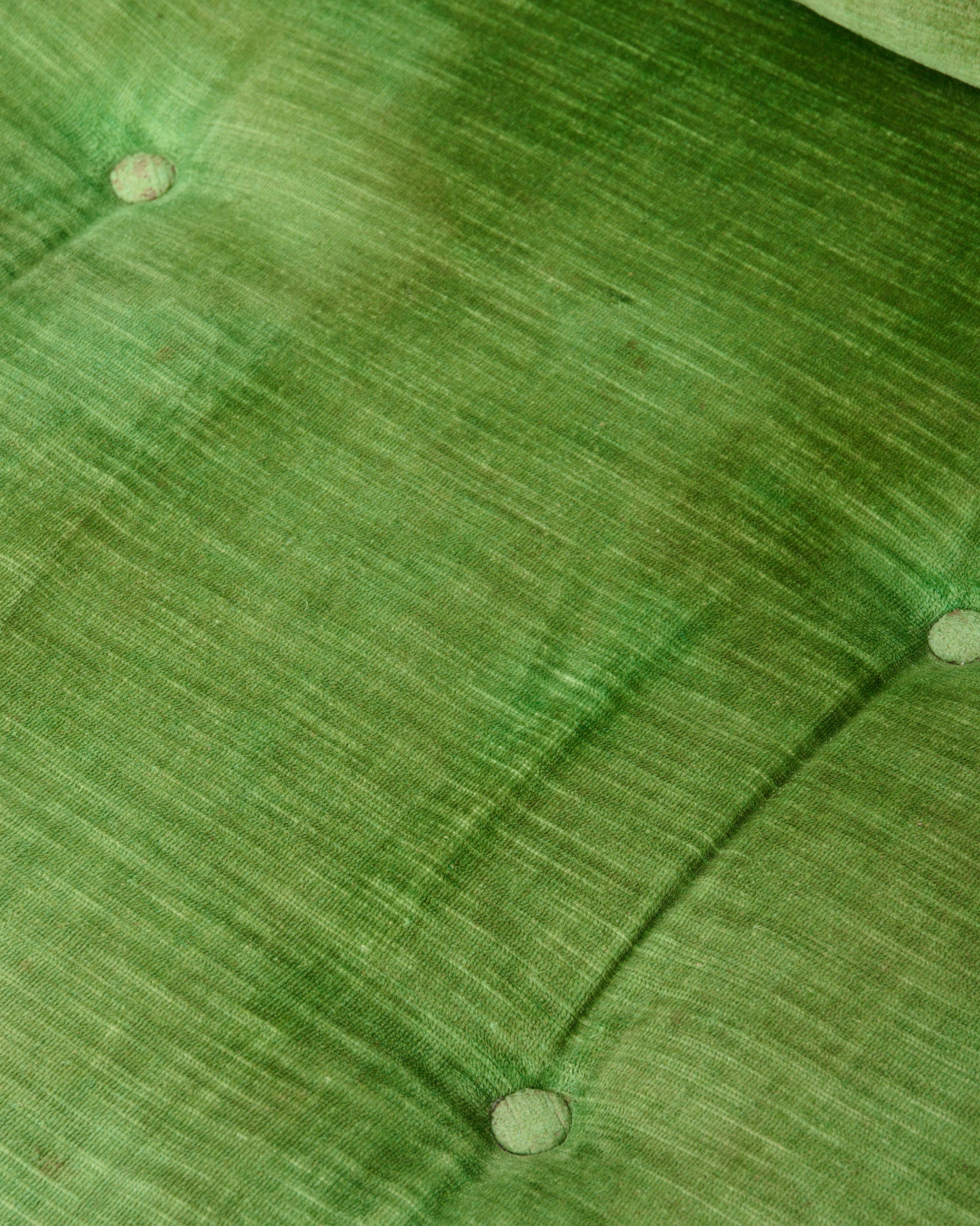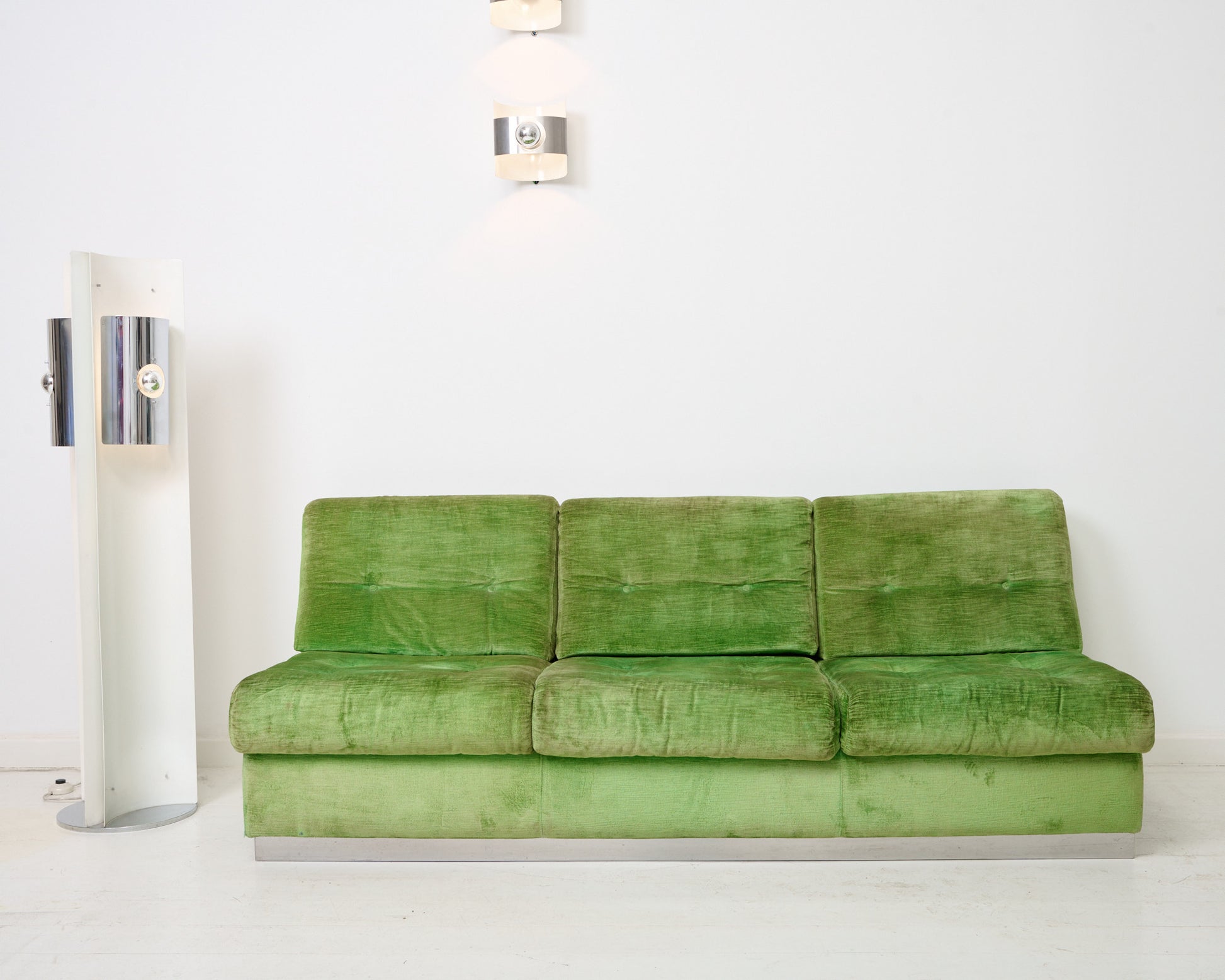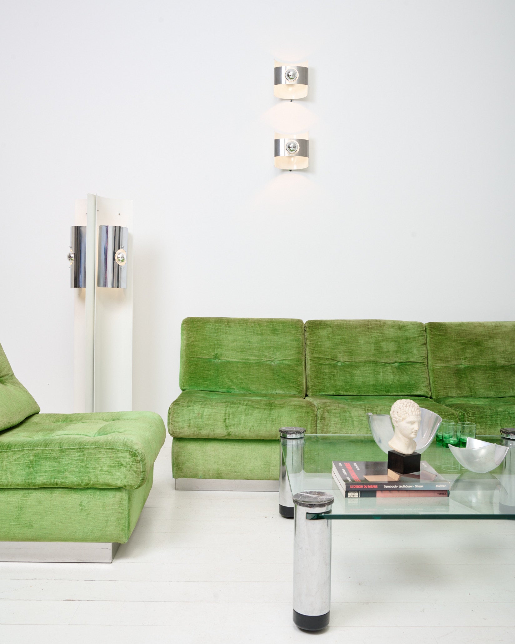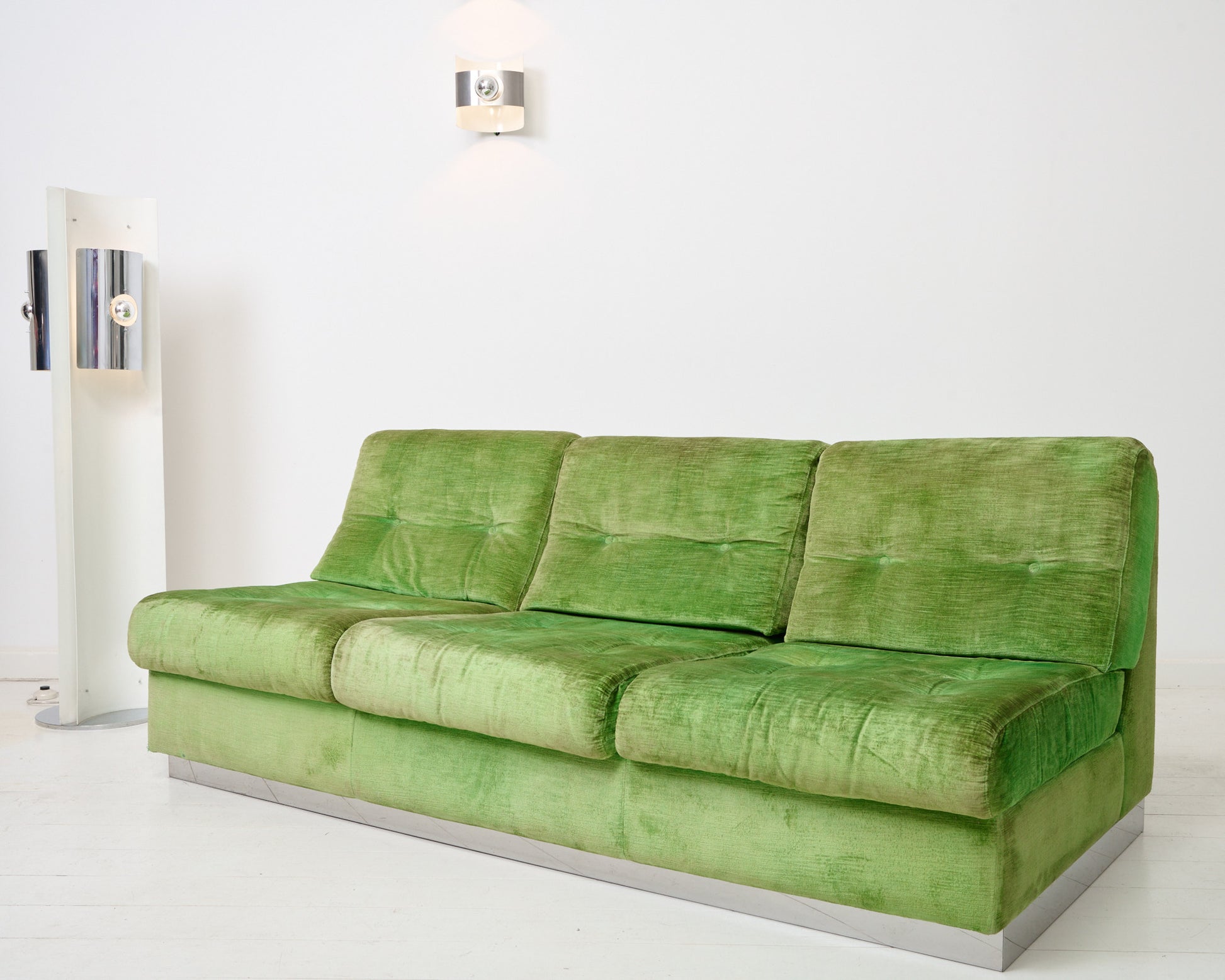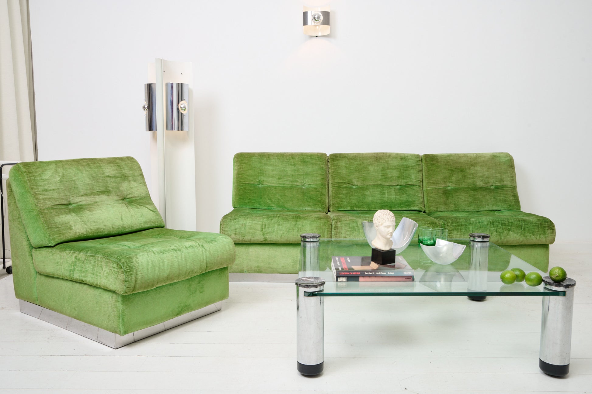 Salon composé d'un canapé trois places et d'un fauteuil en velours vert par Jacques Charpentier pour Roche Bobois, dans les années 70. Base en métal chromé en très bel état. Bel état général malgré quelques traces du temps (tâches et décolorations sur le tissu en velours). Si vous souhaitez retapisser le canapé et le fauteuil, merci de nous contacter à contact@eccho-studio.fr.