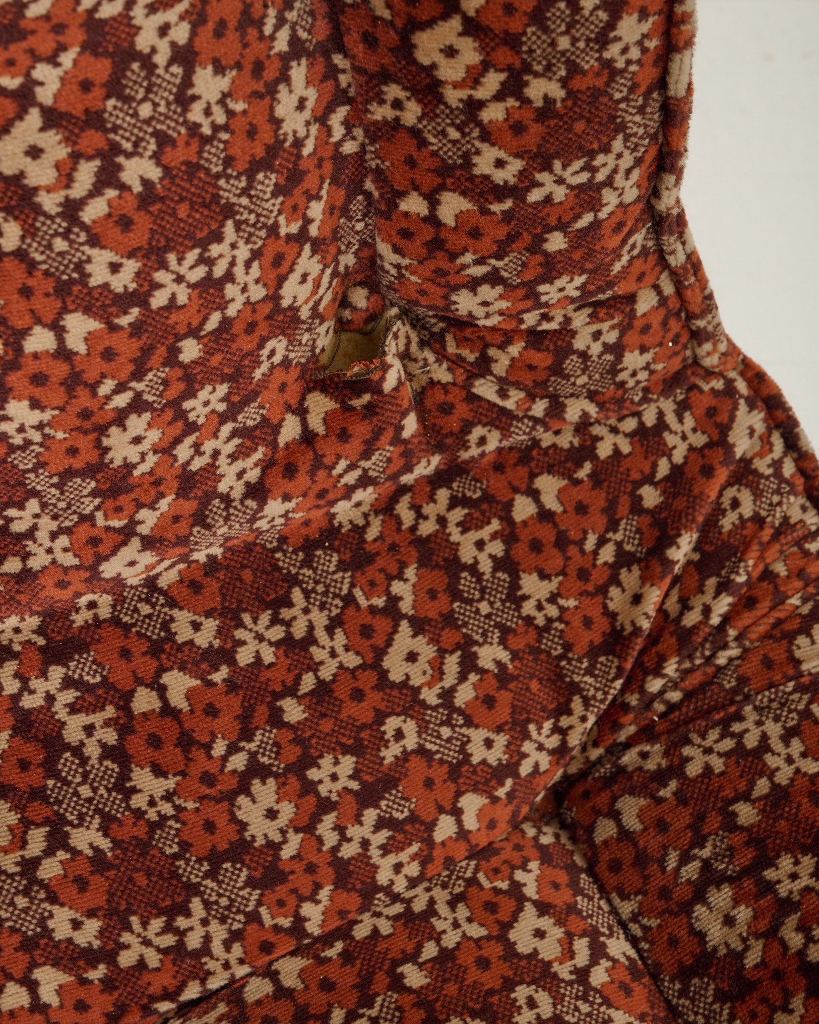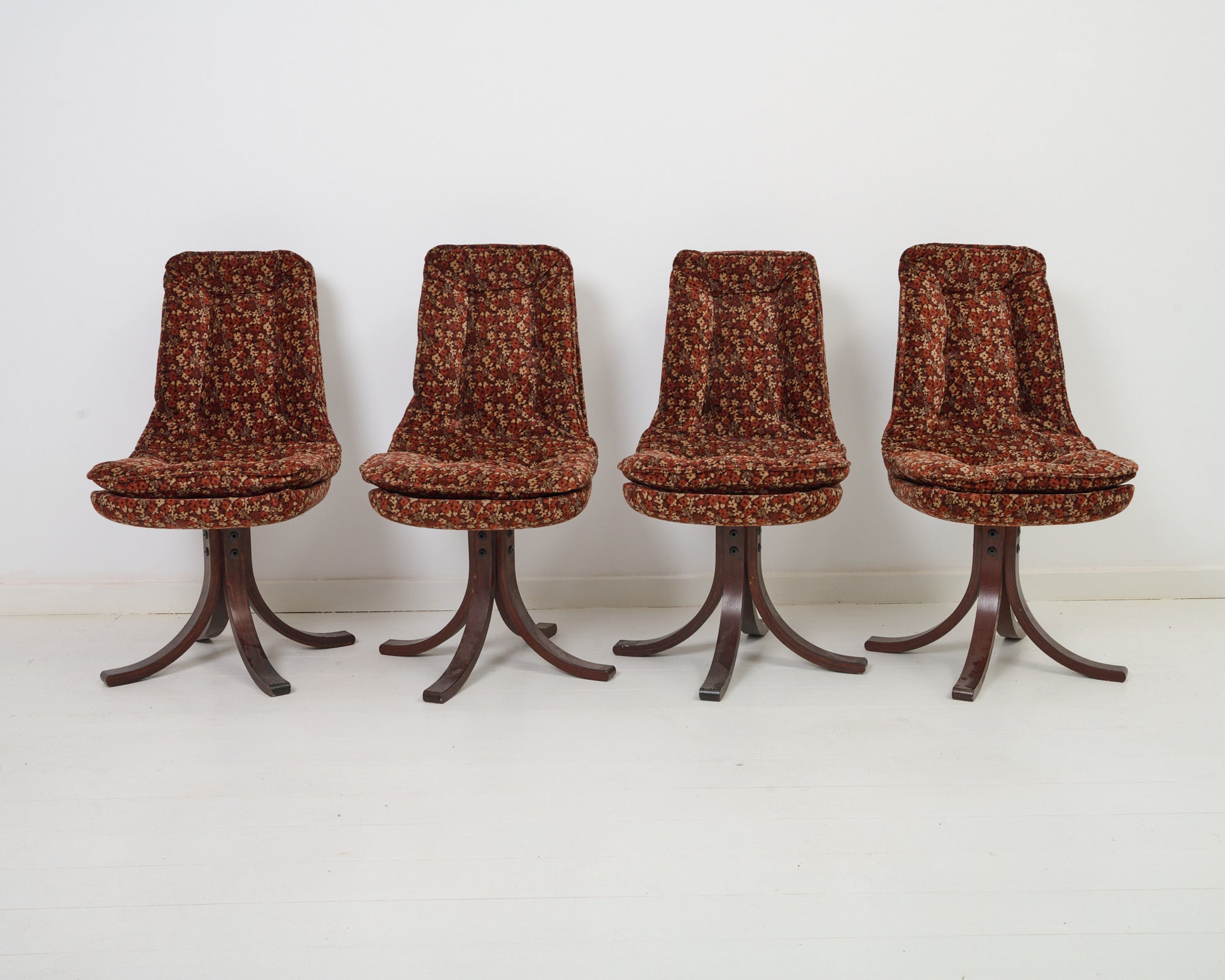 Ensemble de quatre chaises danoises à pietement en bois courbé avec un tissu dev velours fleuri. Bel état malgré un trou à reprendre dans un pli (peu visible - voir photo).