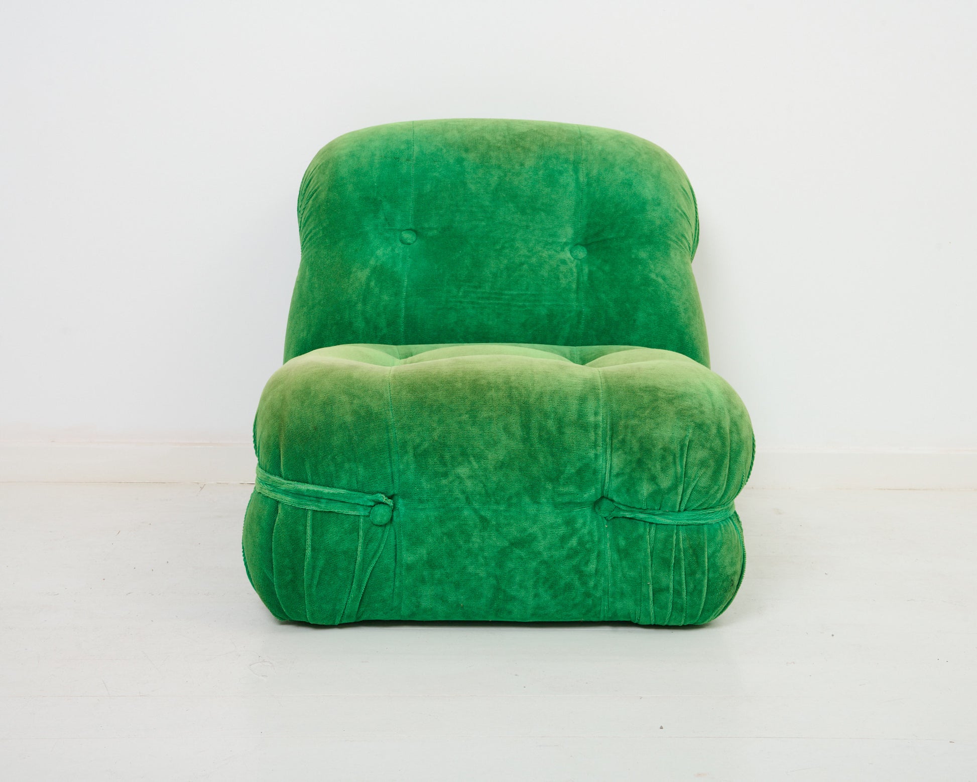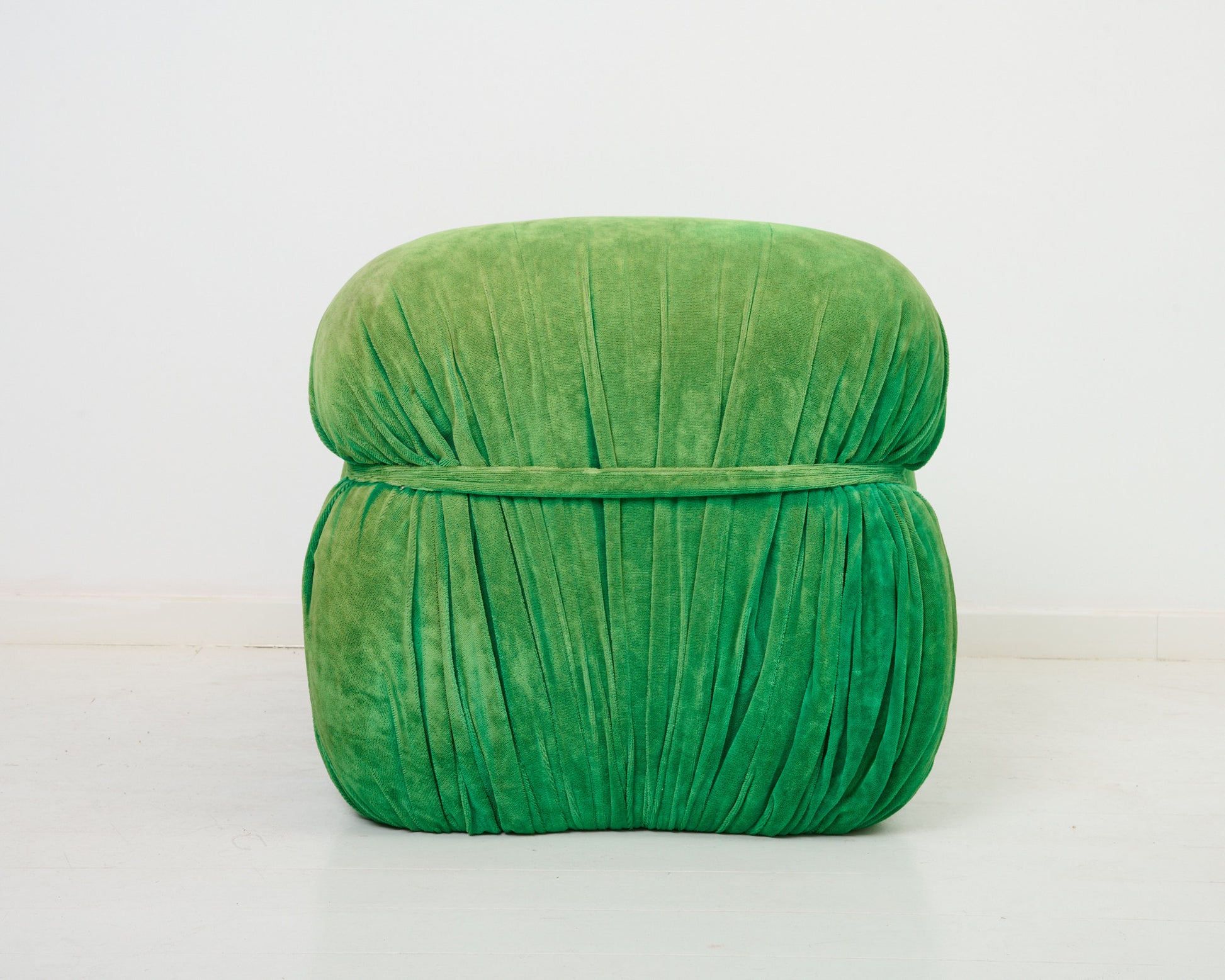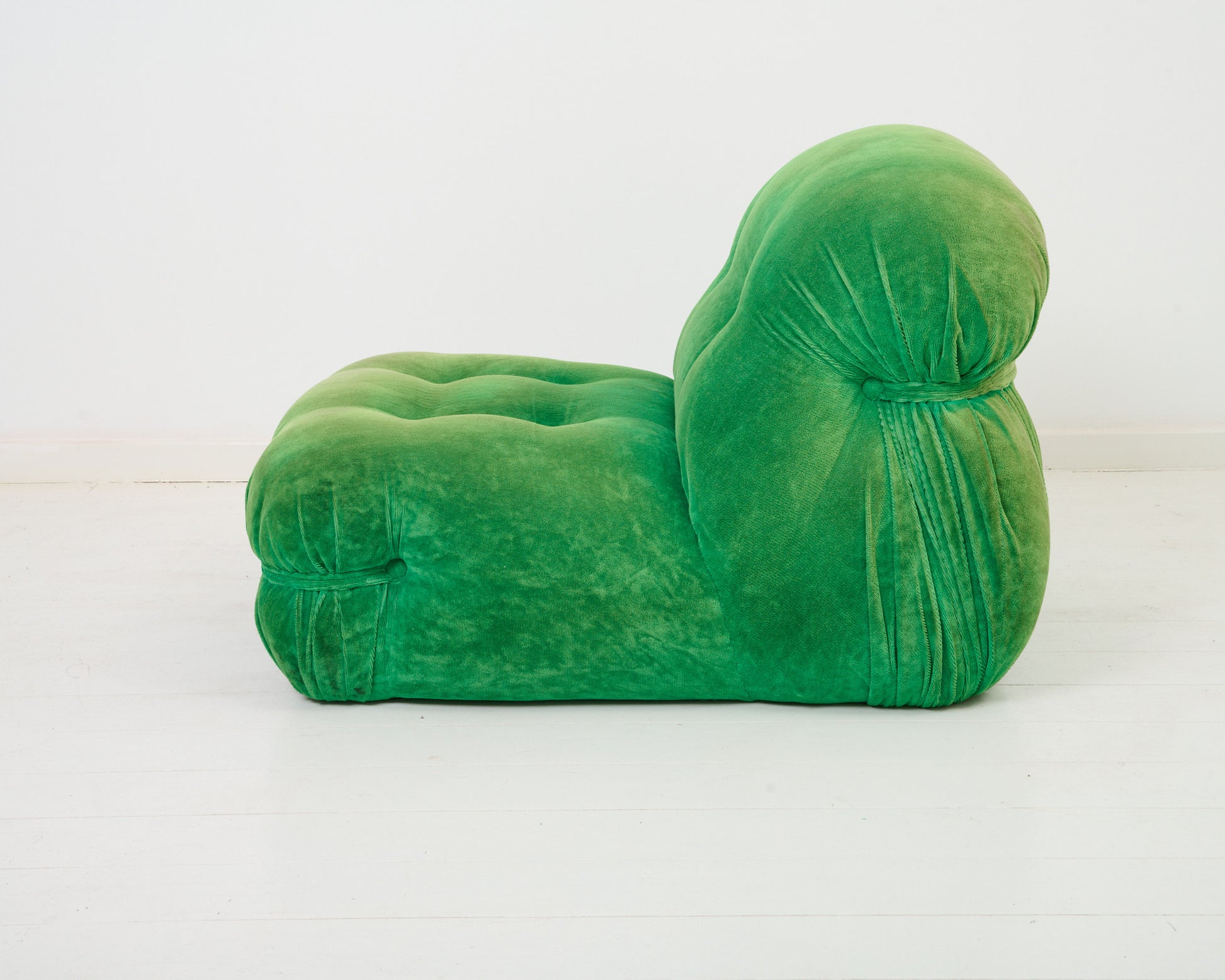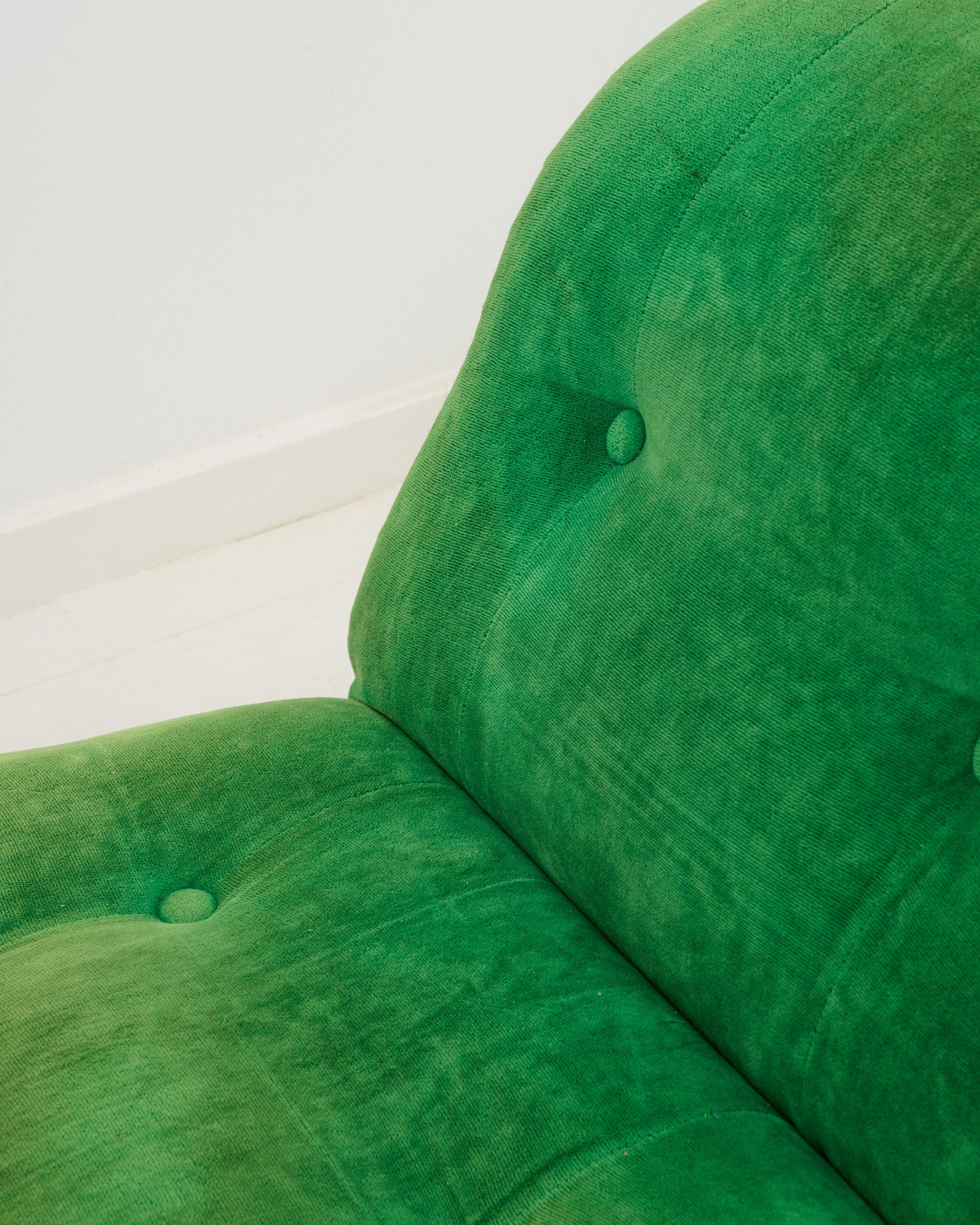 Chauffeuse en tissu de velours vert avec drapé ceinturé dans le dos. Dans le goût du modèle Soriana par Afra et Tobia Scarpa. Très bel état malgré la couleur qui a légèrement déteint et un raccord sur un des fauteuils. Deux disponibles.