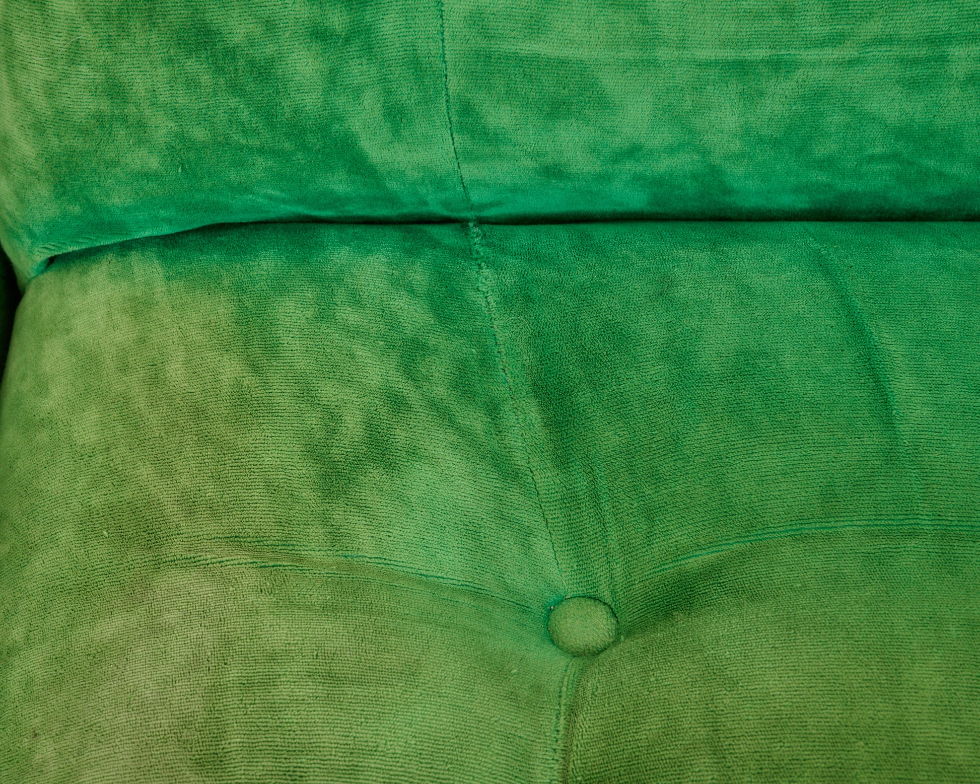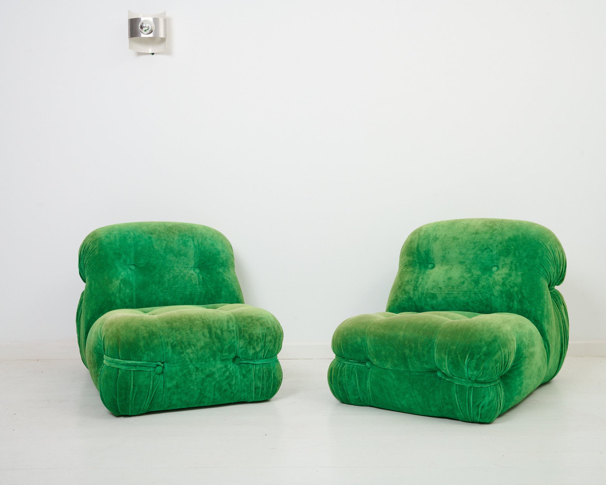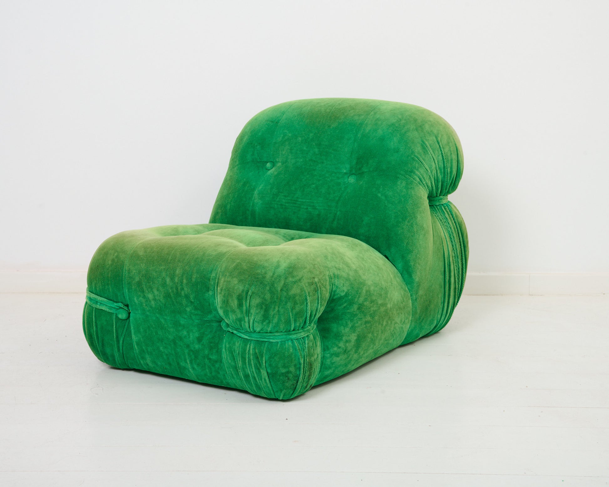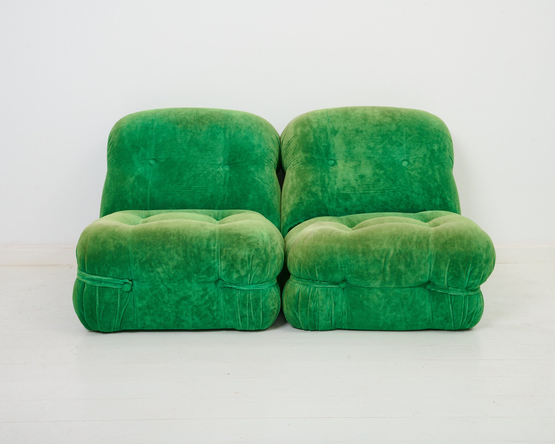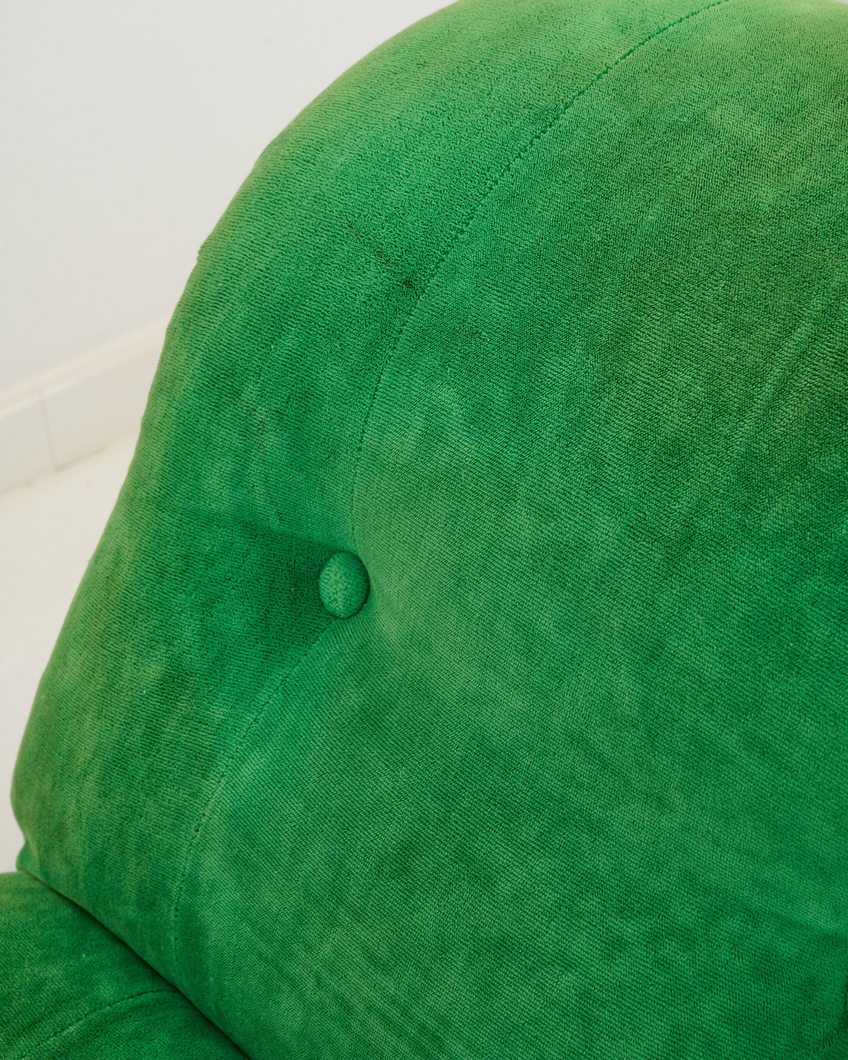 Chauffeuse en tissu de velours vert avec drapé ceinturé dans le dos. Dans le goût du modèle Soriana par Afra et Tobia Scarpa. Très bel état malgré la couleur qui a légèrement déteint et un raccord sur un des fauteuils. Deux disponibles.