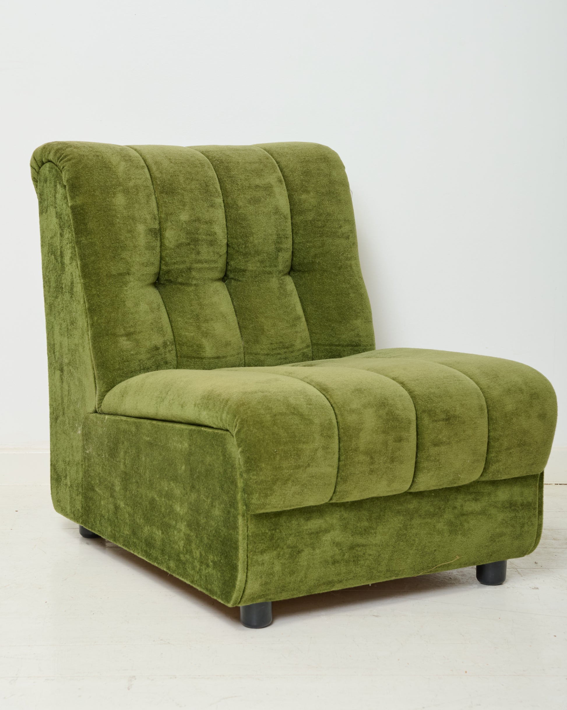 Chauffeuse en velours vert ou canapé modulable, 1970s. Chaque module présente des formes généreuses, de style bubble, avec un canapé modulable dôté de formes généreuses. Six modules sont disponibles. Vente de préférence pour quatre modules minimum. Très bel état sans tâches ni déchirure.