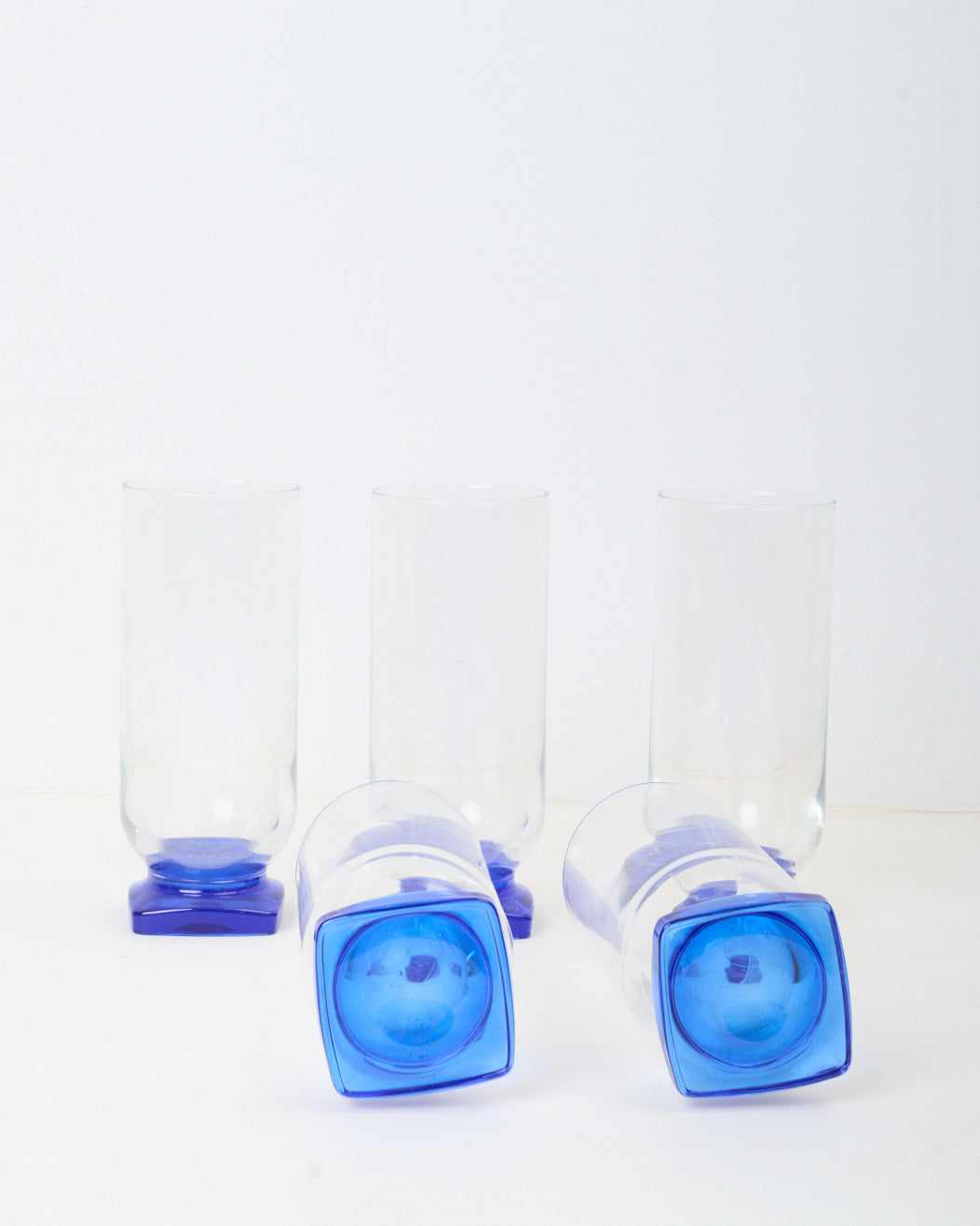 Cinq verres à eau dont les pieds sont carrés et bleus. Modele "Ibisco" par Bormioli Rocco. Très bel état.