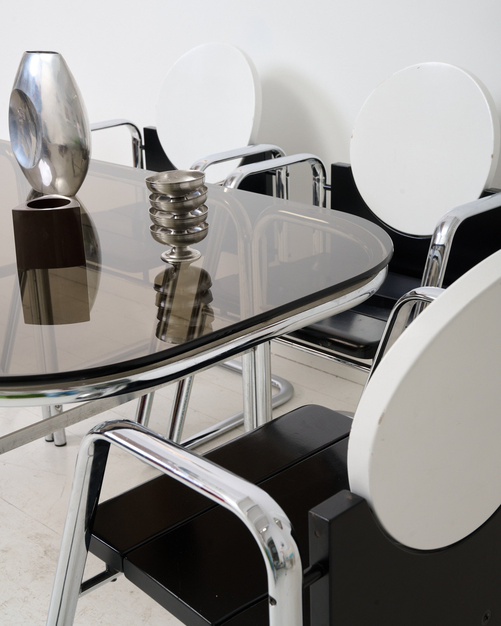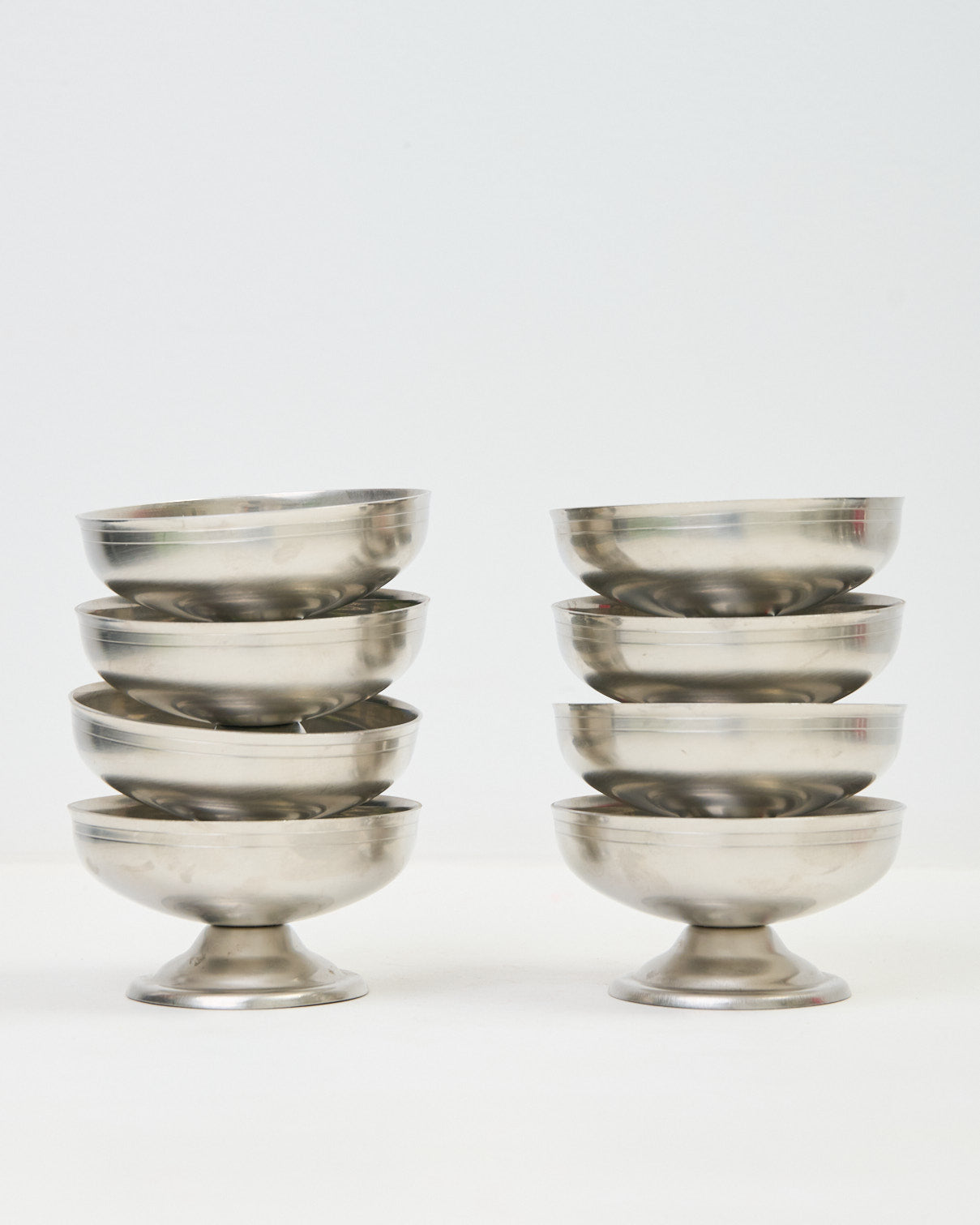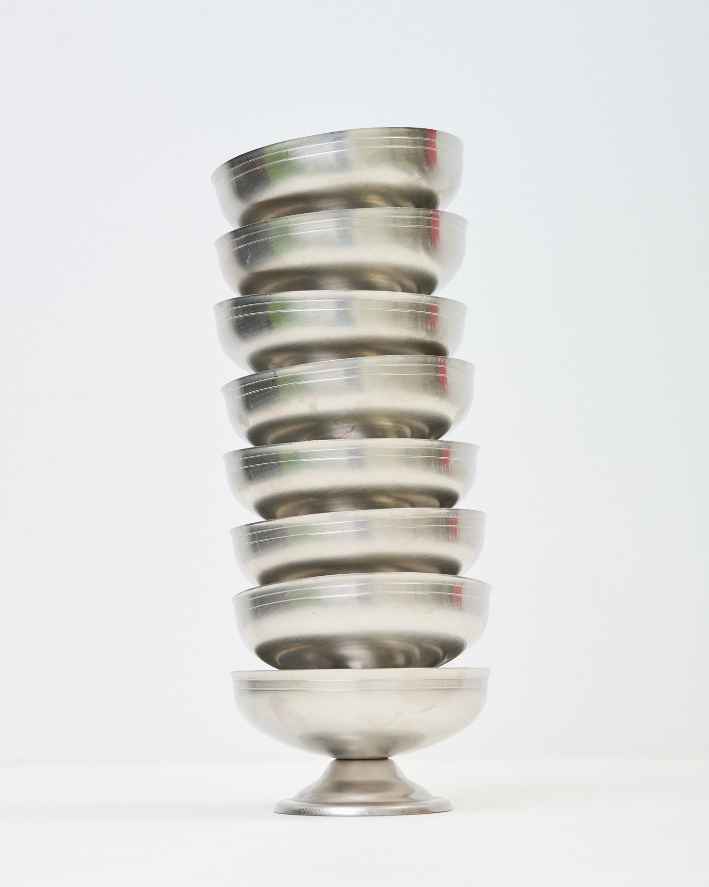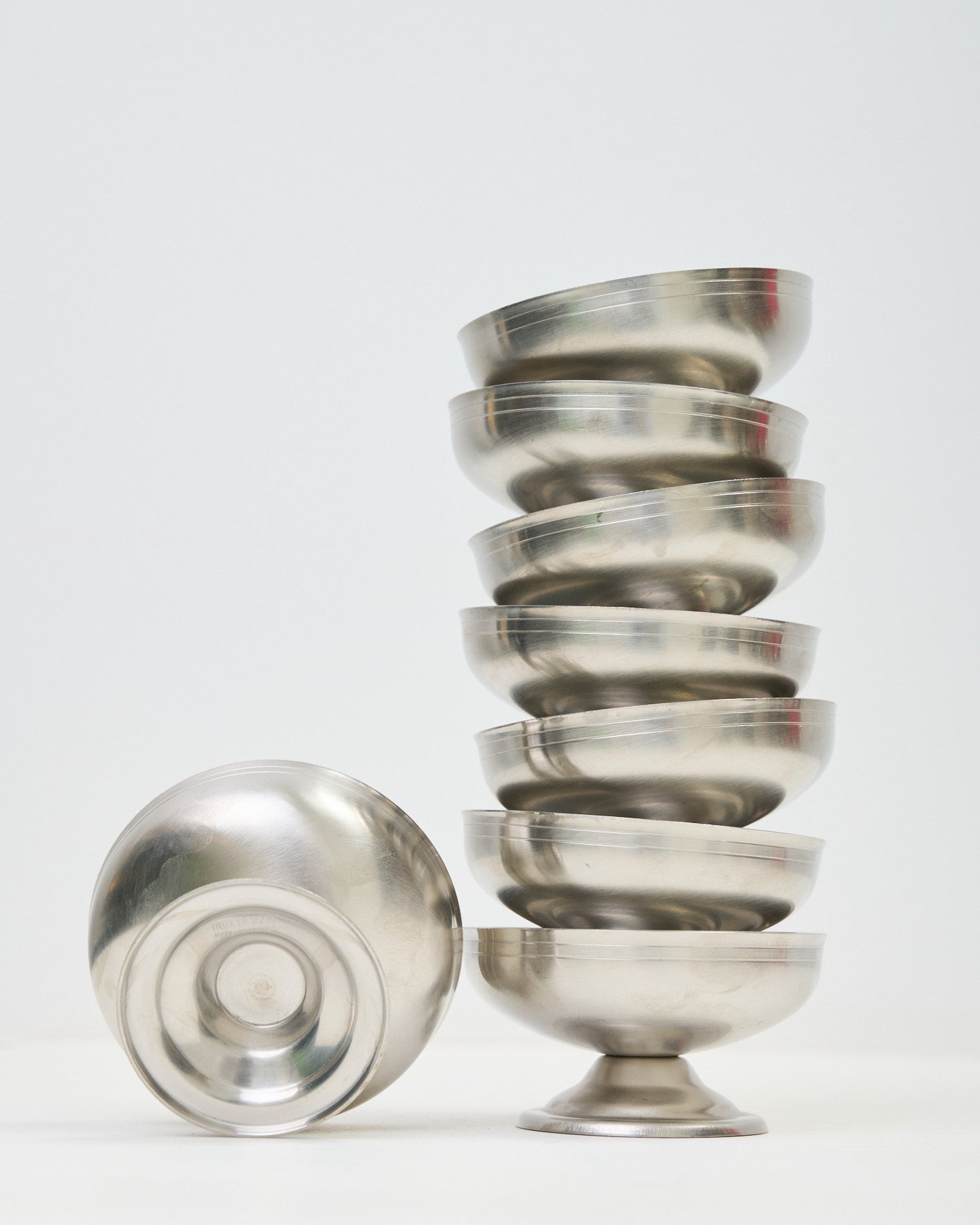 Quatre coupes à dessert gravés, forme tulipe, Rémy Letang. Finition rare en inox brossé.Très bel état. Deux lots de quatre disponibles, soit huit au total.