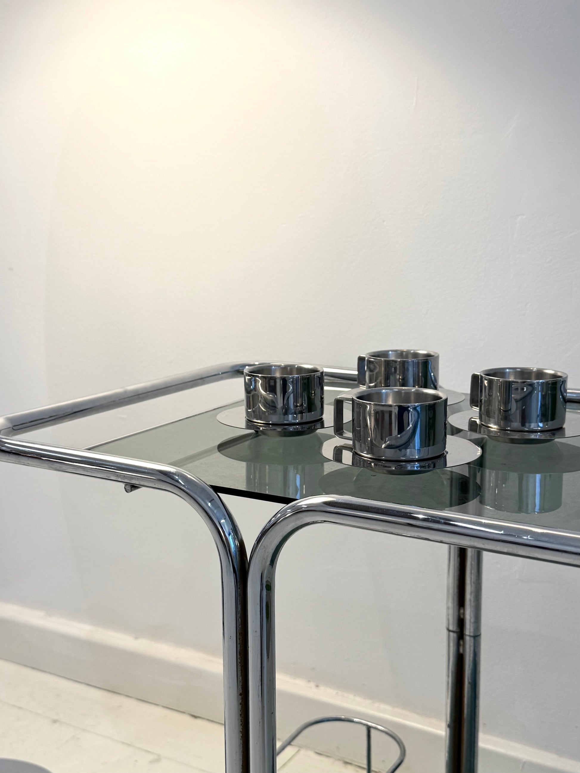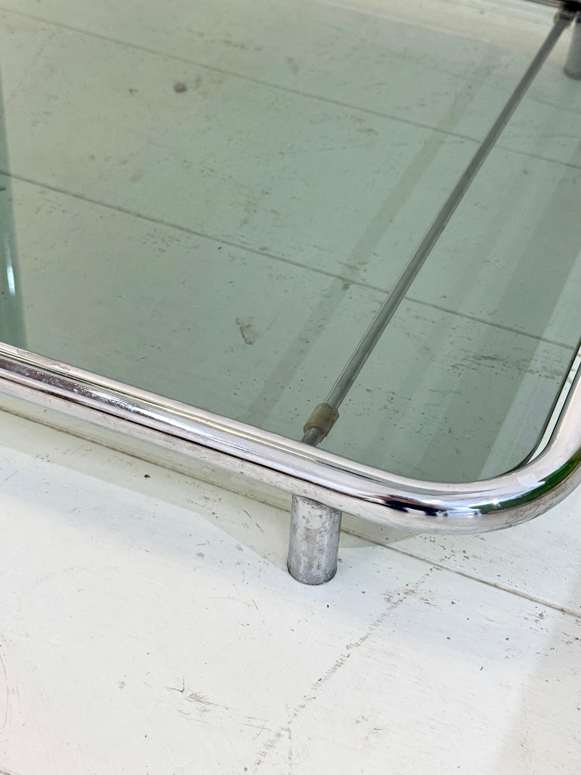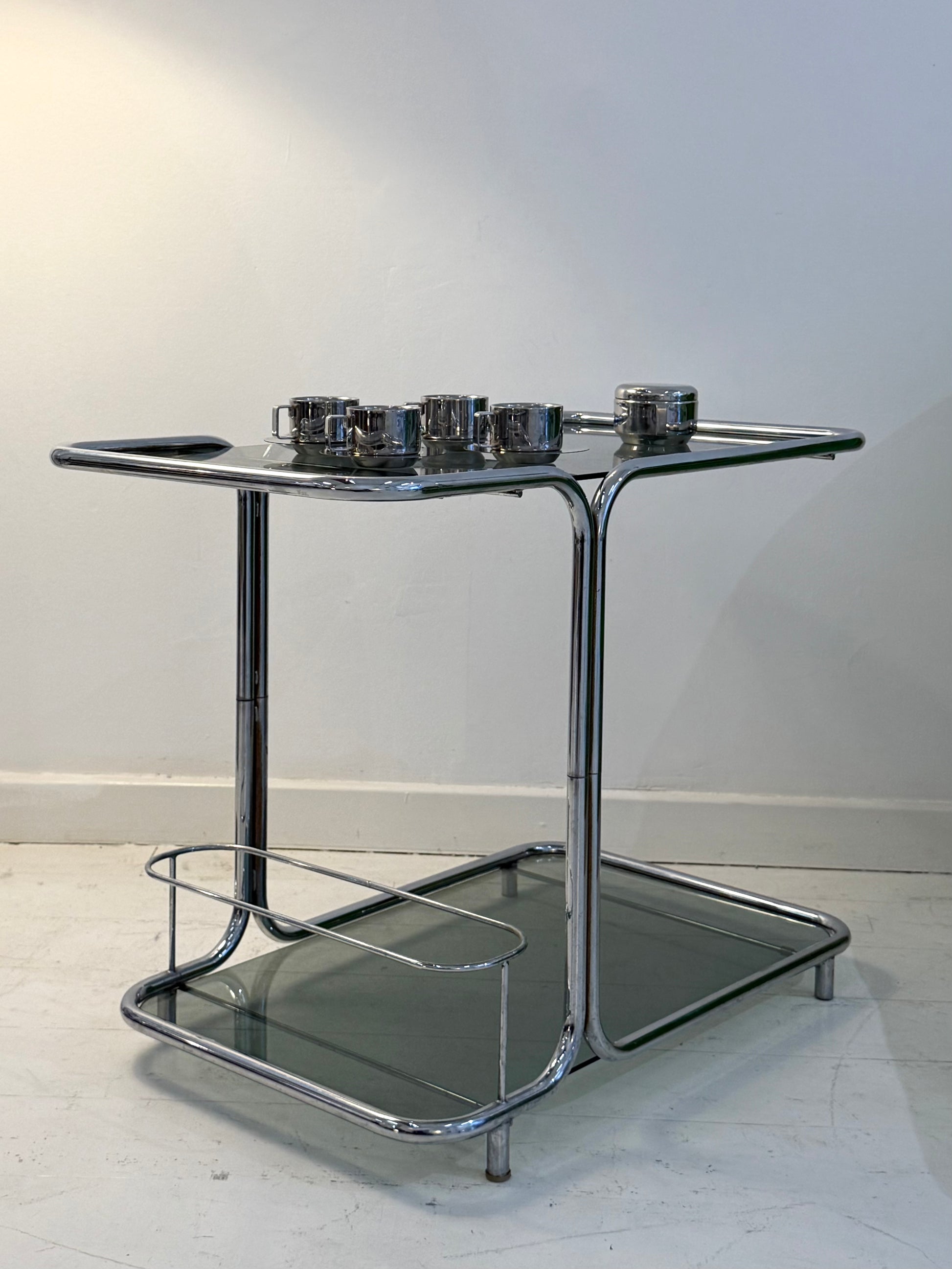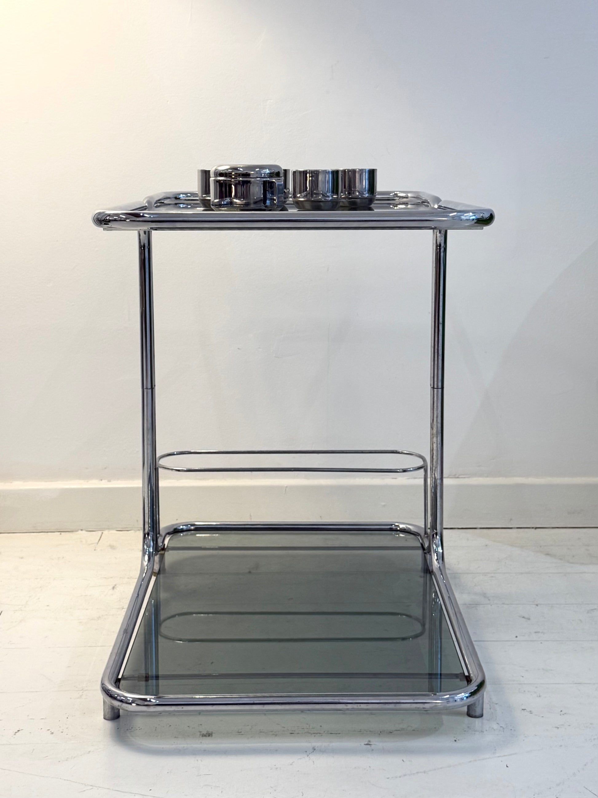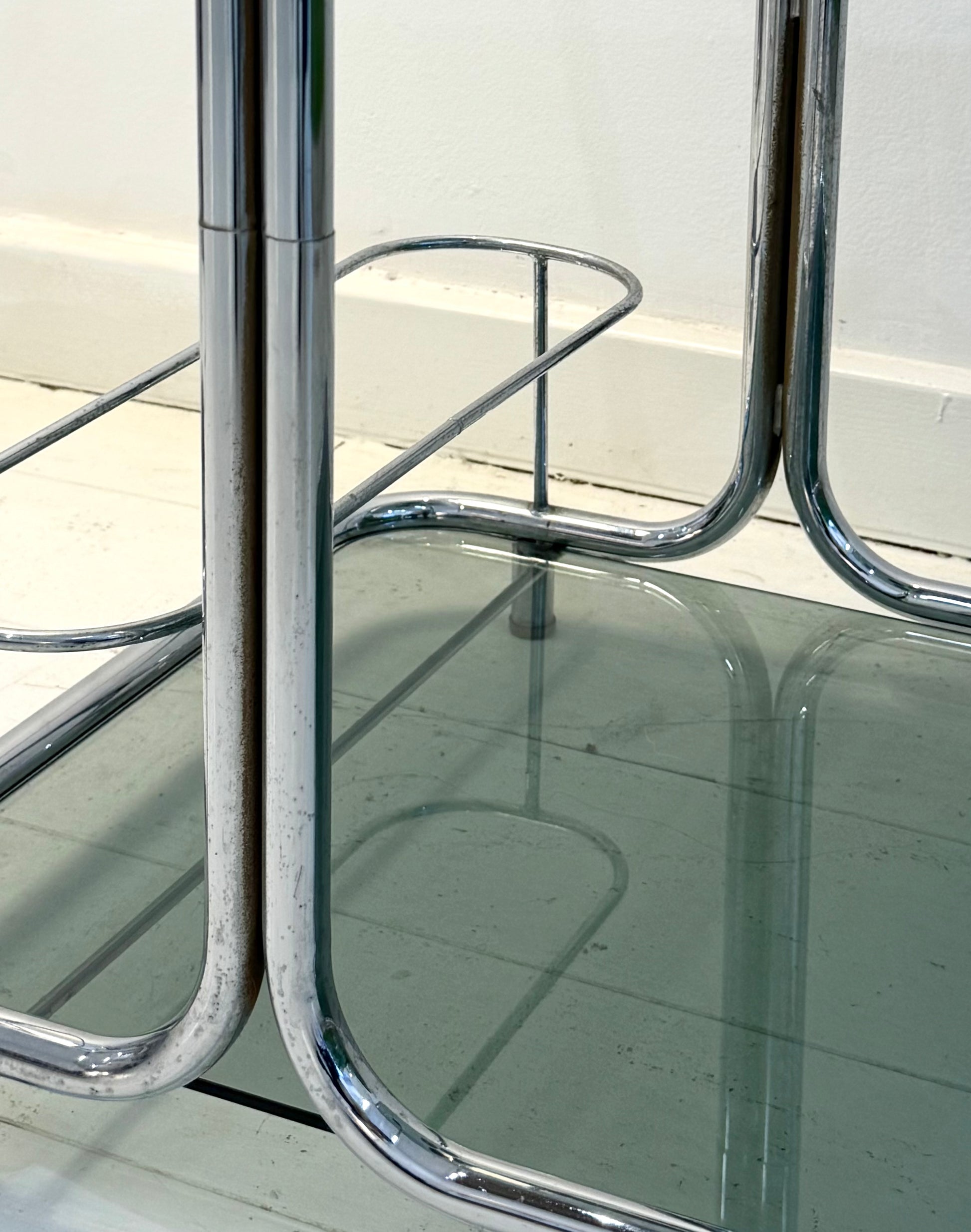 Desserte ou meuble de rangement en métal chromé tubulaire des années 1970 avec verre fumé. Très bel état malgré quelques traces du temps (traces de rouilles sur l'intérieur des tubes chromés).