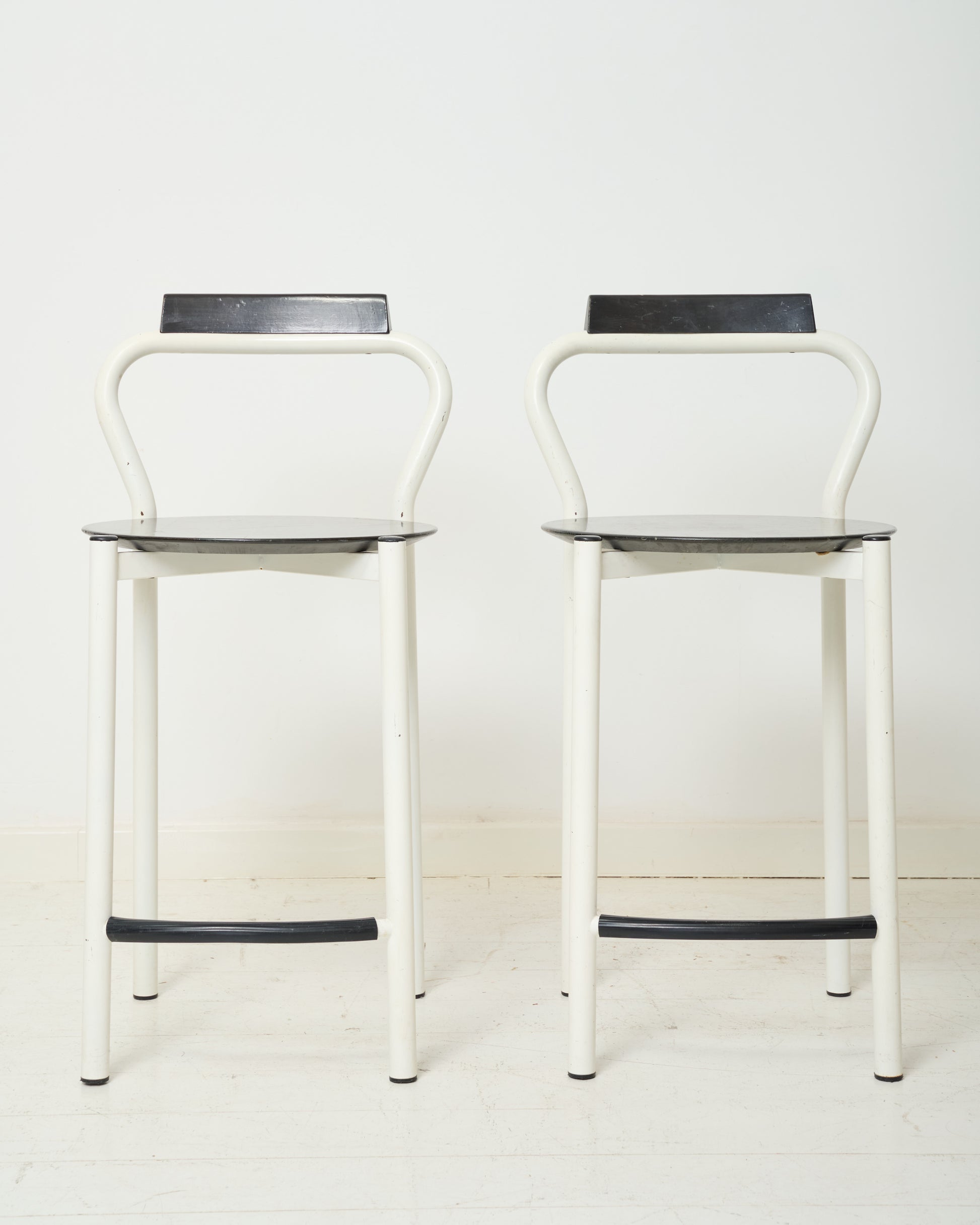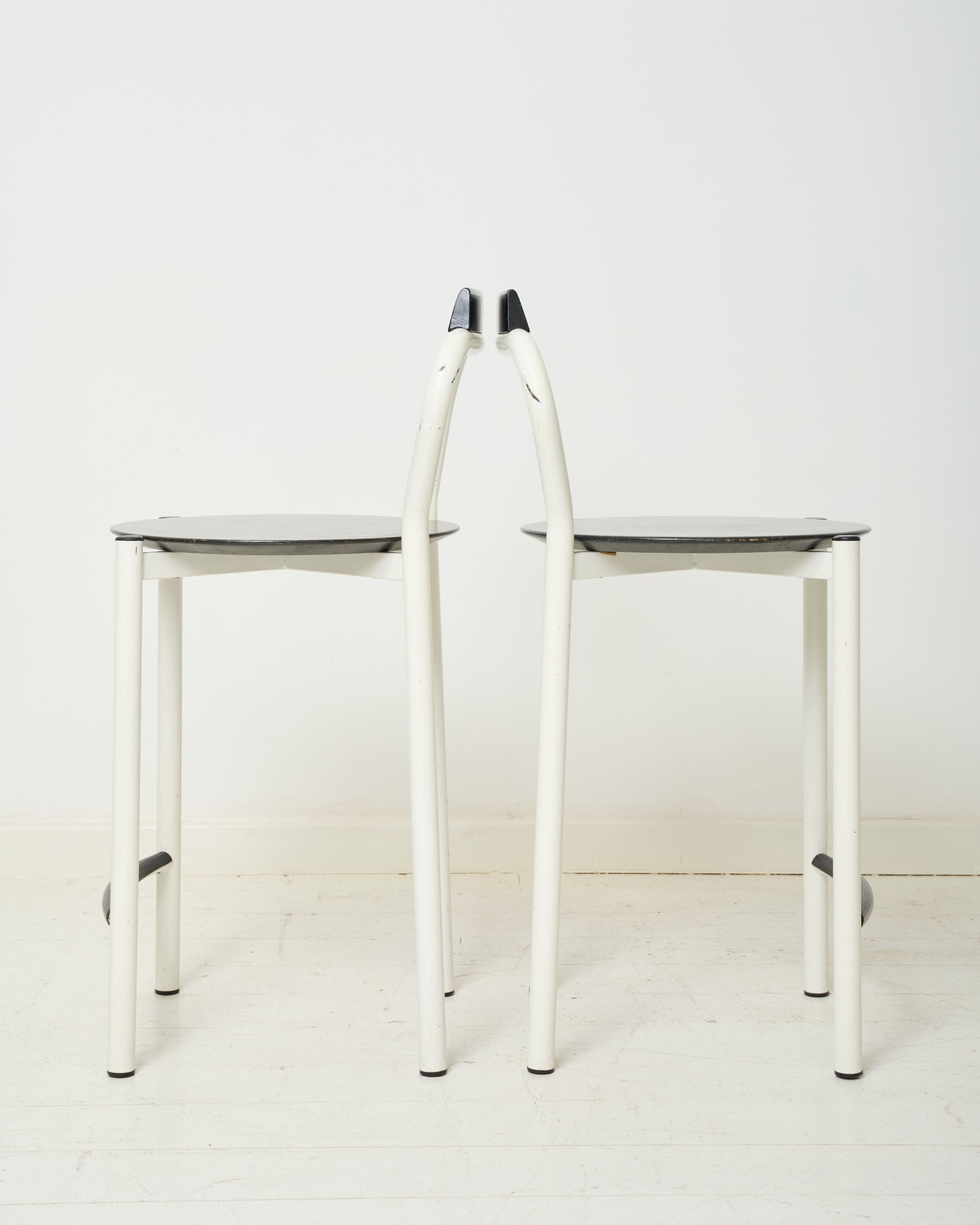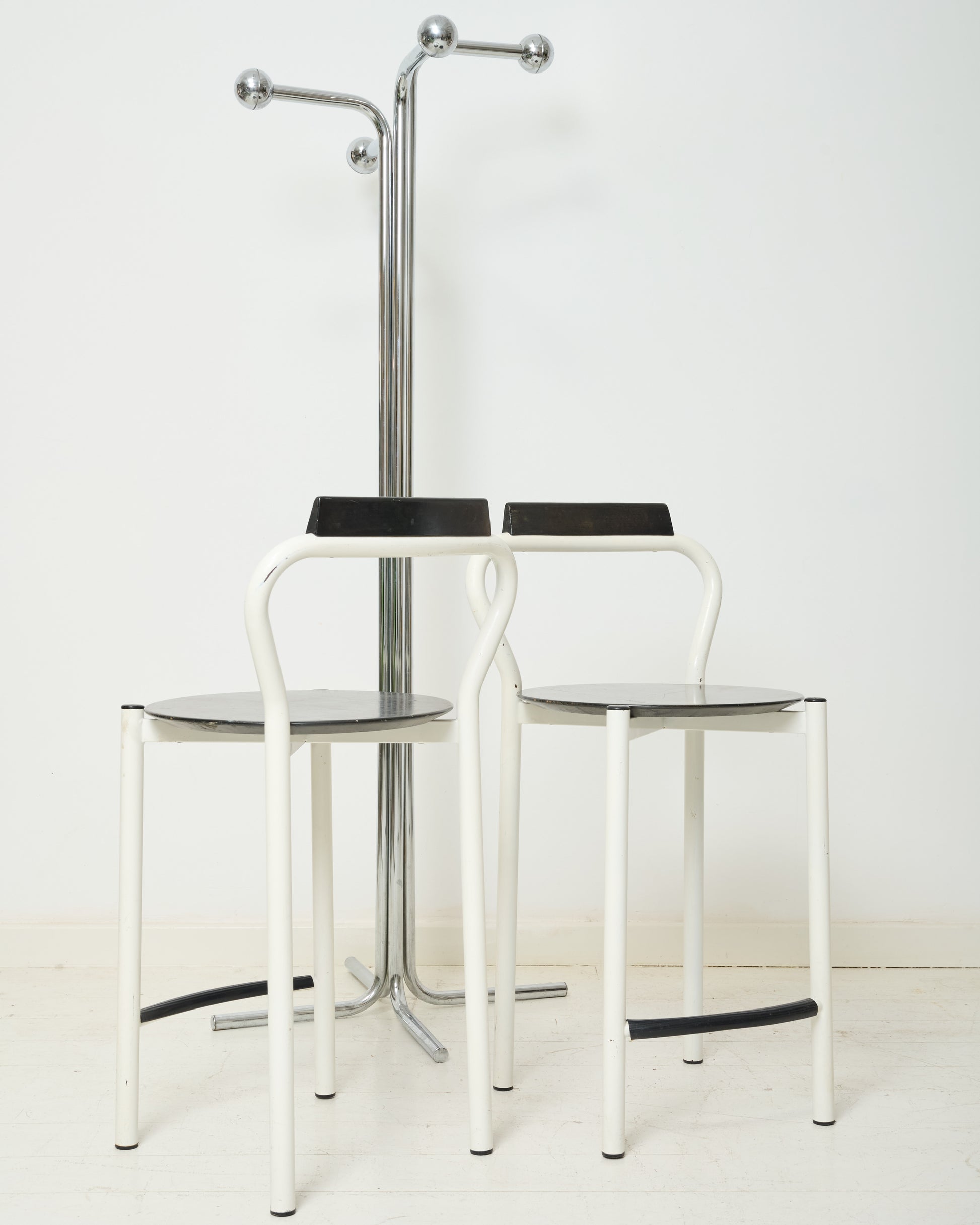 Duo de chaises hautes post-moderne, 1980s. Très bel état malgré quelques traces du temps : légers manques sur la partie en métal blanc.