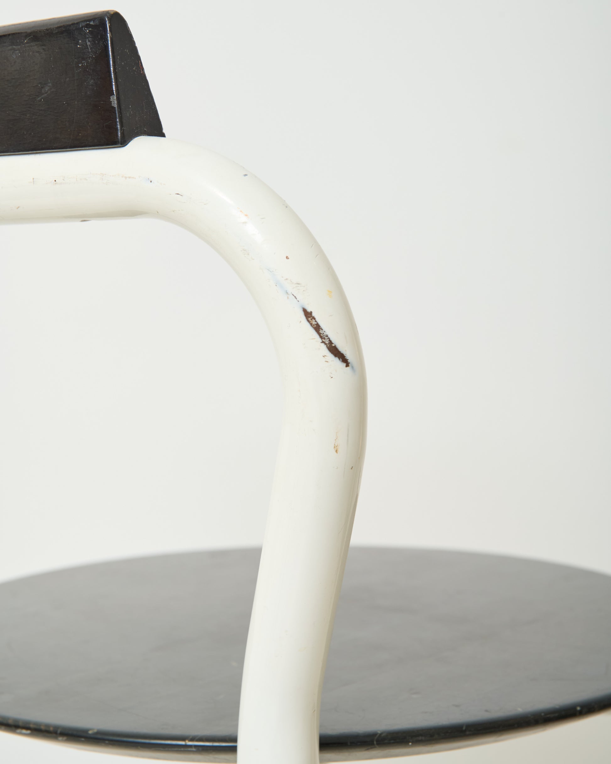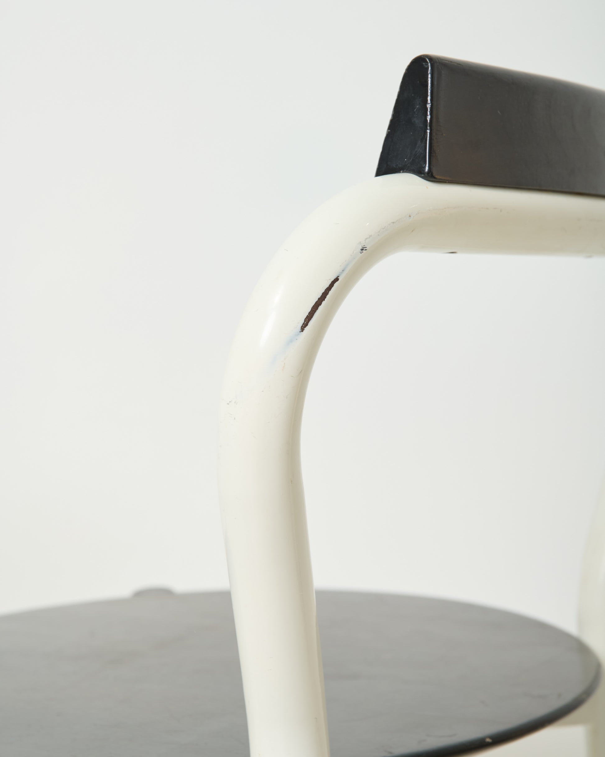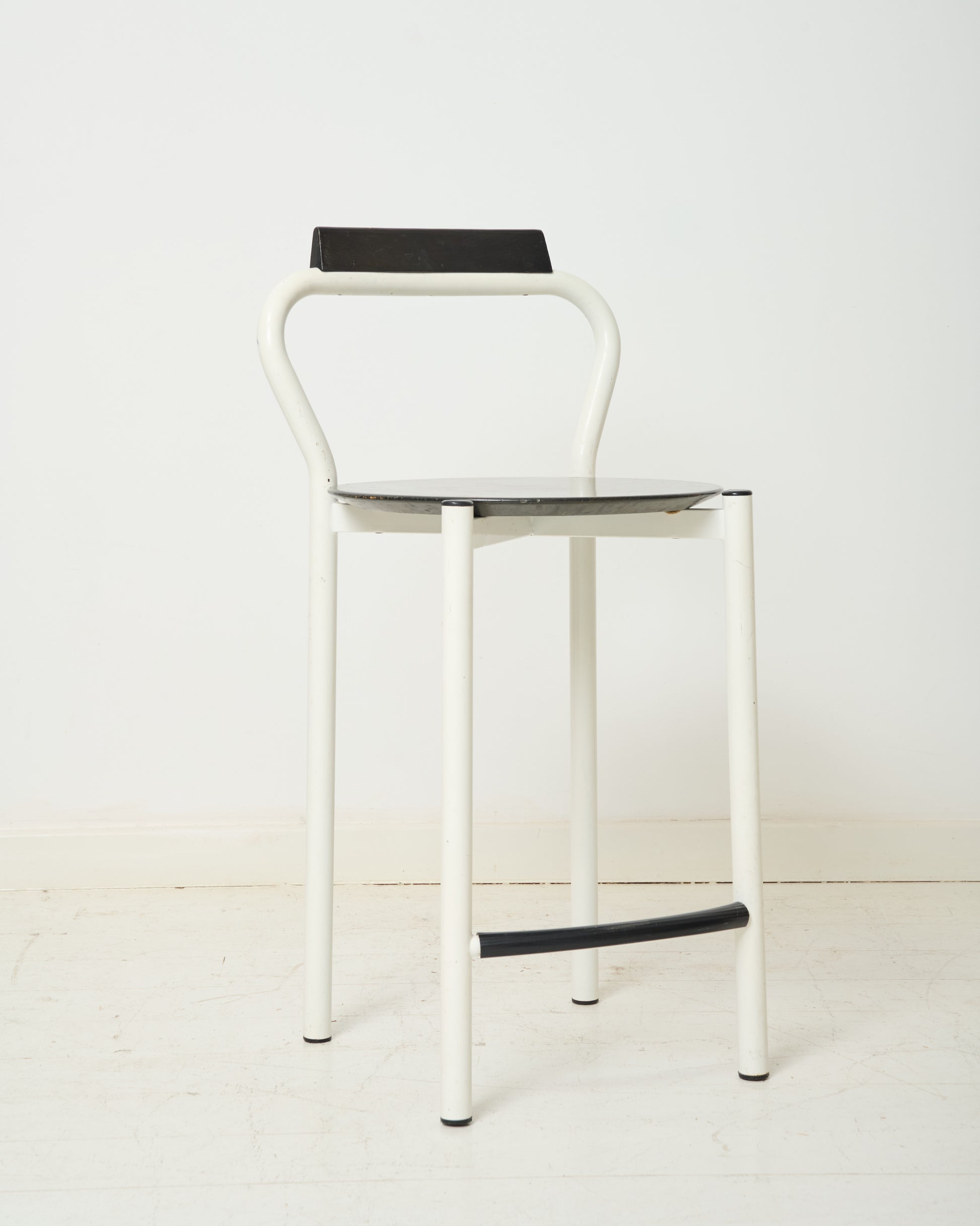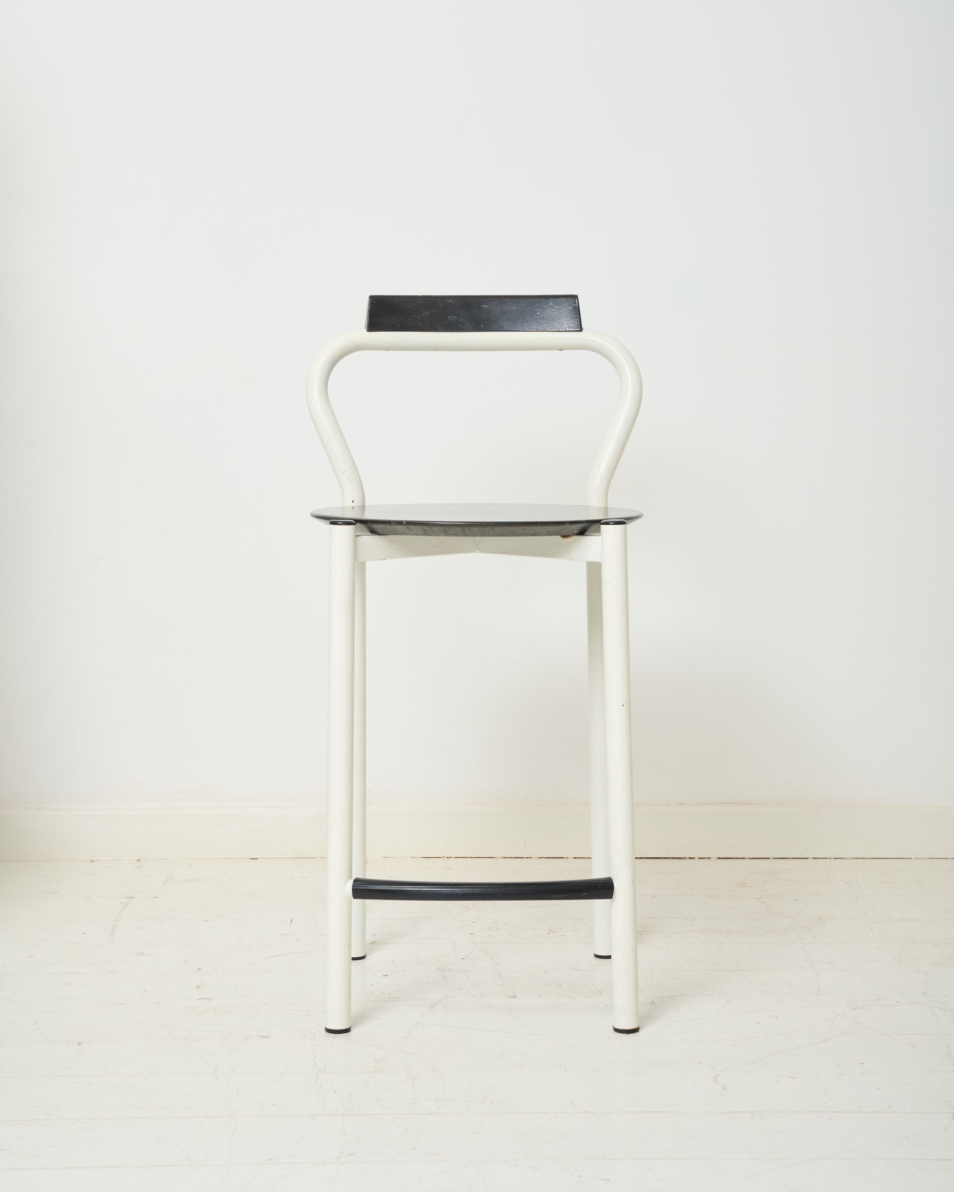 Duo de chaises hautes post-moderne, 1980s. Très bel état malgré quelques traces du temps : légers manques sur la partie en métal blanc.