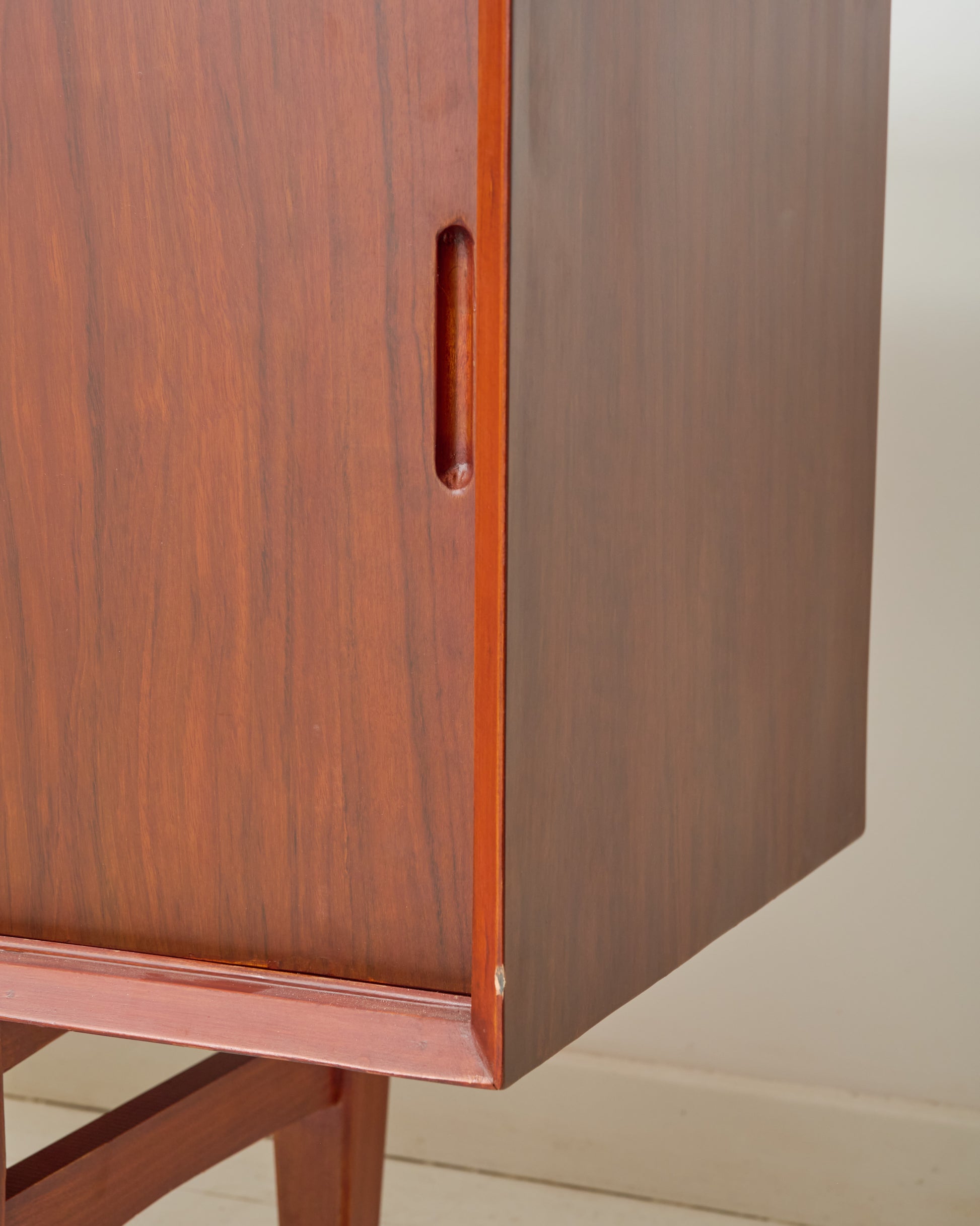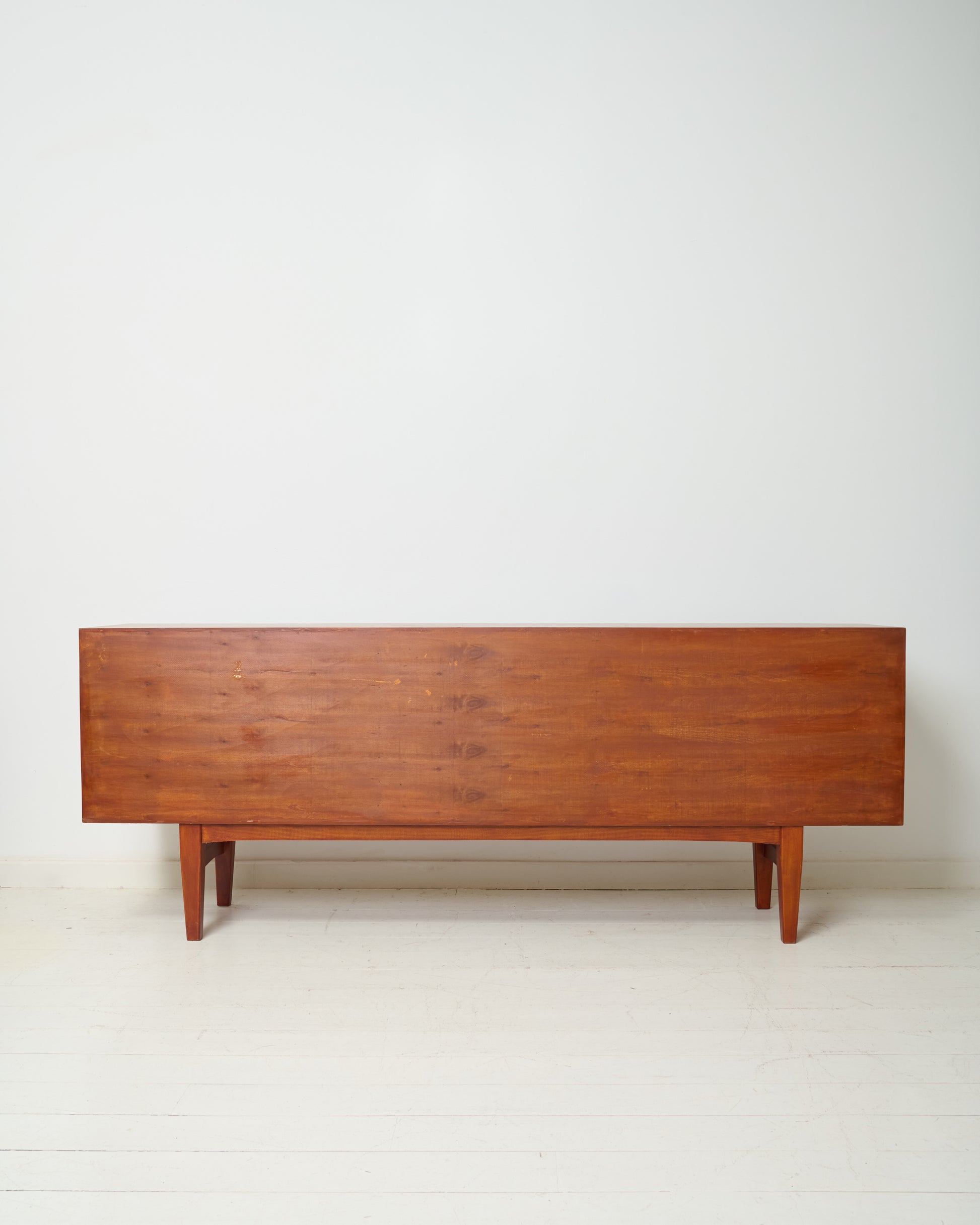 Enfilade scandinave en teck des années 60. Comprend quatre tiroirs et deux portes coulissantes, derrière lesquelles se trouvent des étagères. Entièrement rénovée, très bel état, un très léger manque de face en bas à droite (voir photo).