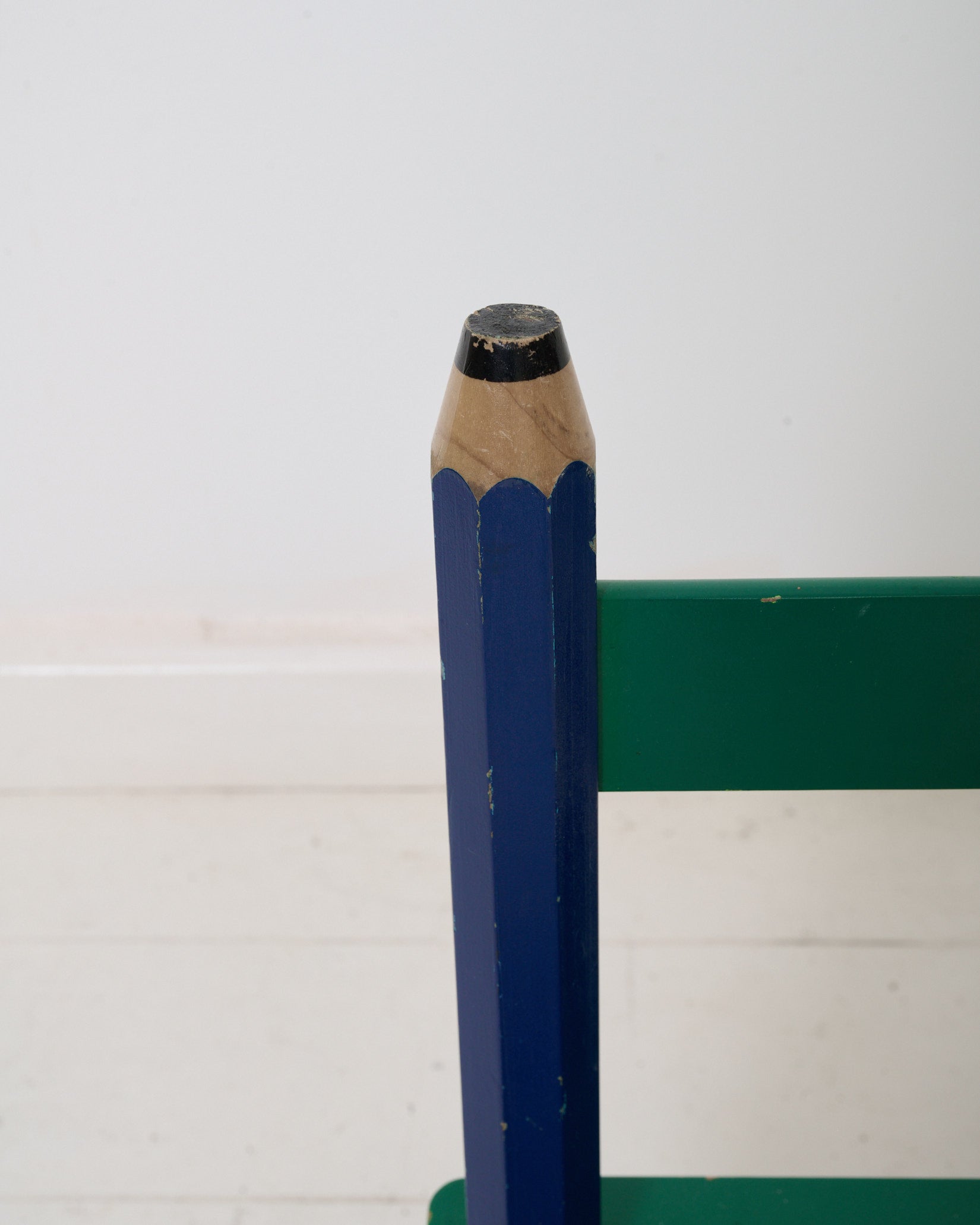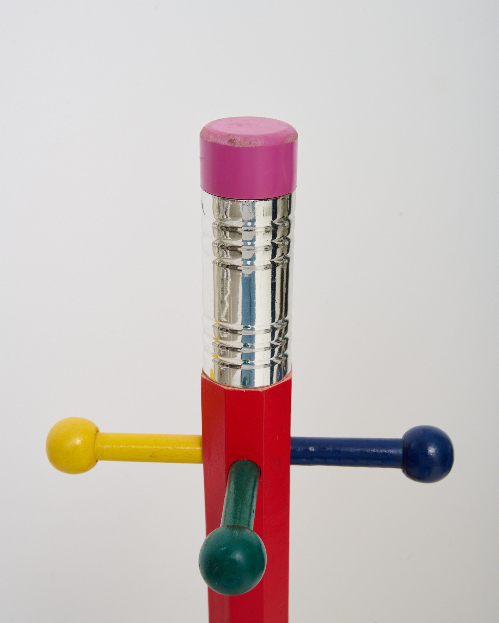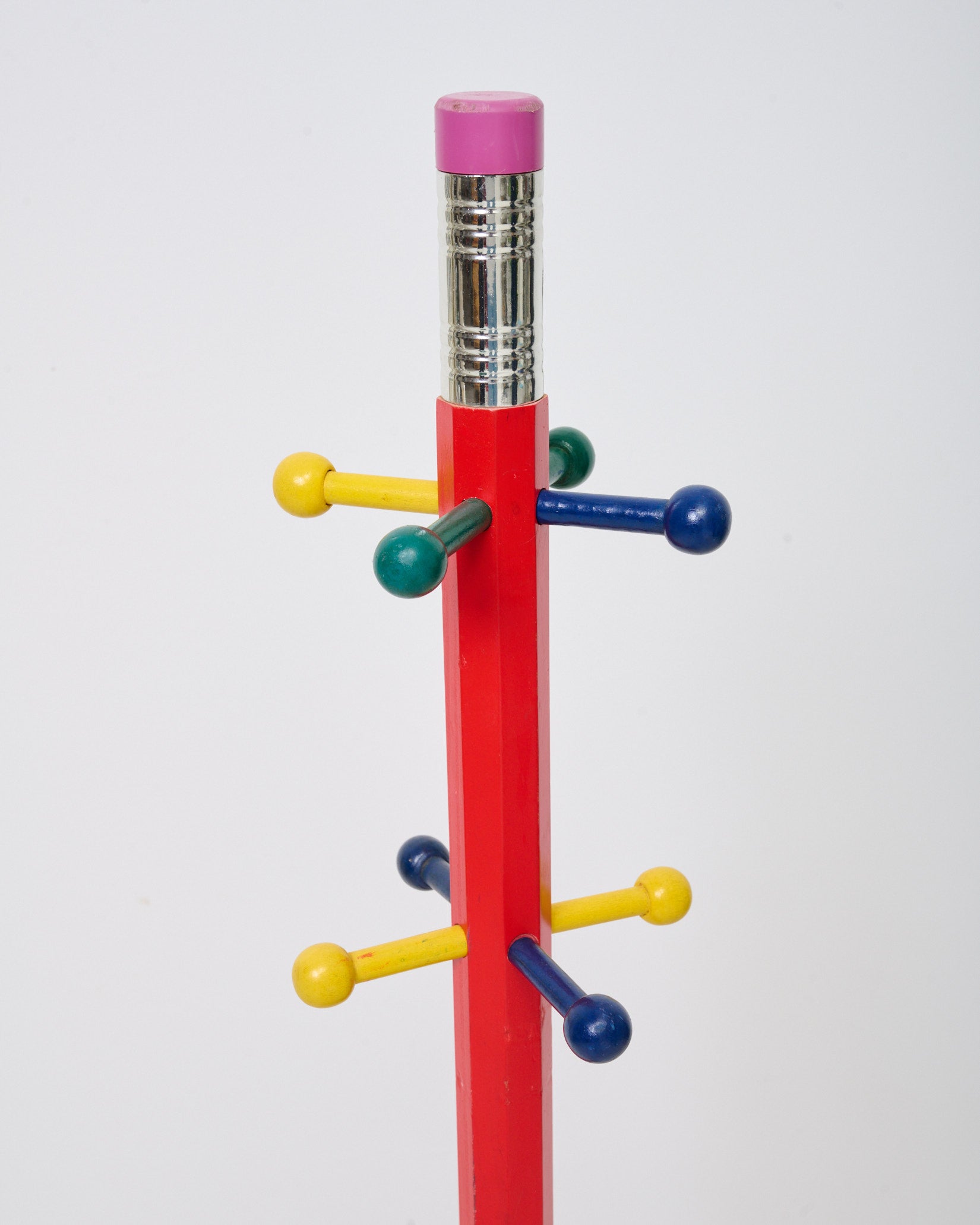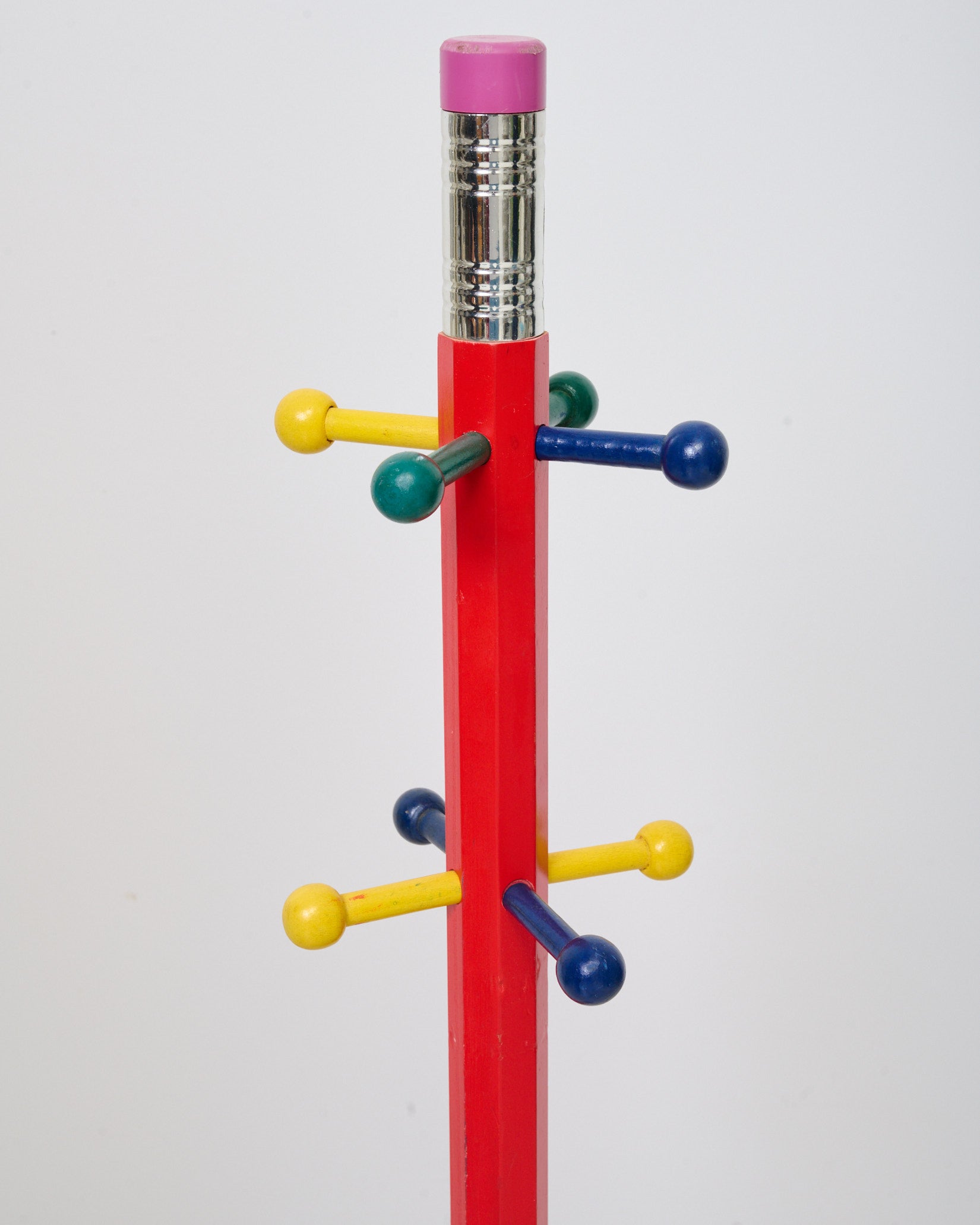 Ensemble rare et original de meubles pour enfant des années 80, par Pierre Sala. La chaise crayon et le porte manteaux crayon aux couleurs Memphis.