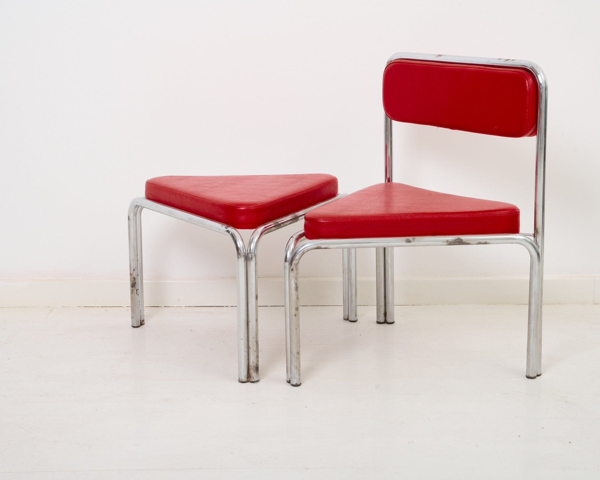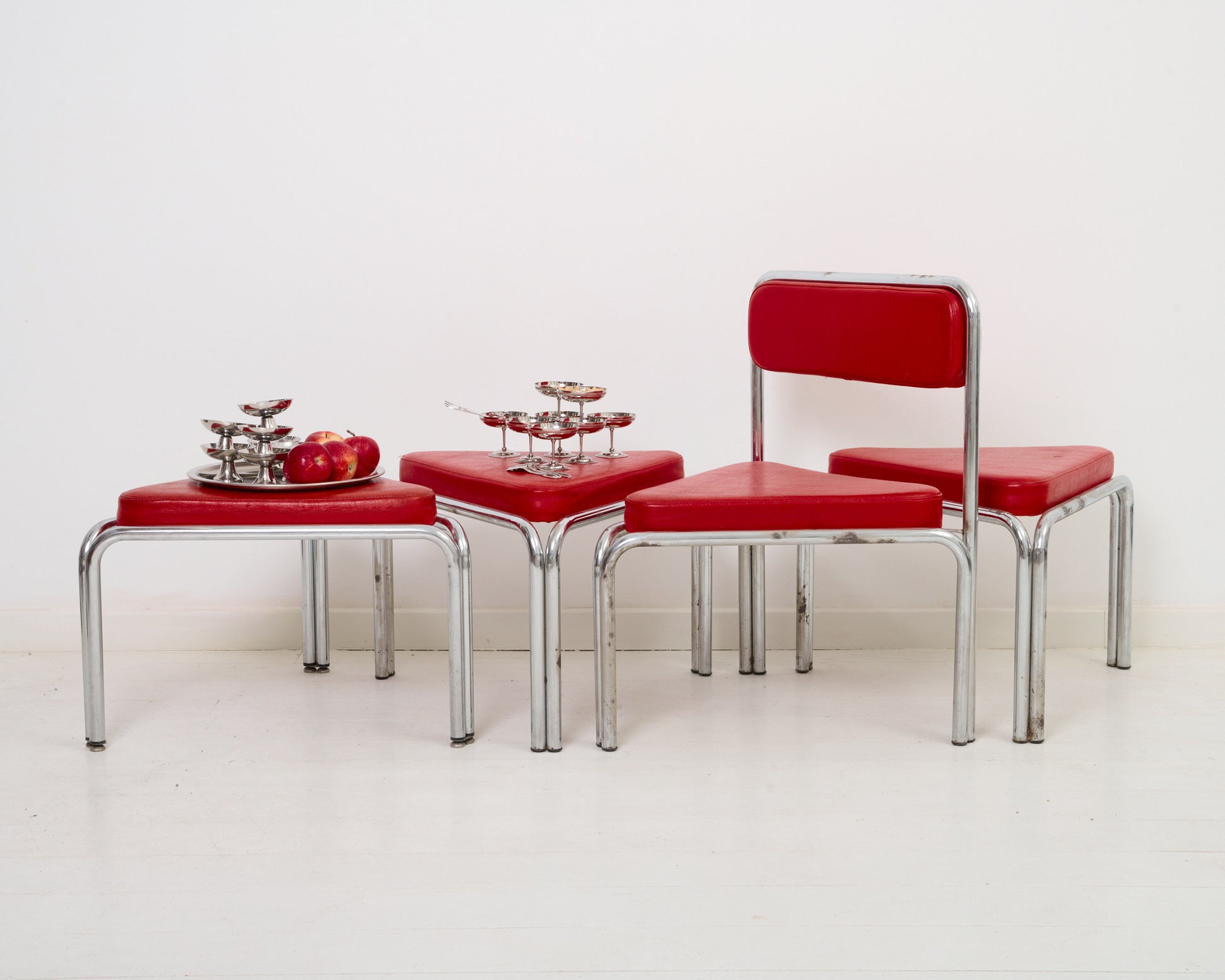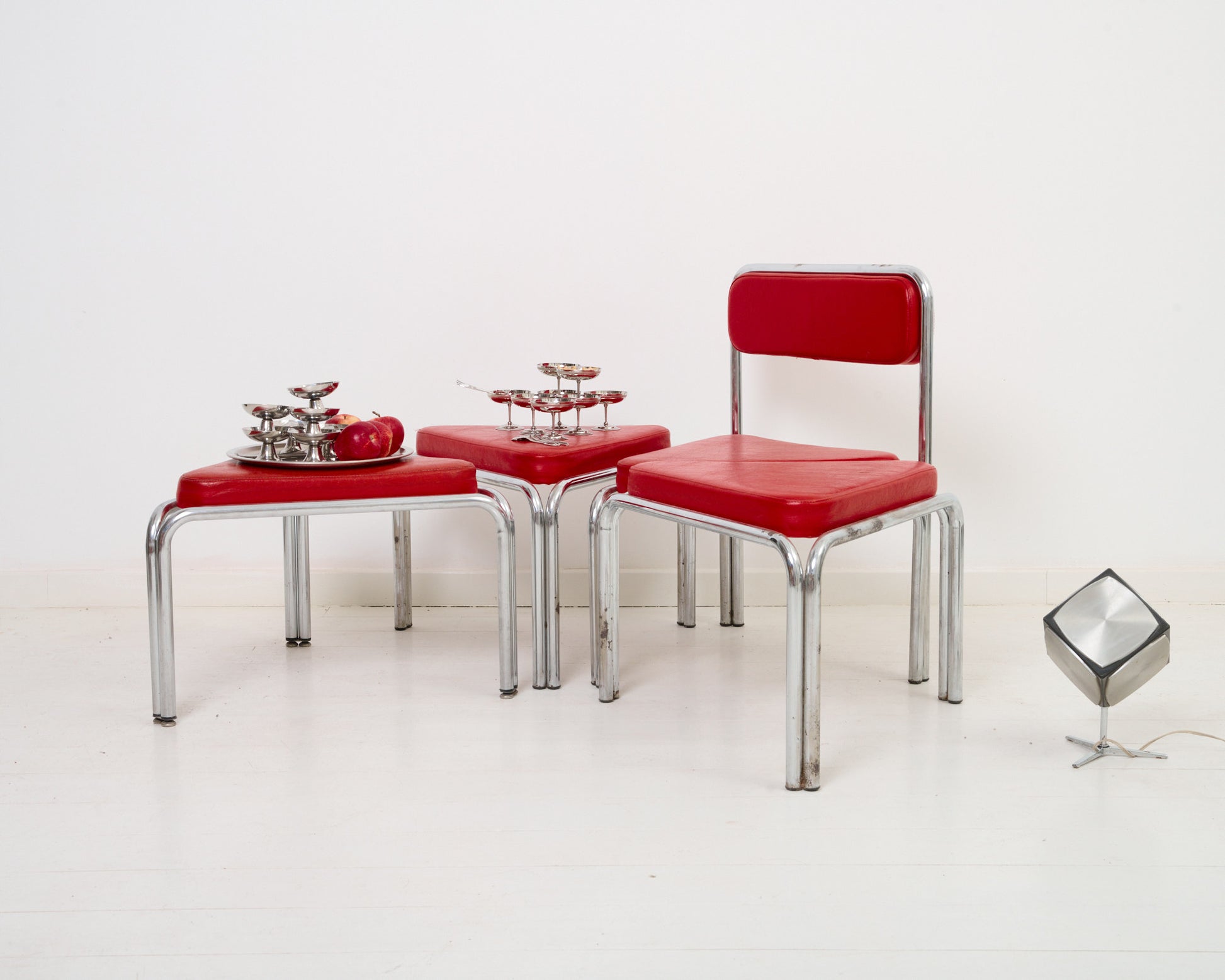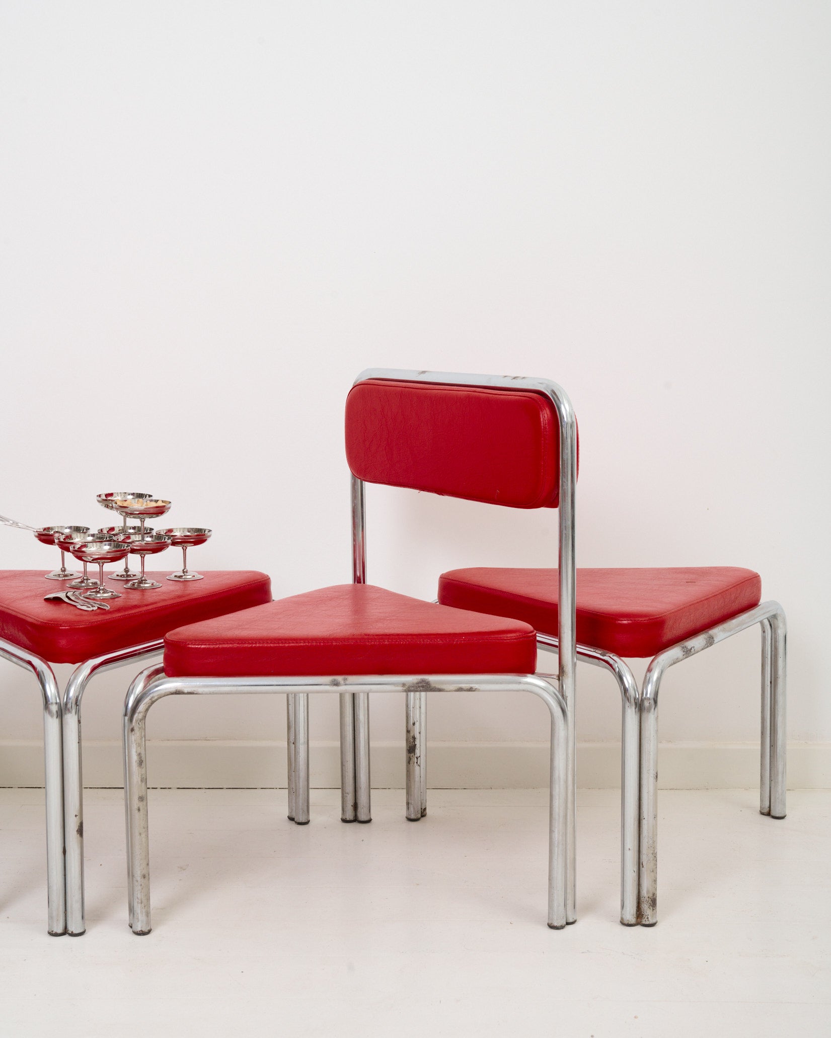 Rare suite d'une chaise et trois tabourets en skaï rouge et pieds tubulaire chromés des années 1970 par Valeri (France) dans les années 70. Bel état malgré quelques traces du temps (accroc sur le cuir d'un tabouret) et légers manques sur le chrome.