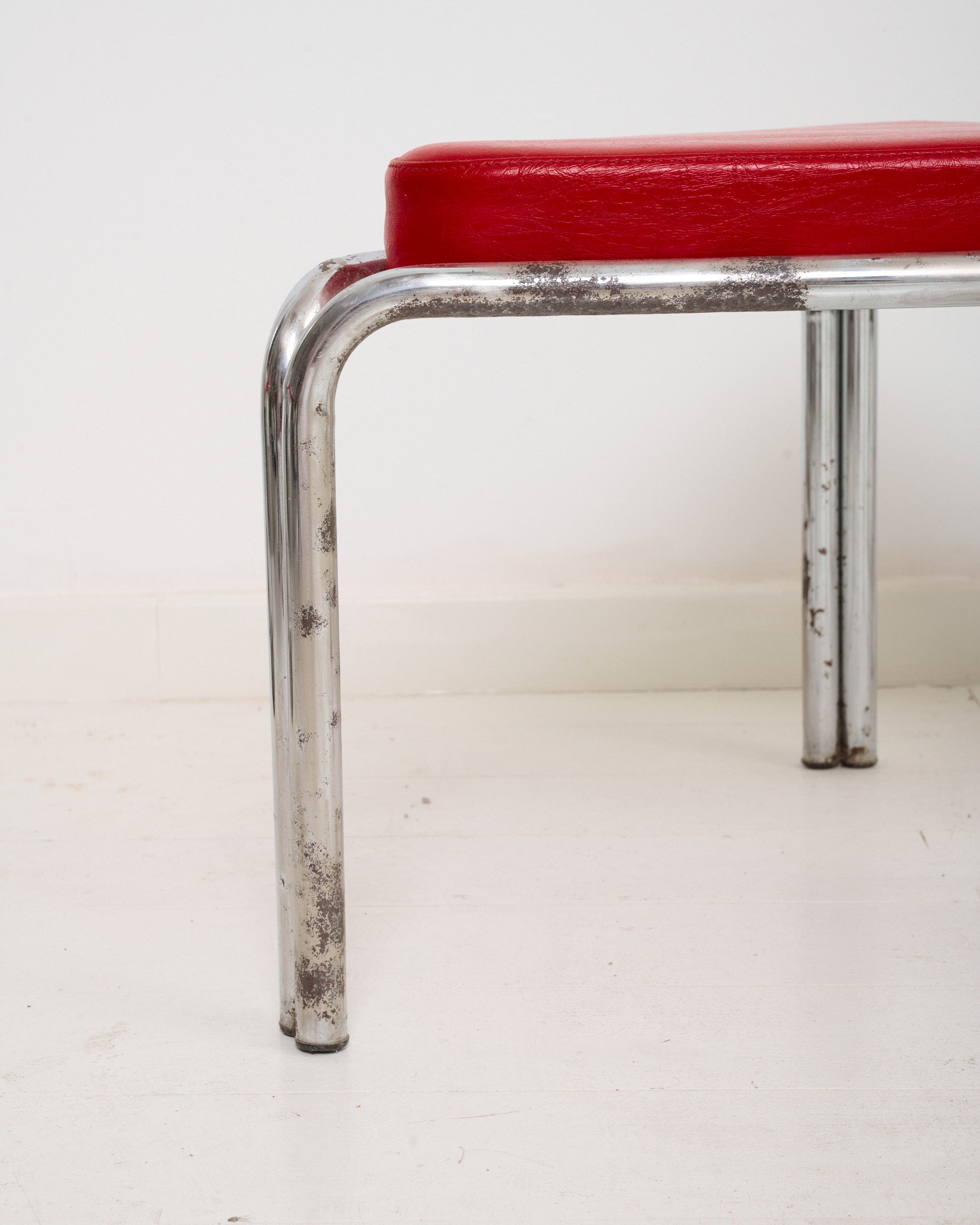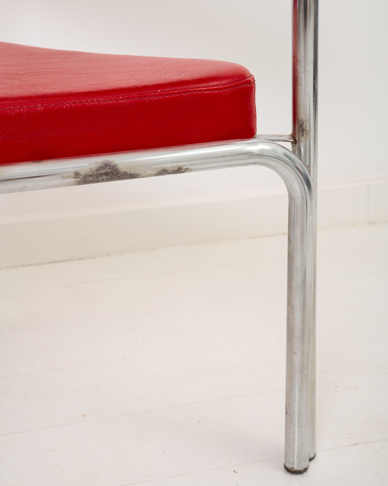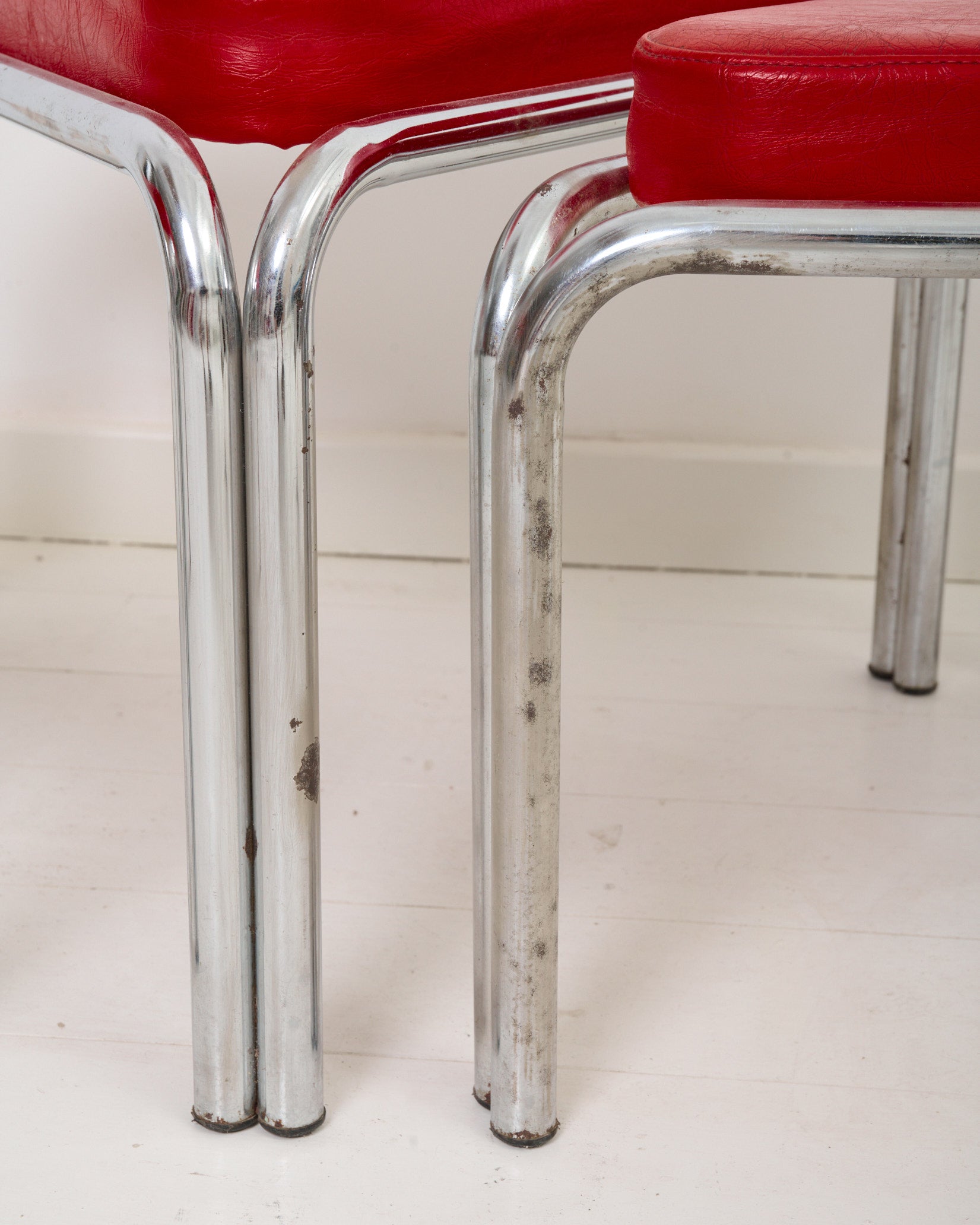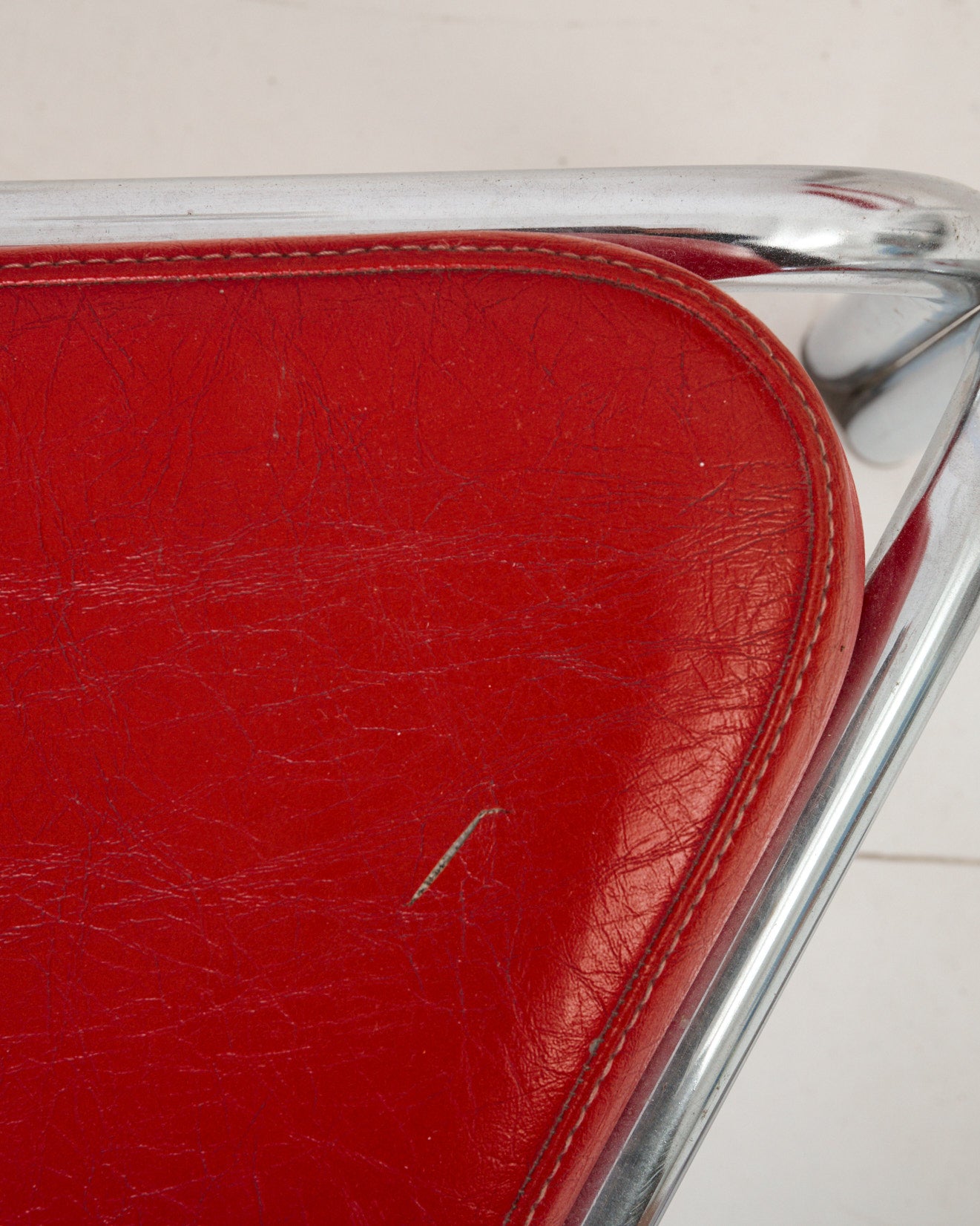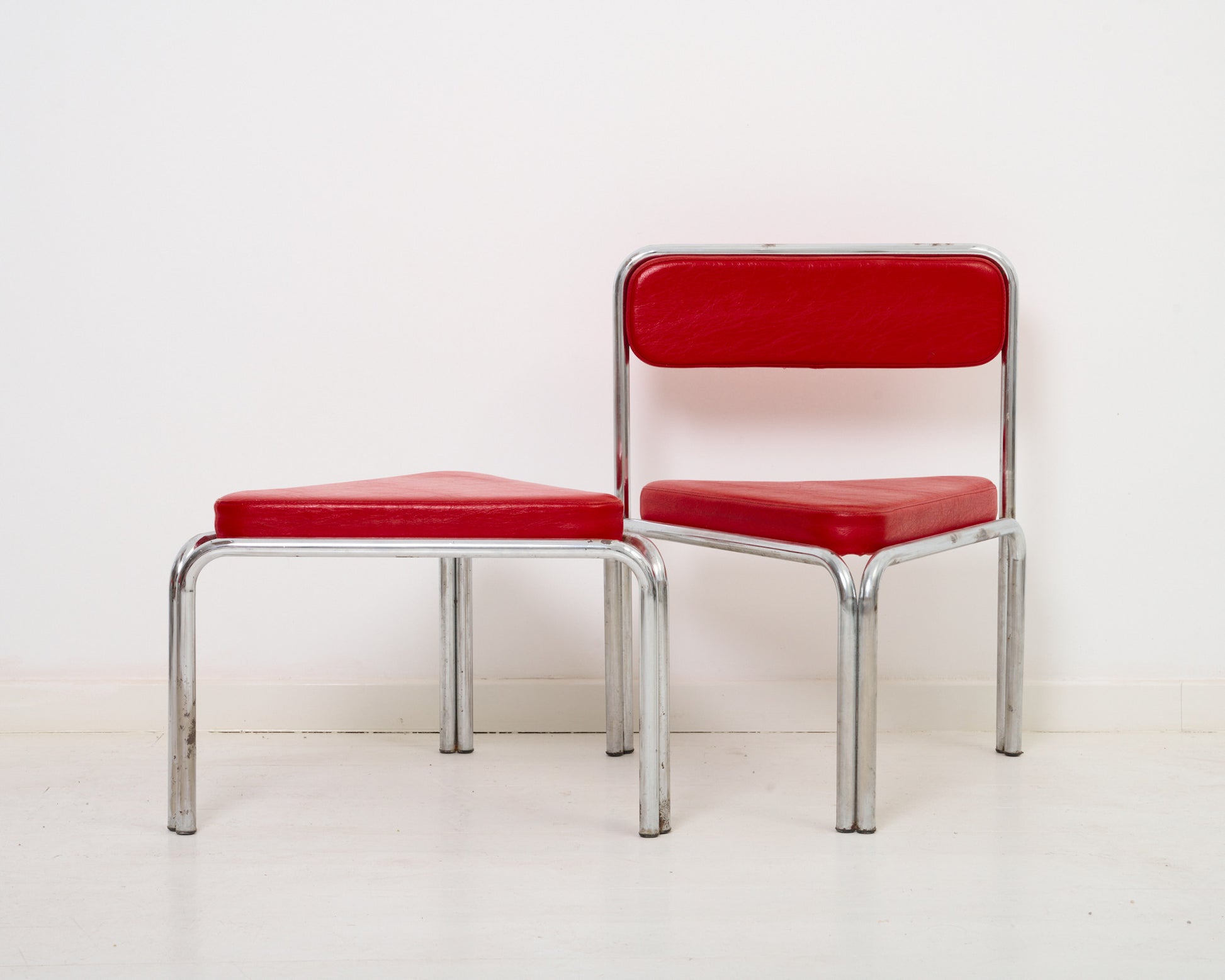 Rare suite d'une chaise et trois tabourets en skaï rouge et pieds tubulaire chromés des années 1970 par Valeri (France) dans les années 70. Bel état malgré quelques traces du temps (accroc sur le cuir d'un tabouret) et légers manques sur le chrome.