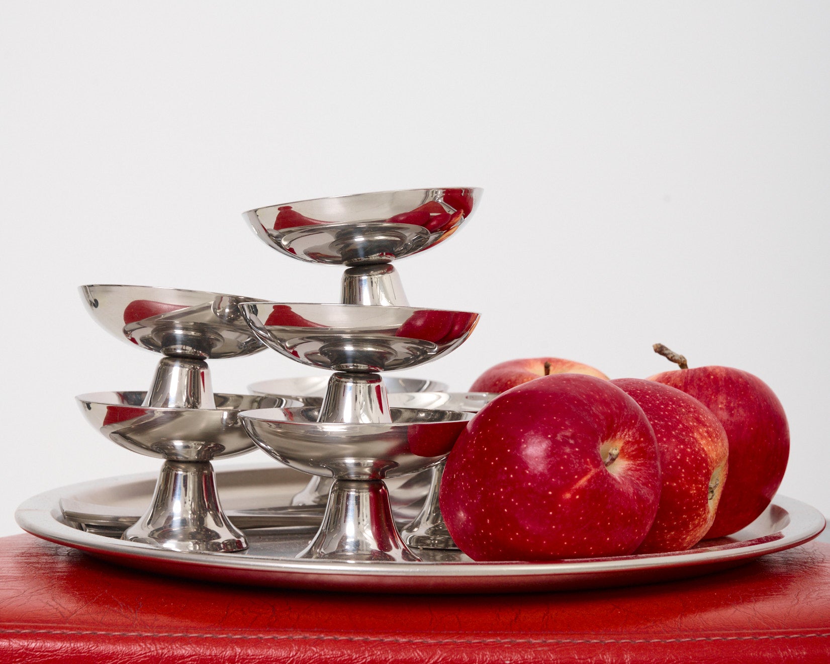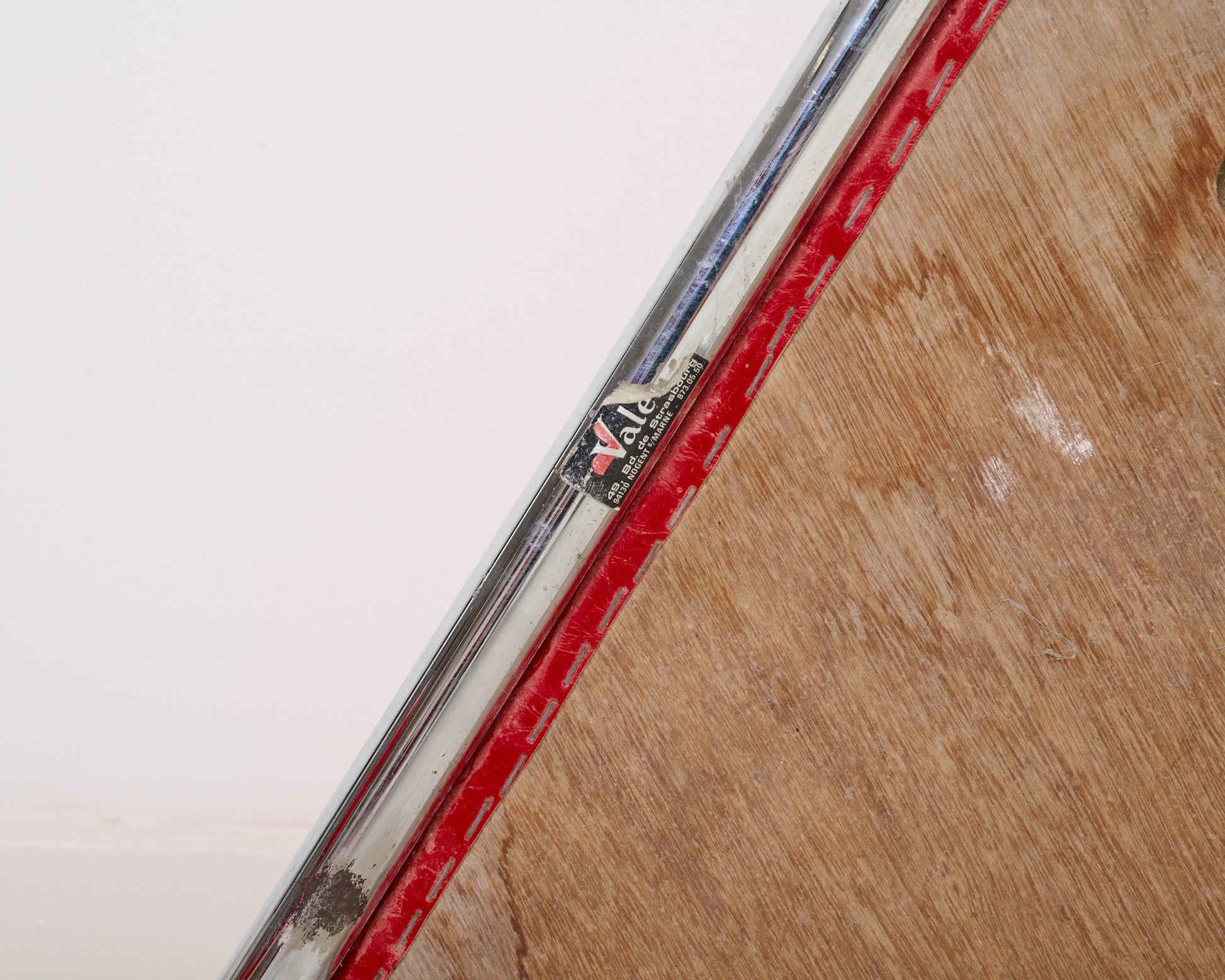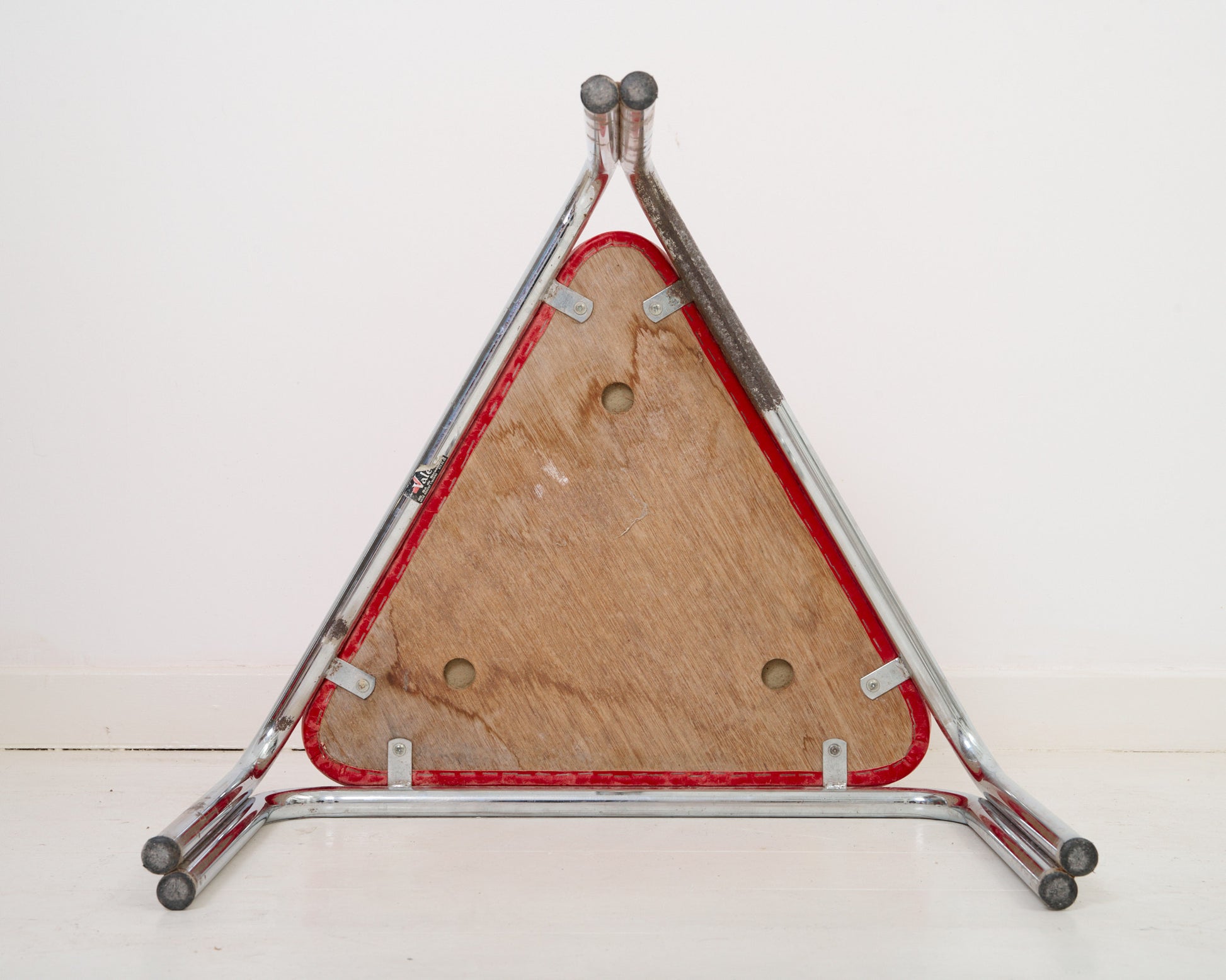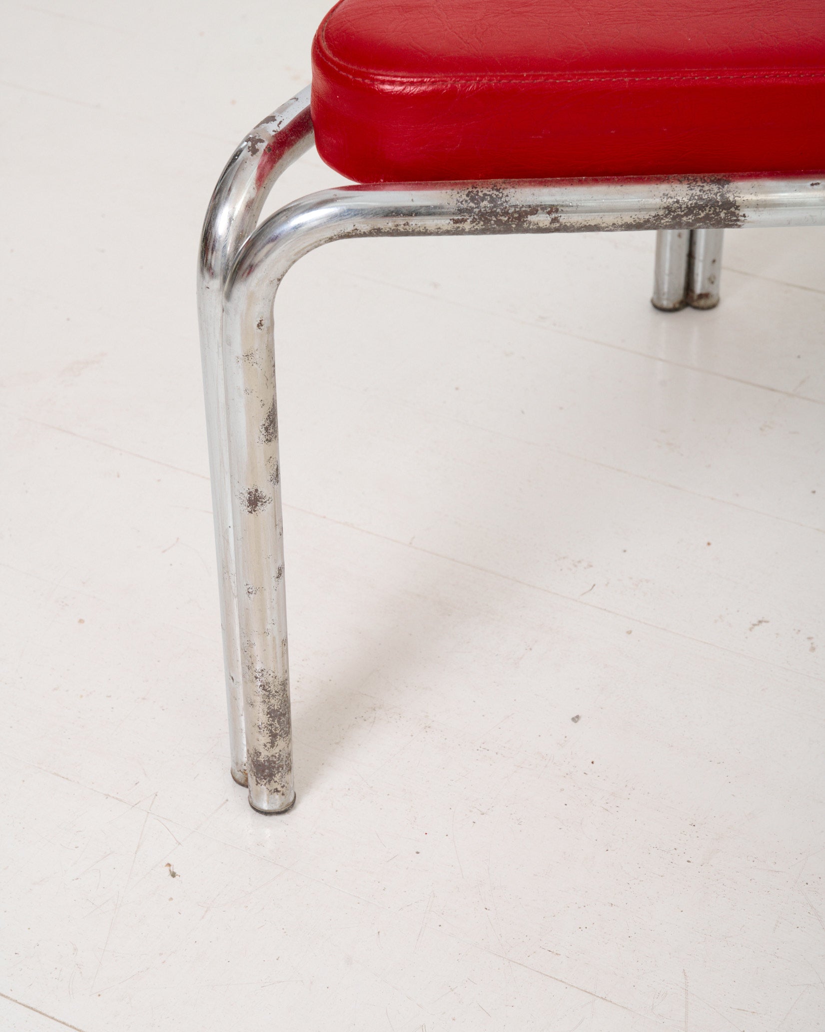 Rare suite d'une chaise et trois tabourets en skaï rouge et pieds tubulaire chromés des années 1970 par Valeri (France) dans les années 70. Bel état malgré quelques traces du temps (accroc sur le cuir d'un tabouret) et légers manques sur le chrome.