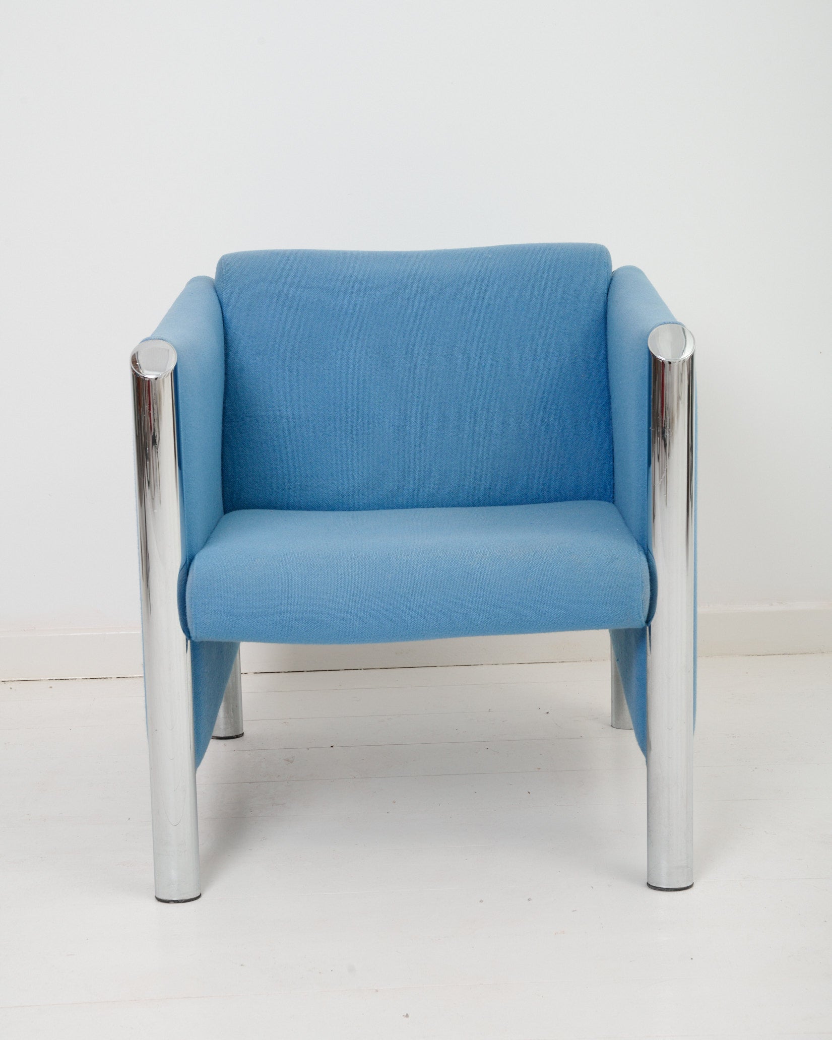 Le modèle d'origine était proposé en similicuir noir et en tissu bleu foncé, mais l'éditeur permettait la personnalisation du tissu. Ce fauteuil bleu clair était donc une commande particulière qui n'apparaît pas dans les catalogues.