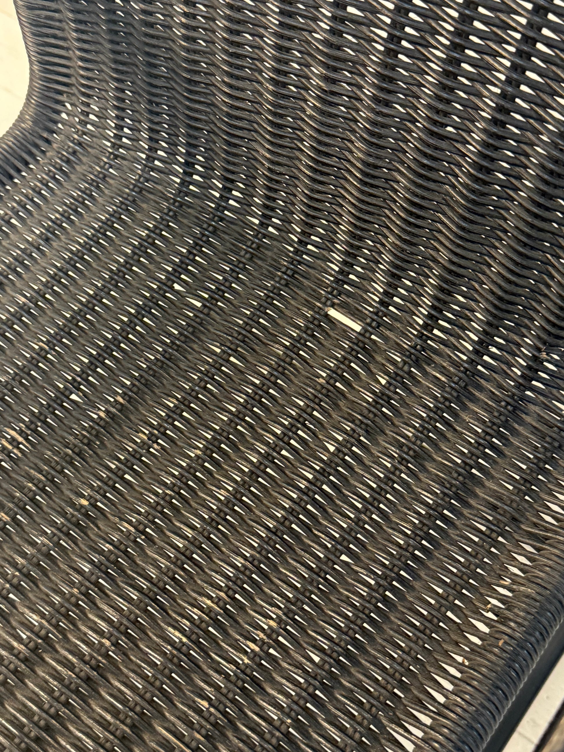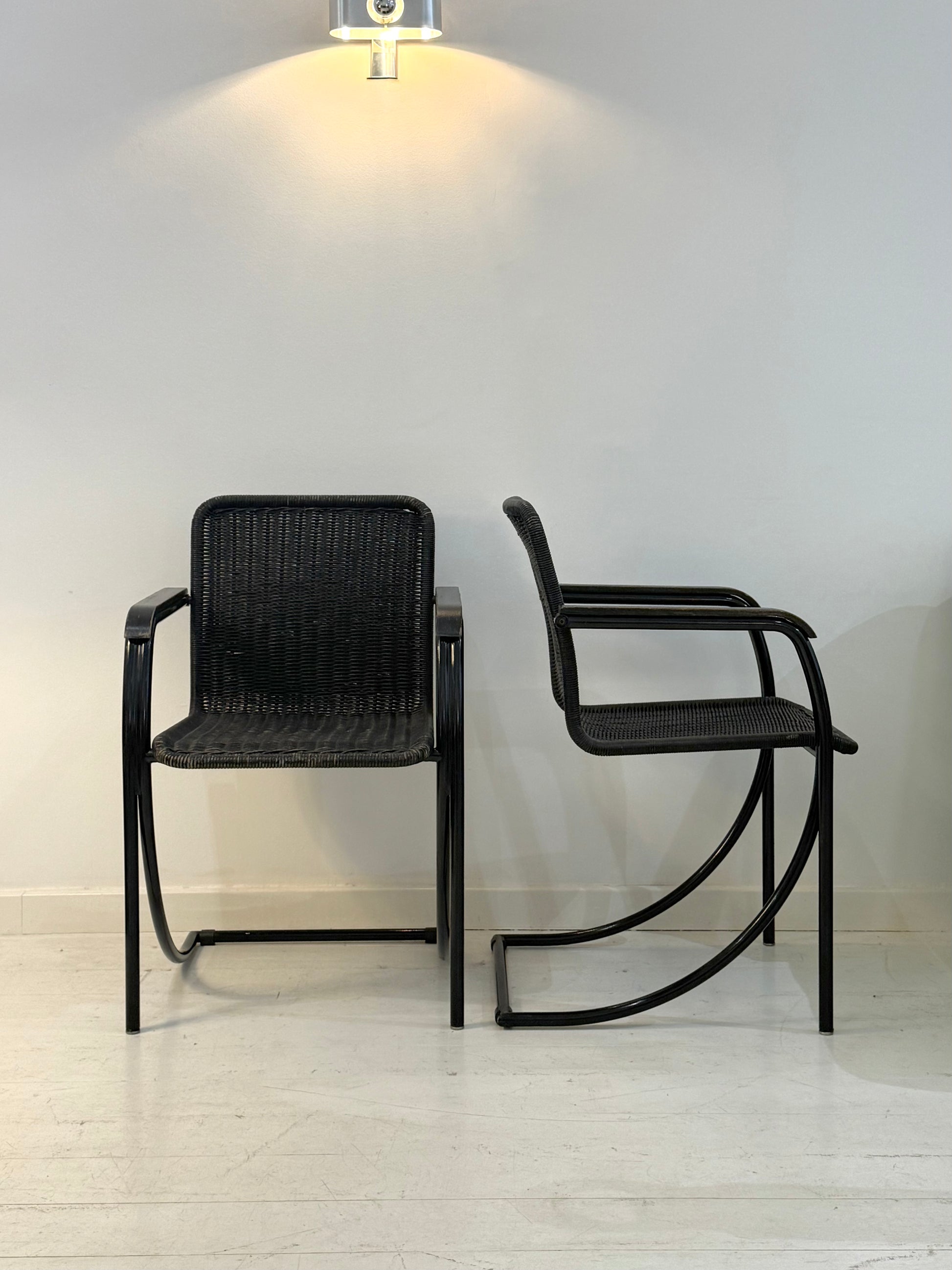 Fauteuil en osier et métal noir, Memphis, 1980s. Deux disponibles. Très bel état malgré un petit manque au niveau de l'assise d'un des fauteuils et sur la peinture des accoudoirs.