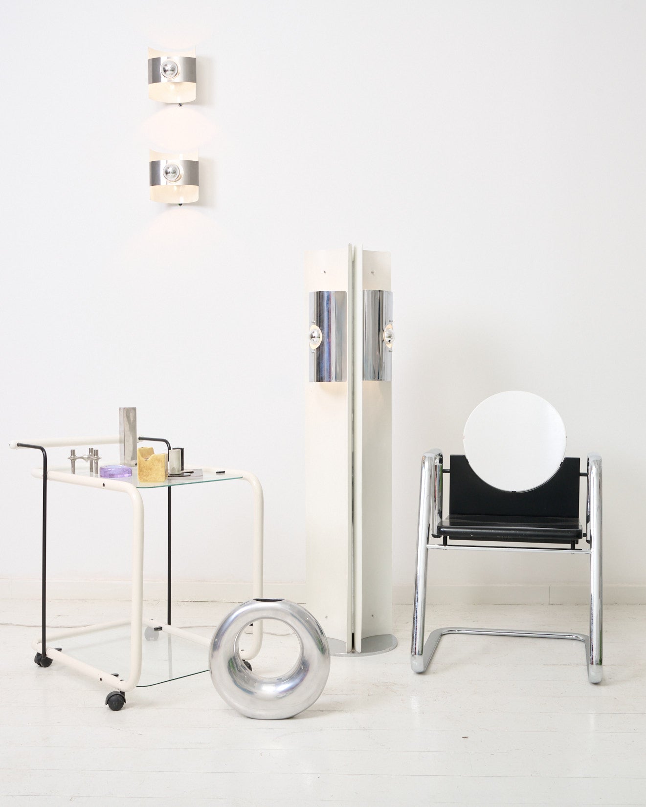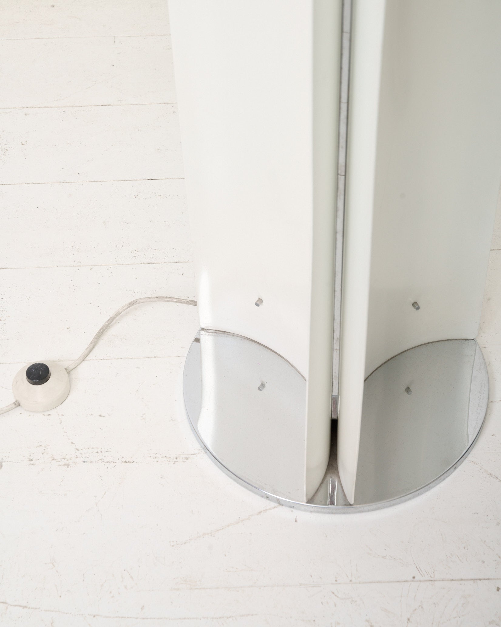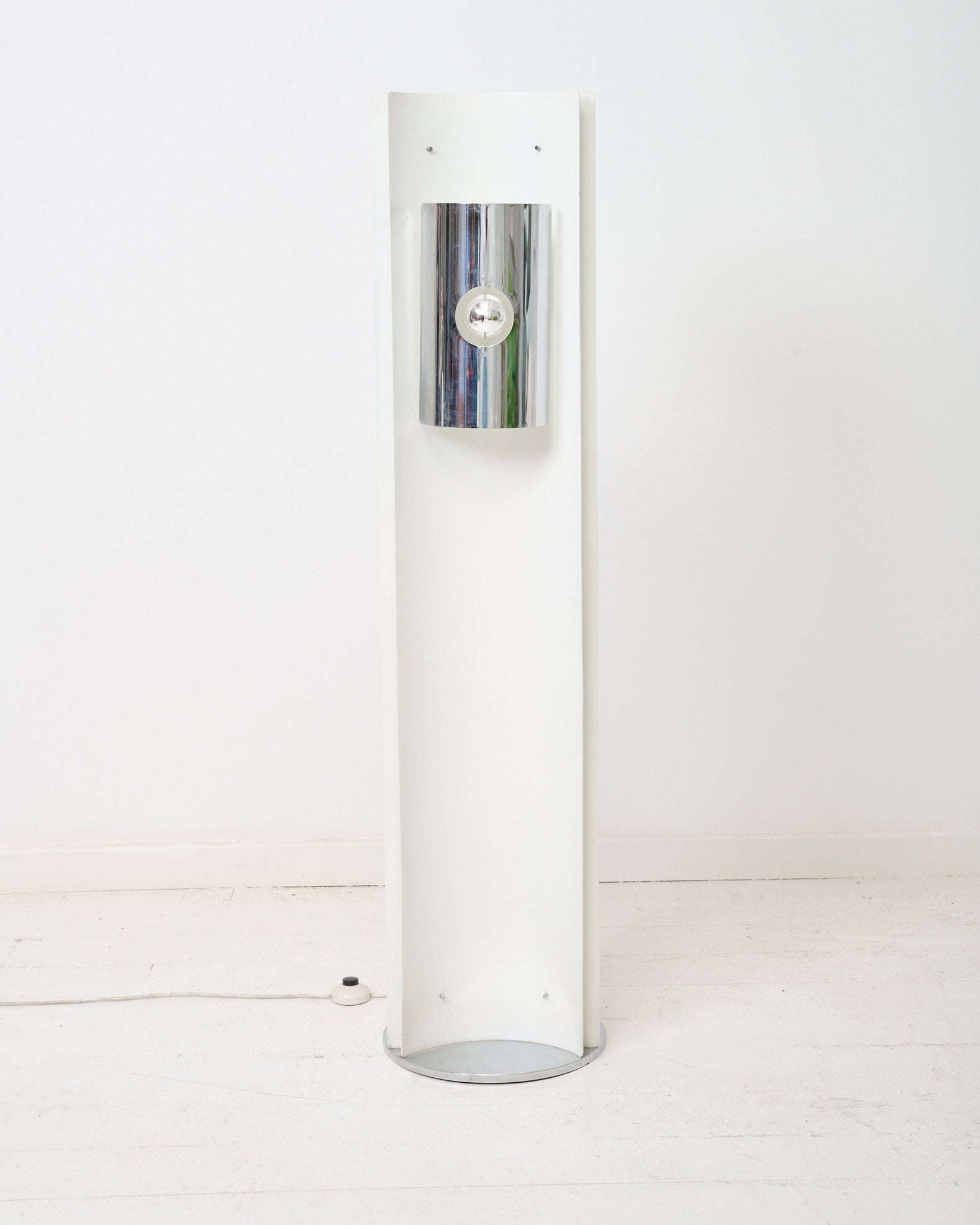Lampadaire en métal blanc et chromé de l'ère spatiale dans les années 1970. Style Tronconi. Structure en métal blanc qui présente trois sources de lumière en 360. La lampe nécessite trois ampoules E27. Très bel état malgré un très léger manque de peinture à un endroit (voir photo).