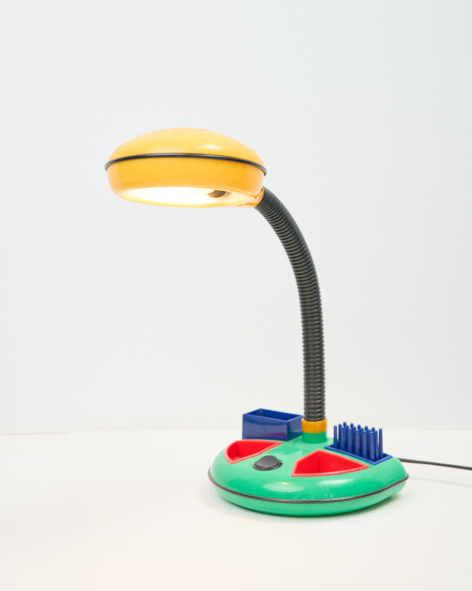 Lampe de bureau des années 80 de la marque Kyoji Tanaka. La tête à col de cygne jaune et noire peut tourner dans différentes directions. La base sert d'organisateur de bureau et est verte, rouge et bleue et la tete jaune. Memphis. Très bel état.