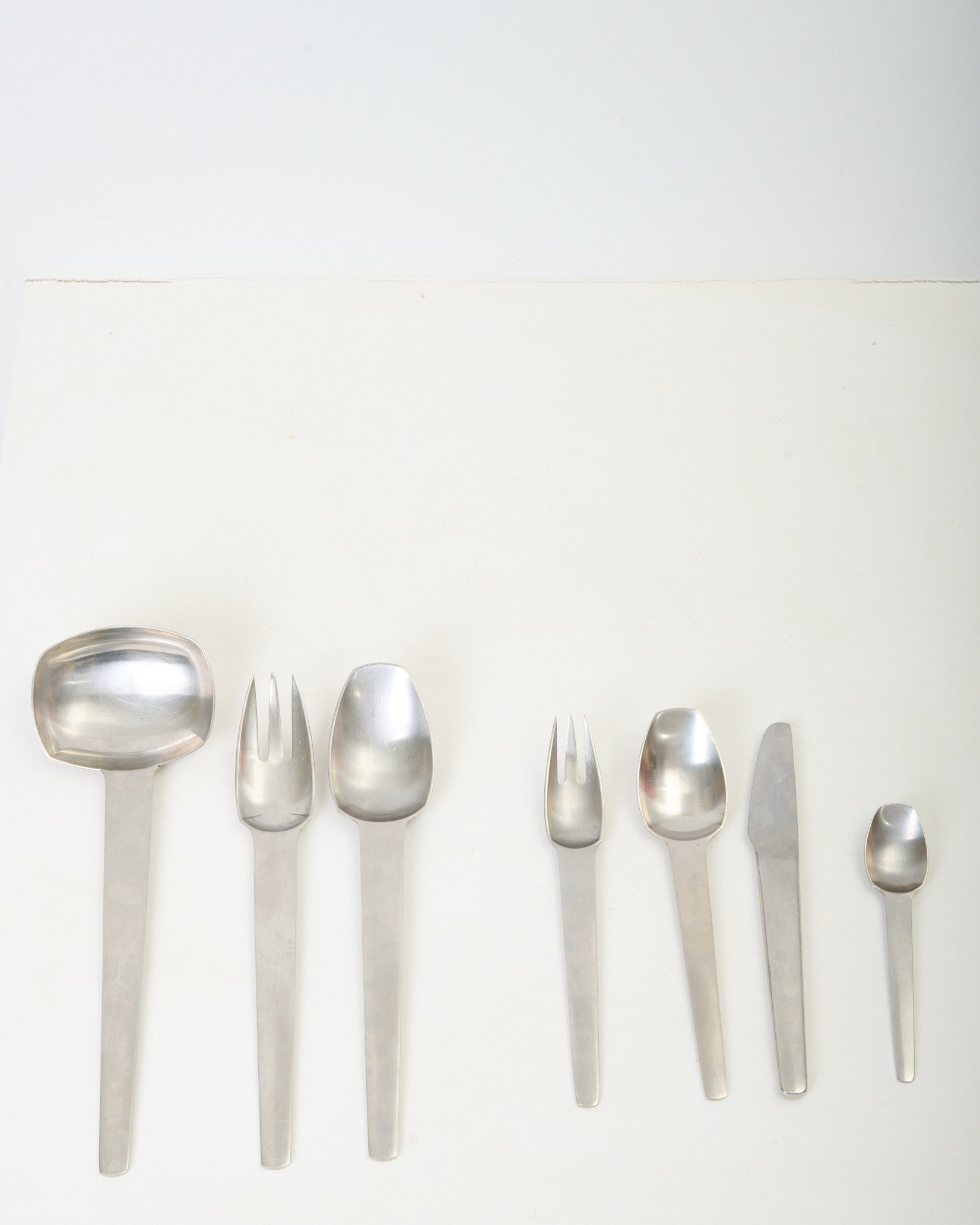Ménagère Space age en inox comprenant : 12 fourchettes, 12 couteaux, 12 cuillères , 10 petites cuillères, 2 couverts à service et 1 louche. Très bel état.