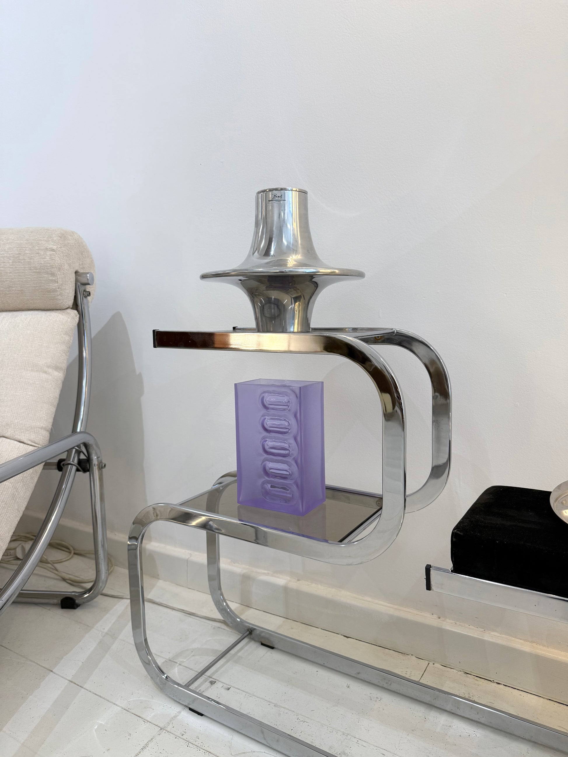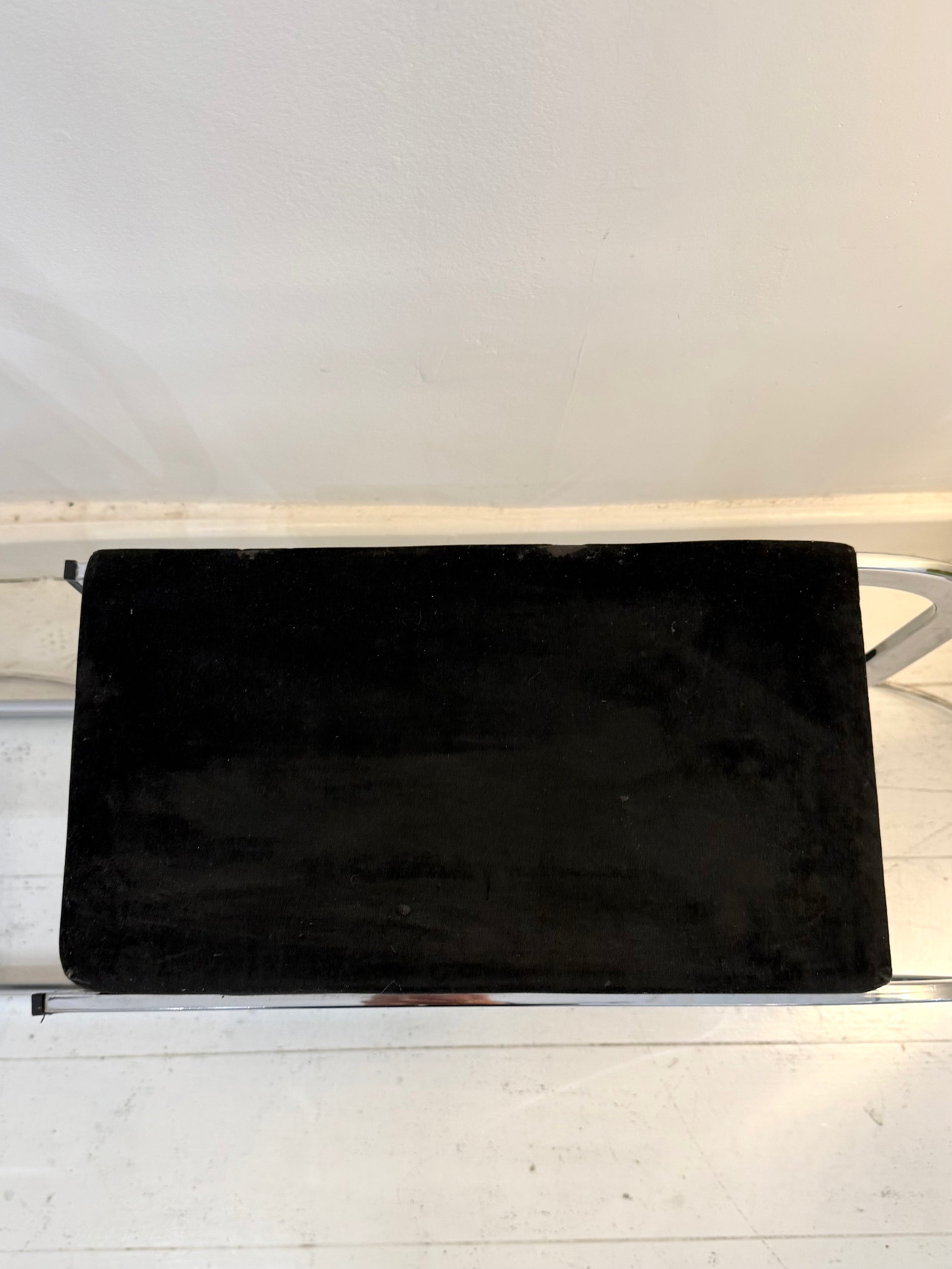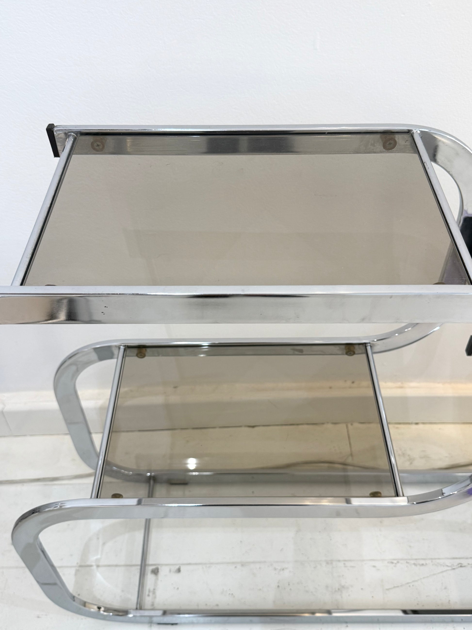 Meuble d'entrée ou meuble téléphone des années 1970. En chrome, verre fumé et l'assise du tabouret style cantilever et en daim. Très bel état du chrome et du verre, quelques manques au niveau du tissu.
