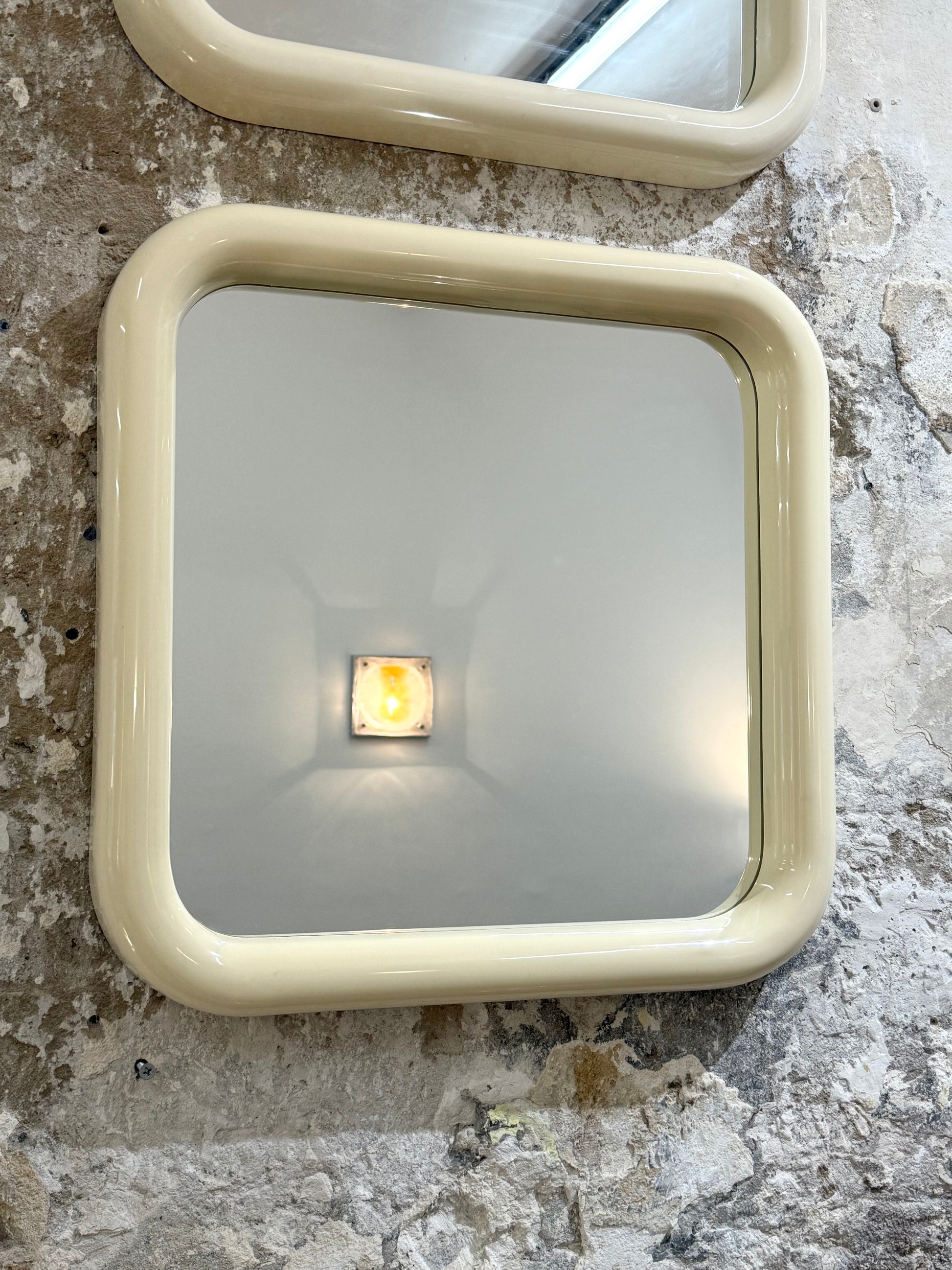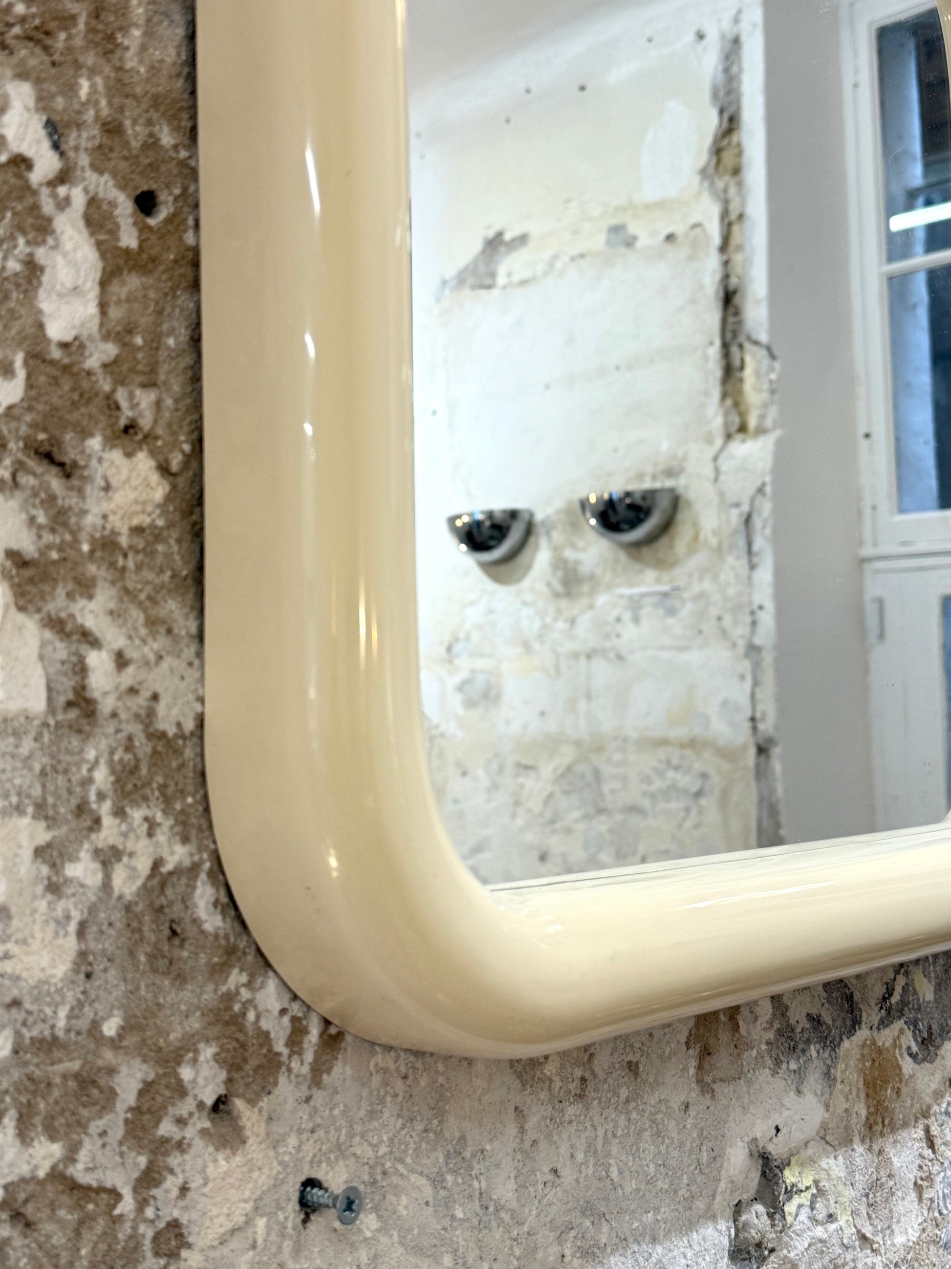 Miroir vintage avec cadre profond arrondi en plastique crème. Space age. Accroche murale au dos. Très bel état. Deux sur trois disponibles.