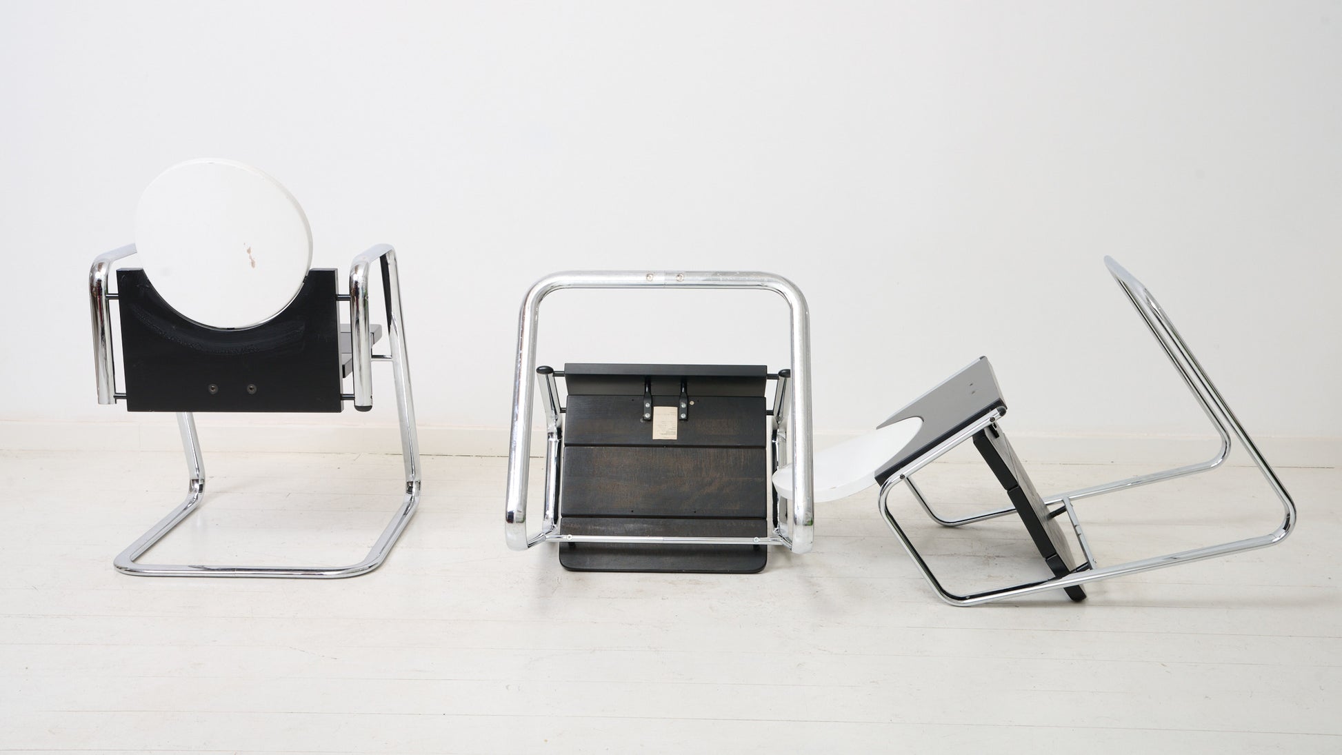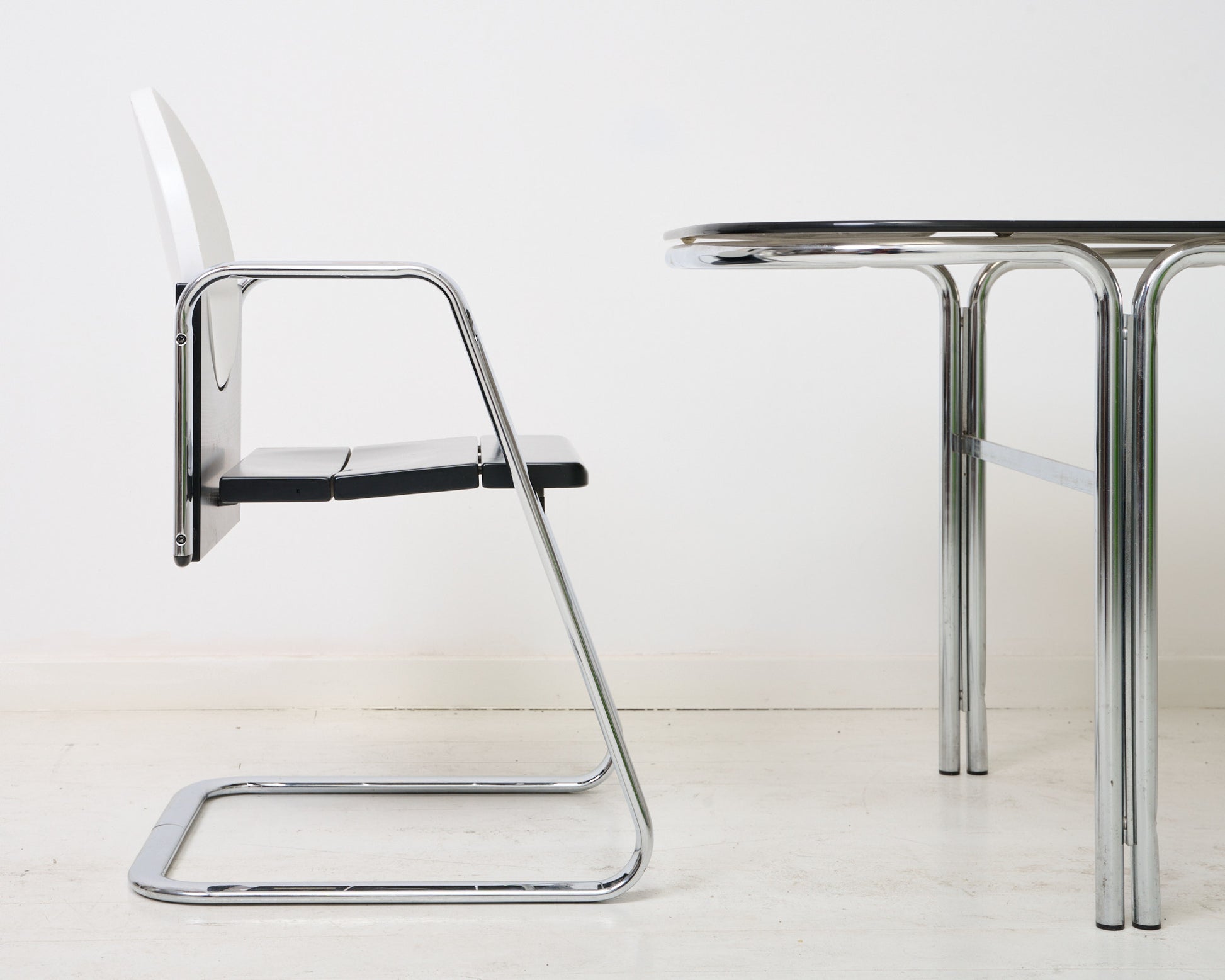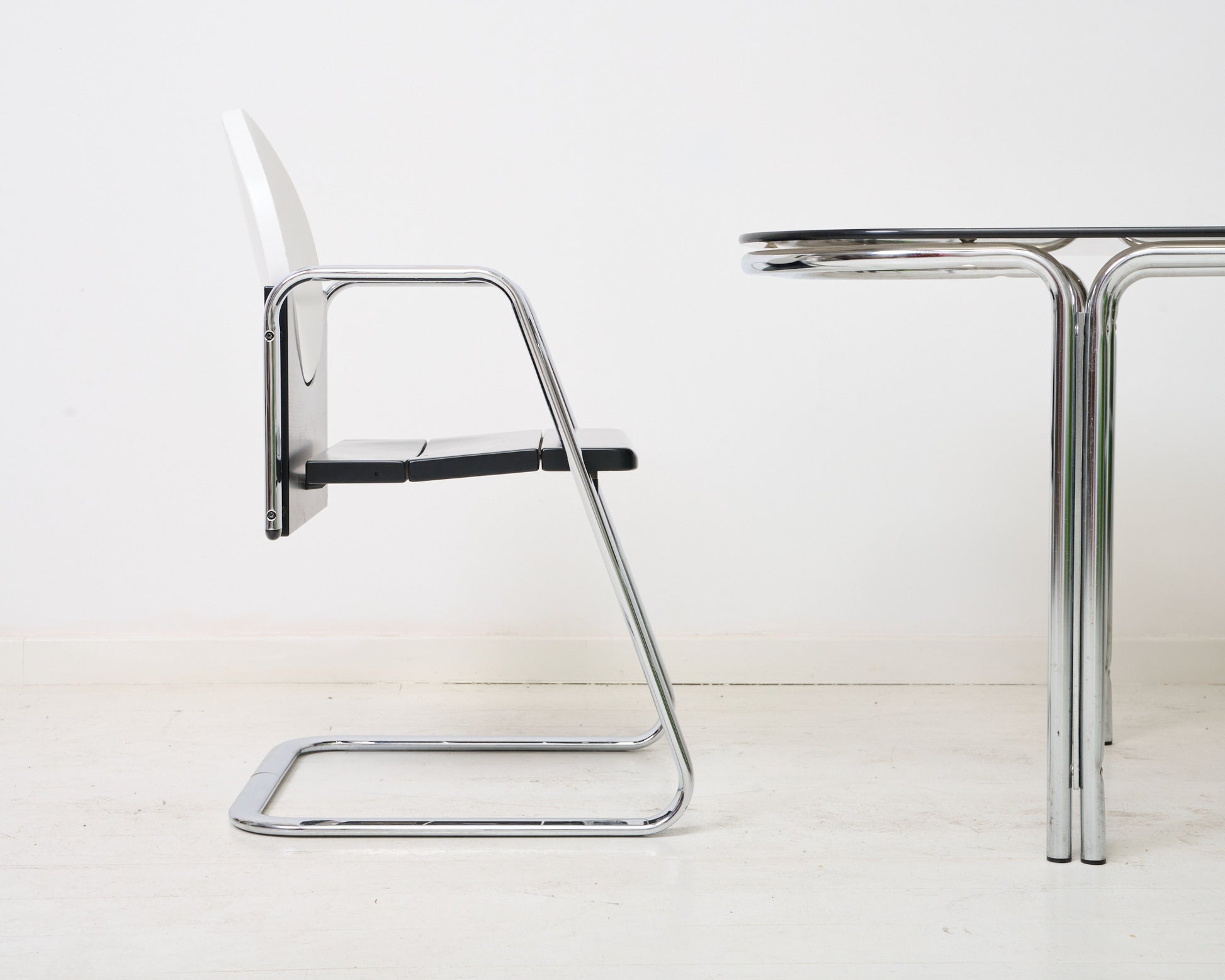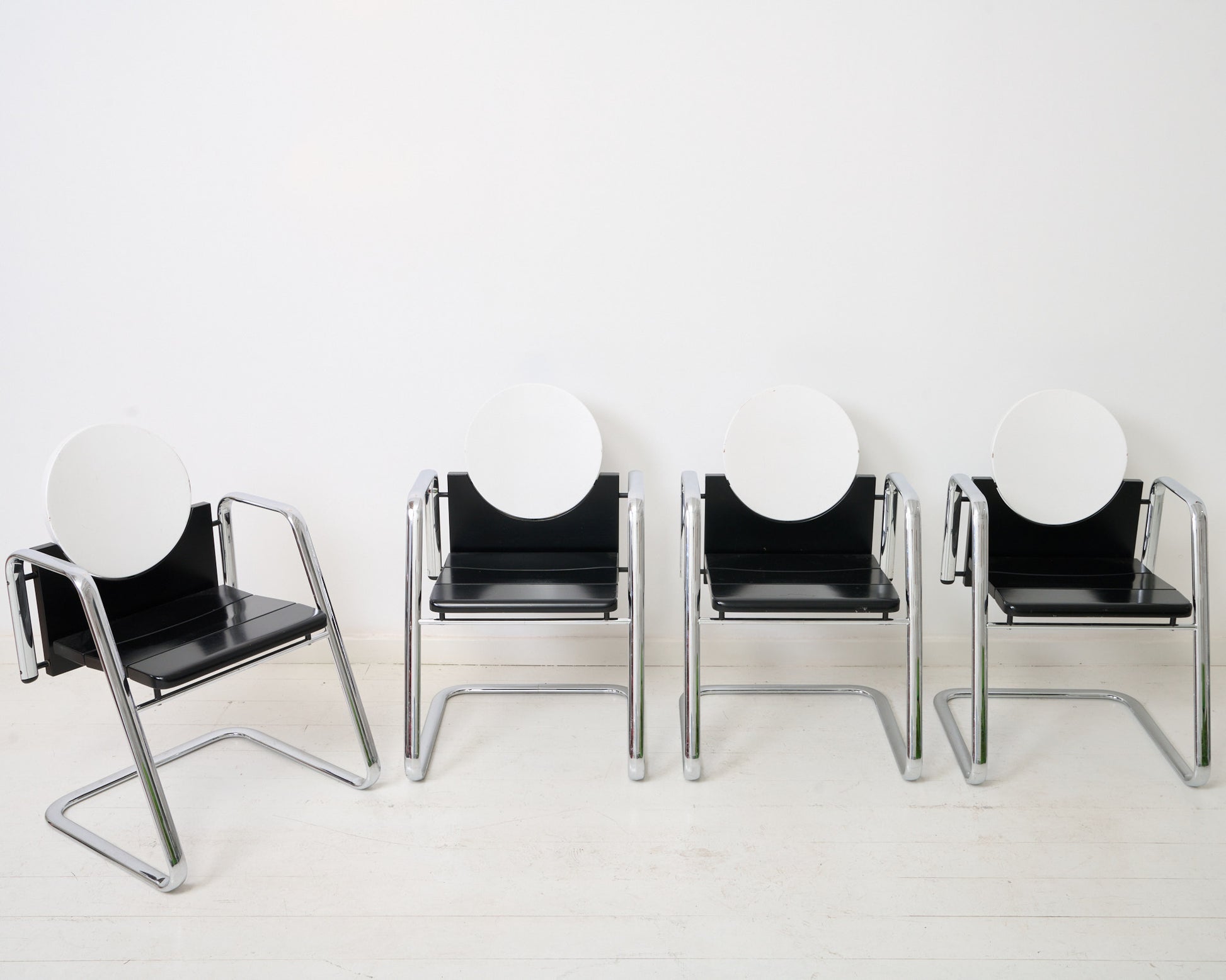 Ensemble de quatre chaises modèle G-pino ou "Pinocchio" par Martin Stoll. Signé sous l'assise (voir photo). Structure en métal chromé. Très bel état du chrome, quelques manques et traces au niveau de la peinture blanche sur le bois (parties blanches).