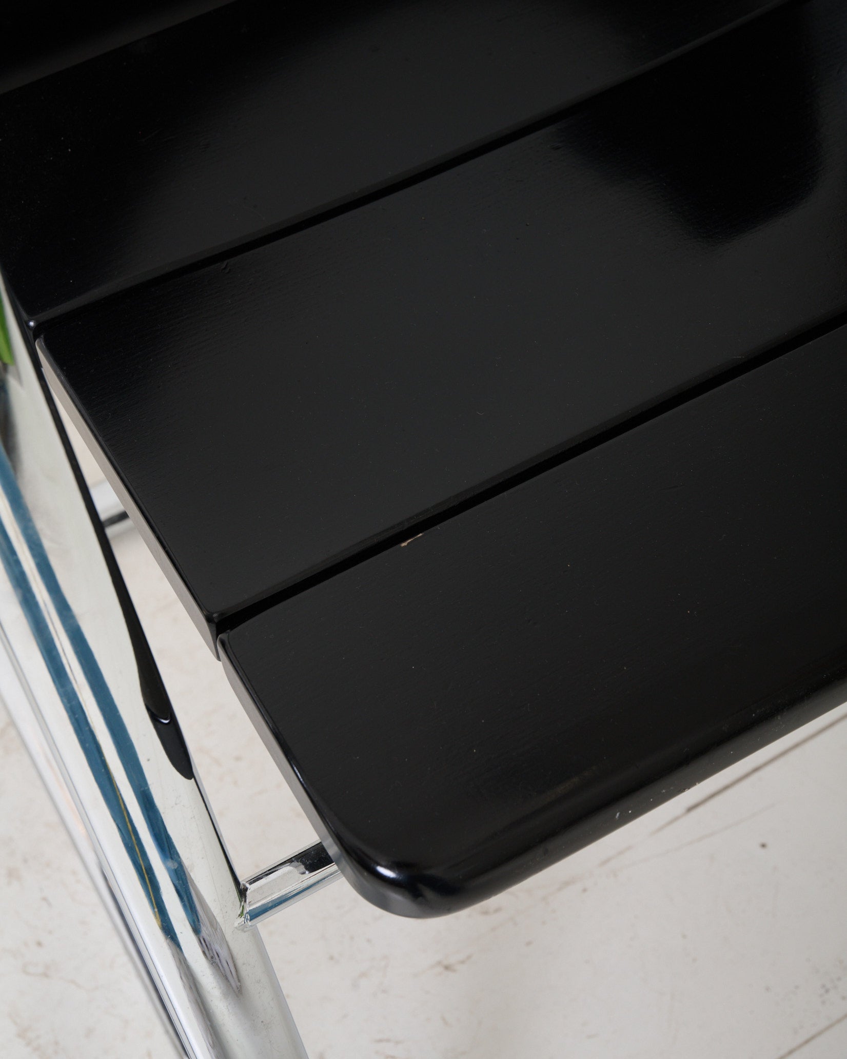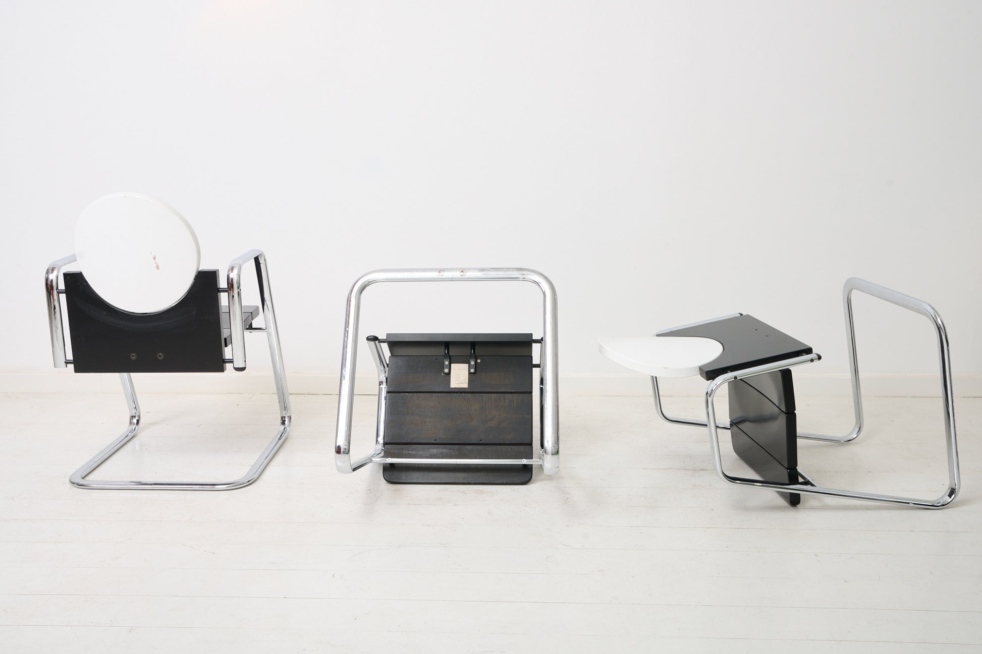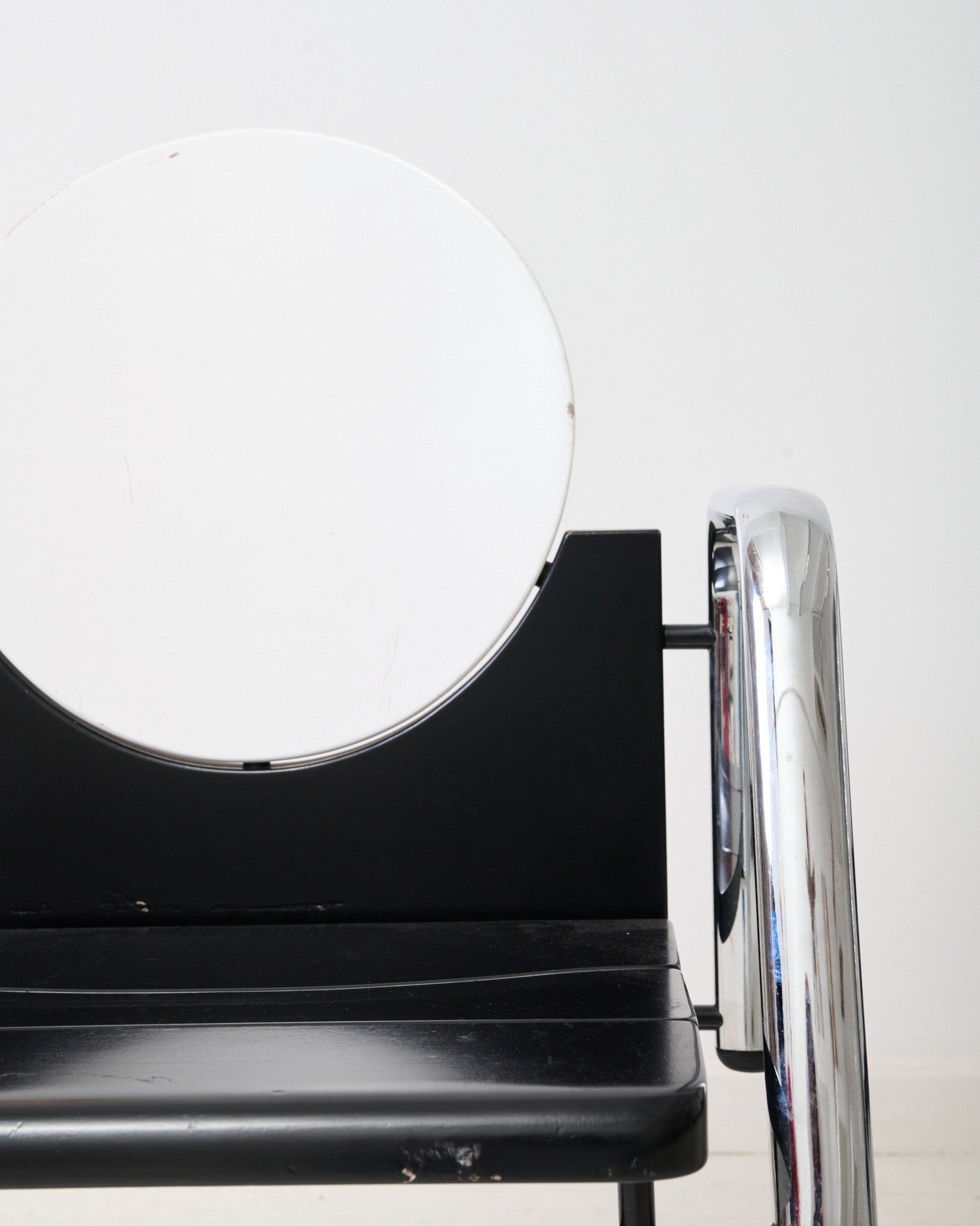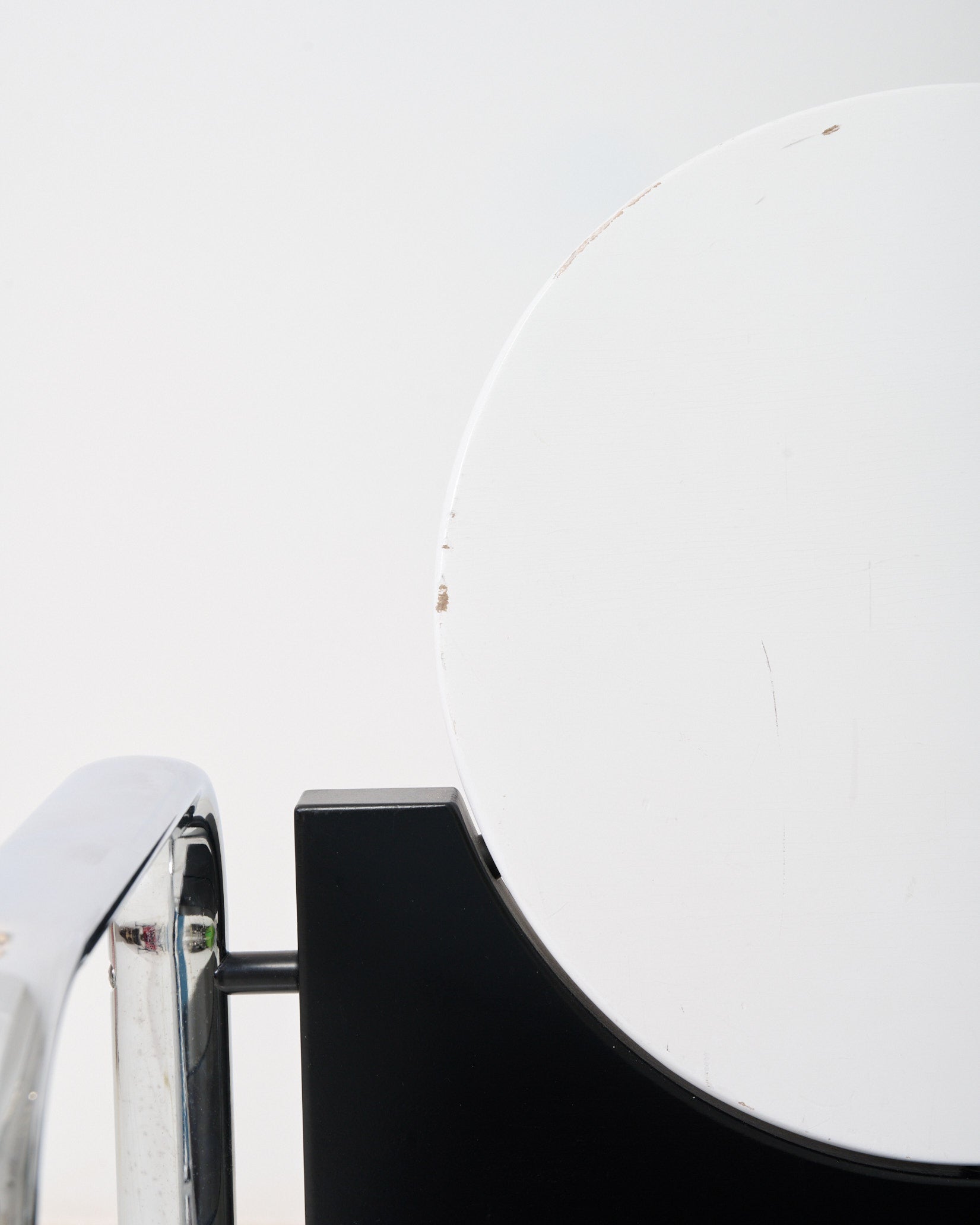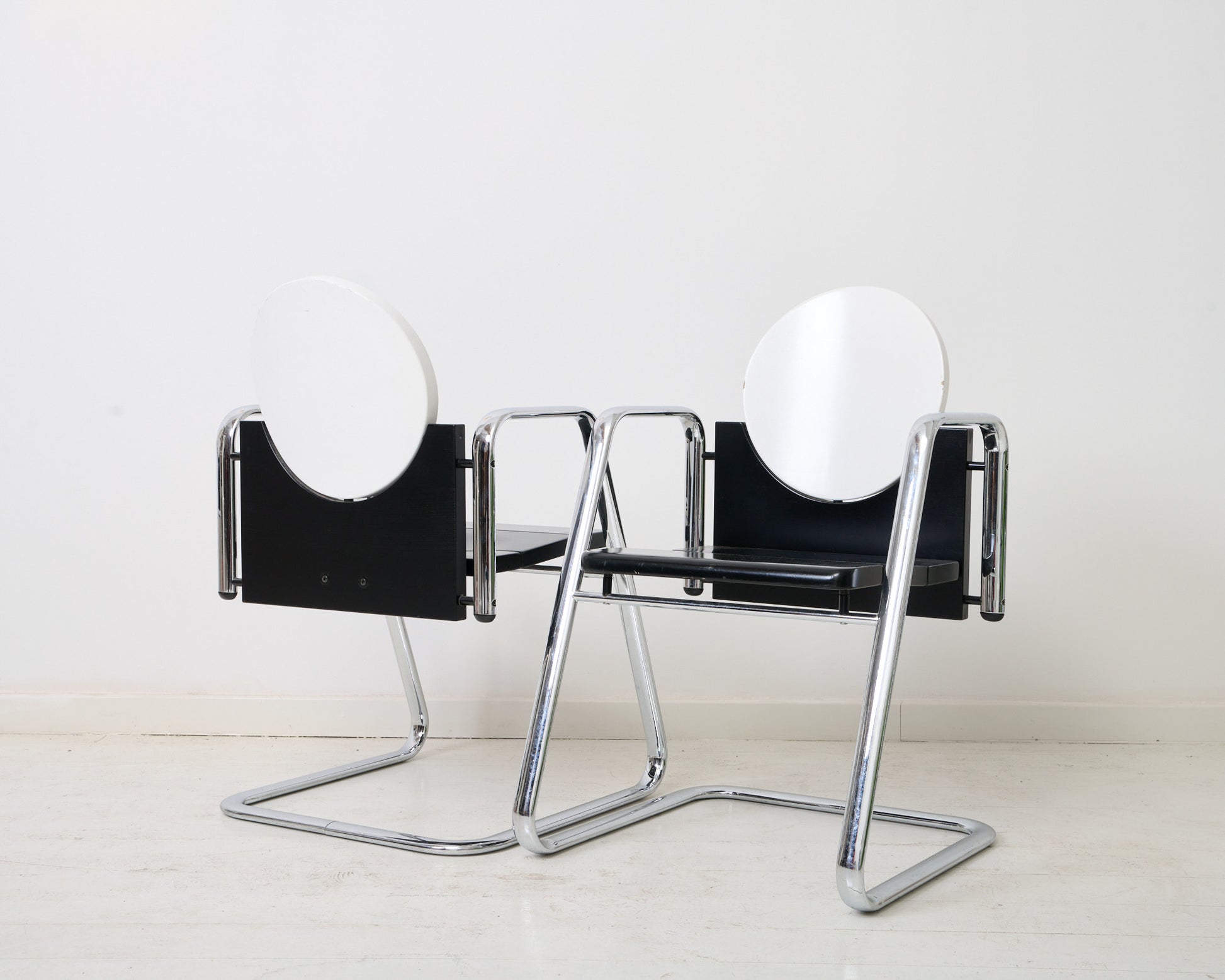 Ensemble de quatre chaises modèle G-pino ou "Pinocchio" par Martin Stoll. Signé sous l'assise (voir photo). Structure en métal chromé. Très bel état du chrome, quelques manques et traces au niveau de la peinture blanche sur le bois (parties blanches).