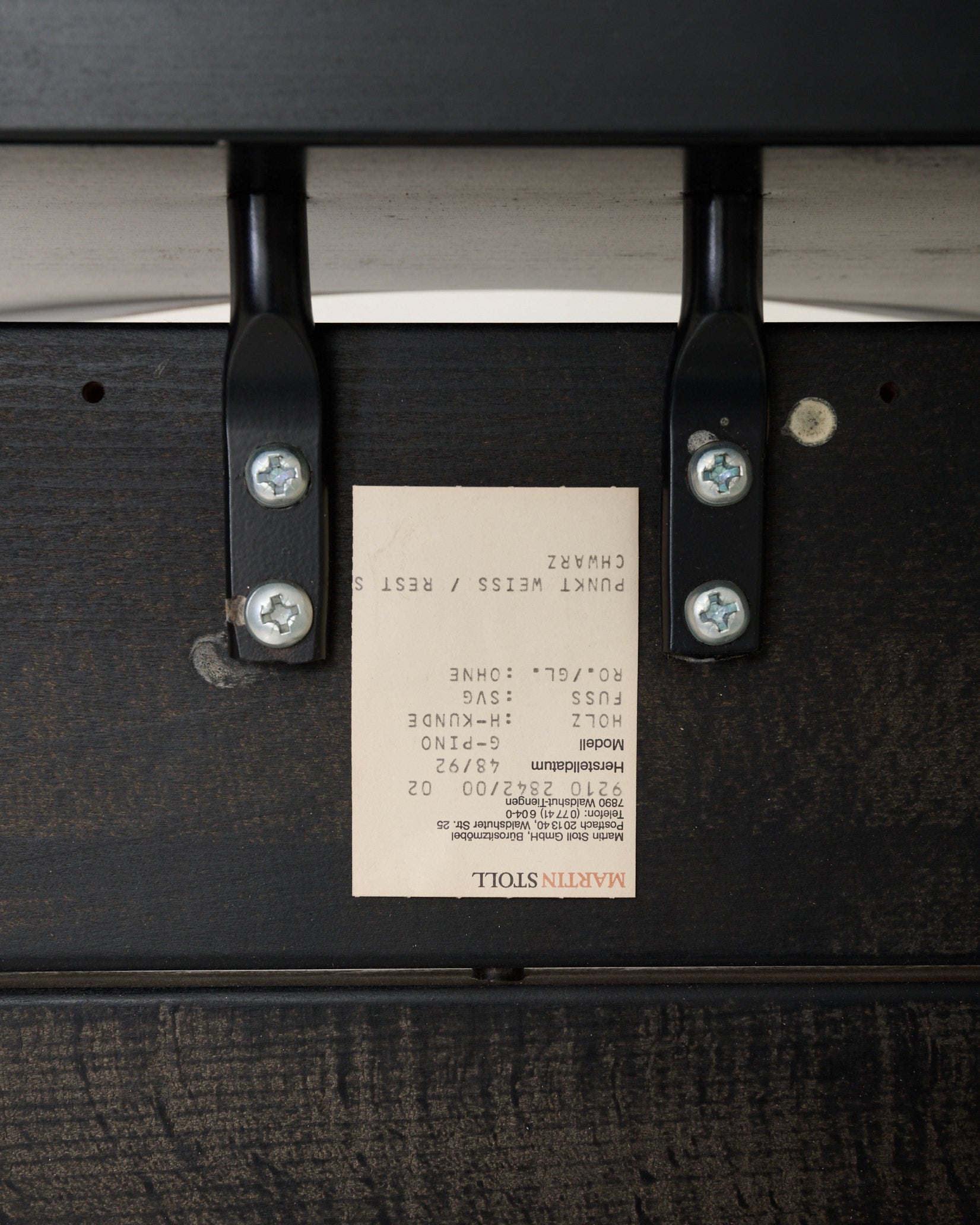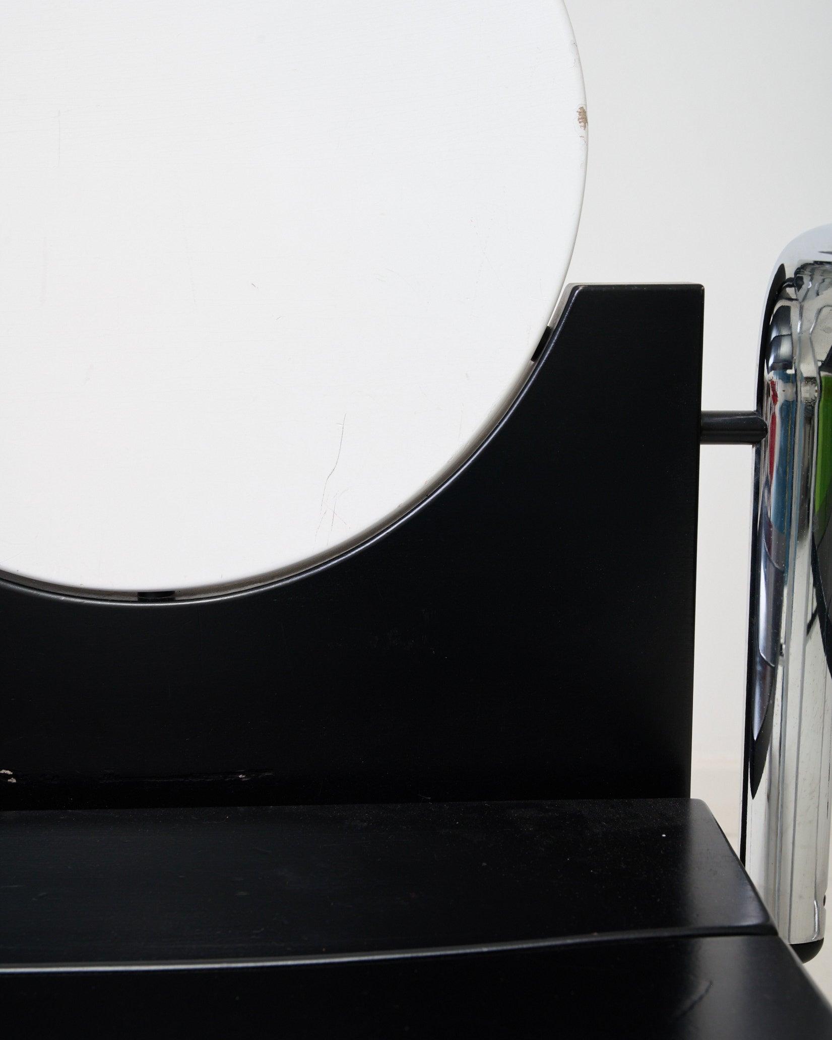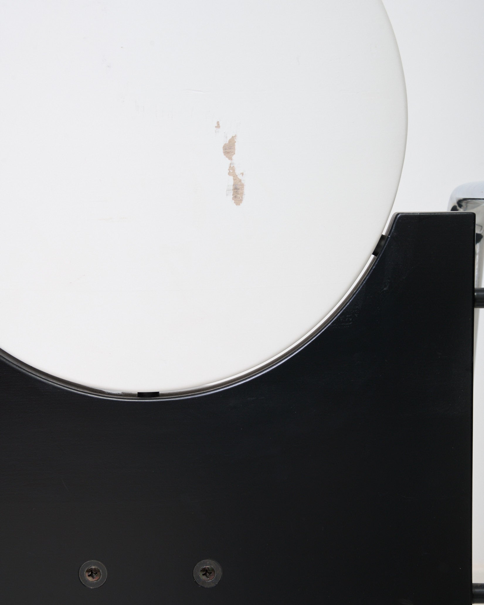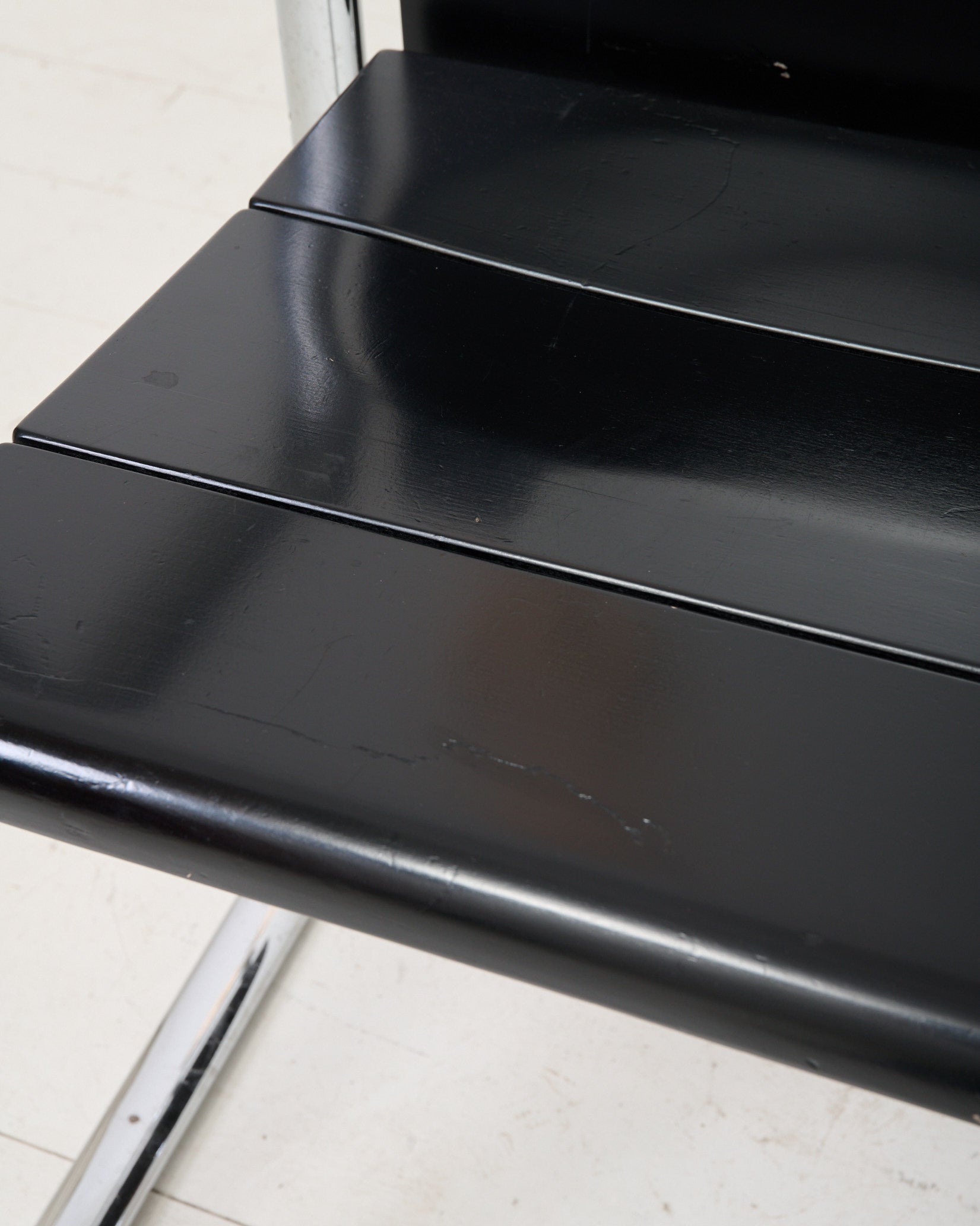 Ensemble de quatre chaises modèle G-pino ou "Pinocchio" par Martin Stoll. Signé sous l'assise (voir photo). Structure en métal chromé. Très bel état du chrome, quelques manques et traces au niveau de la peinture blanche sur le bois (parties blanches).