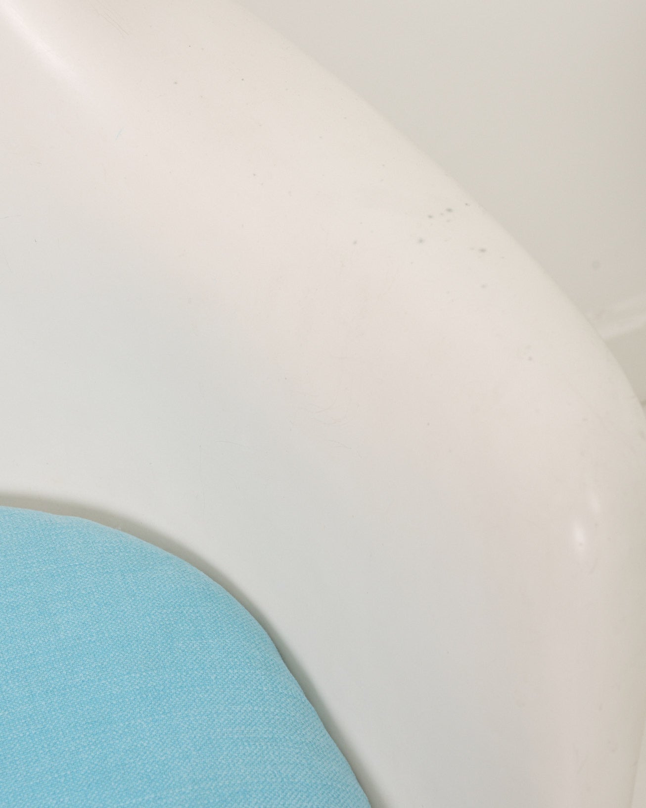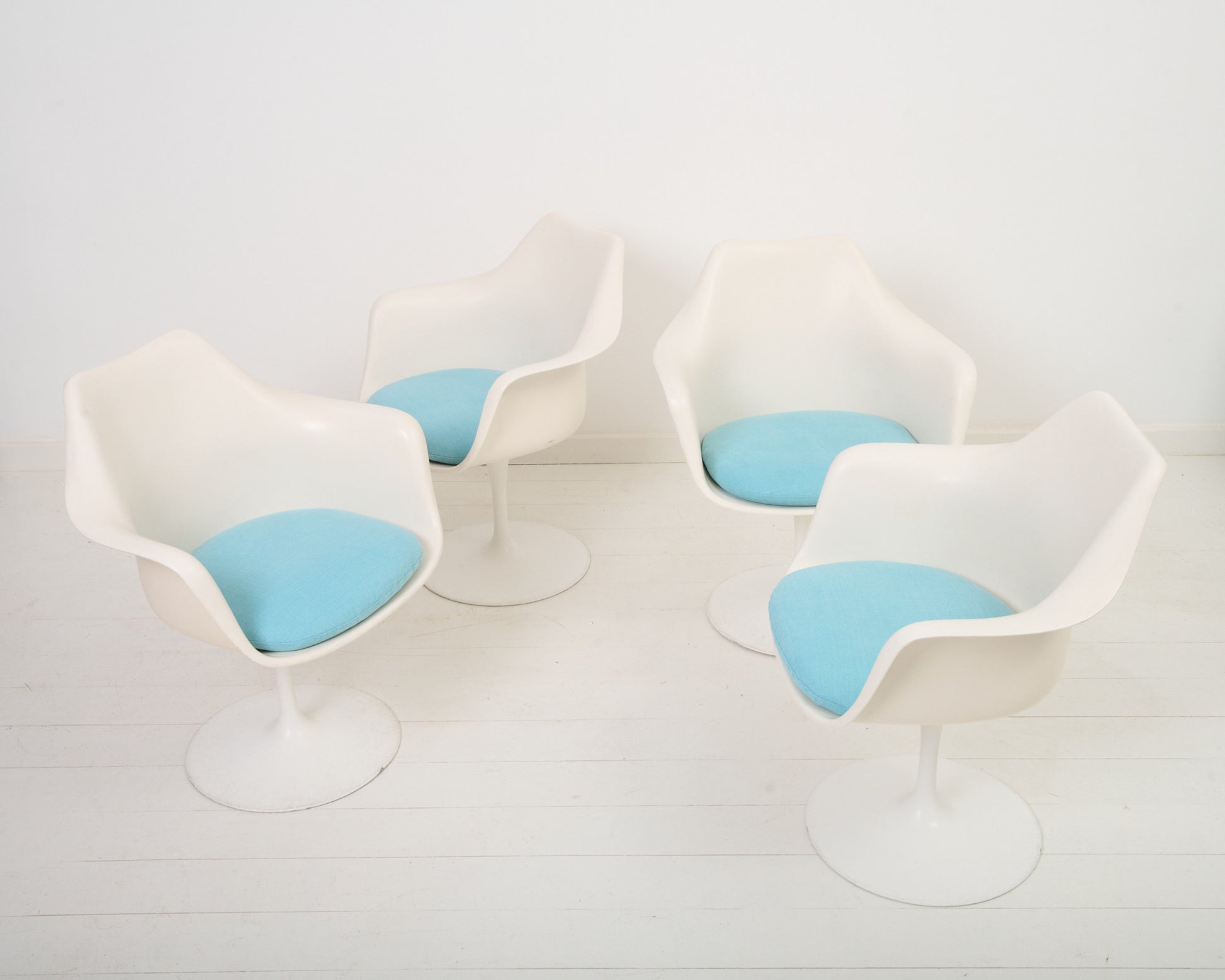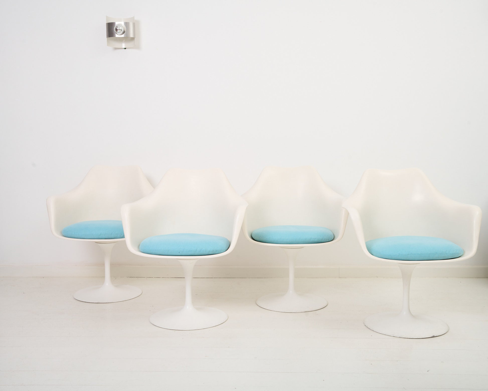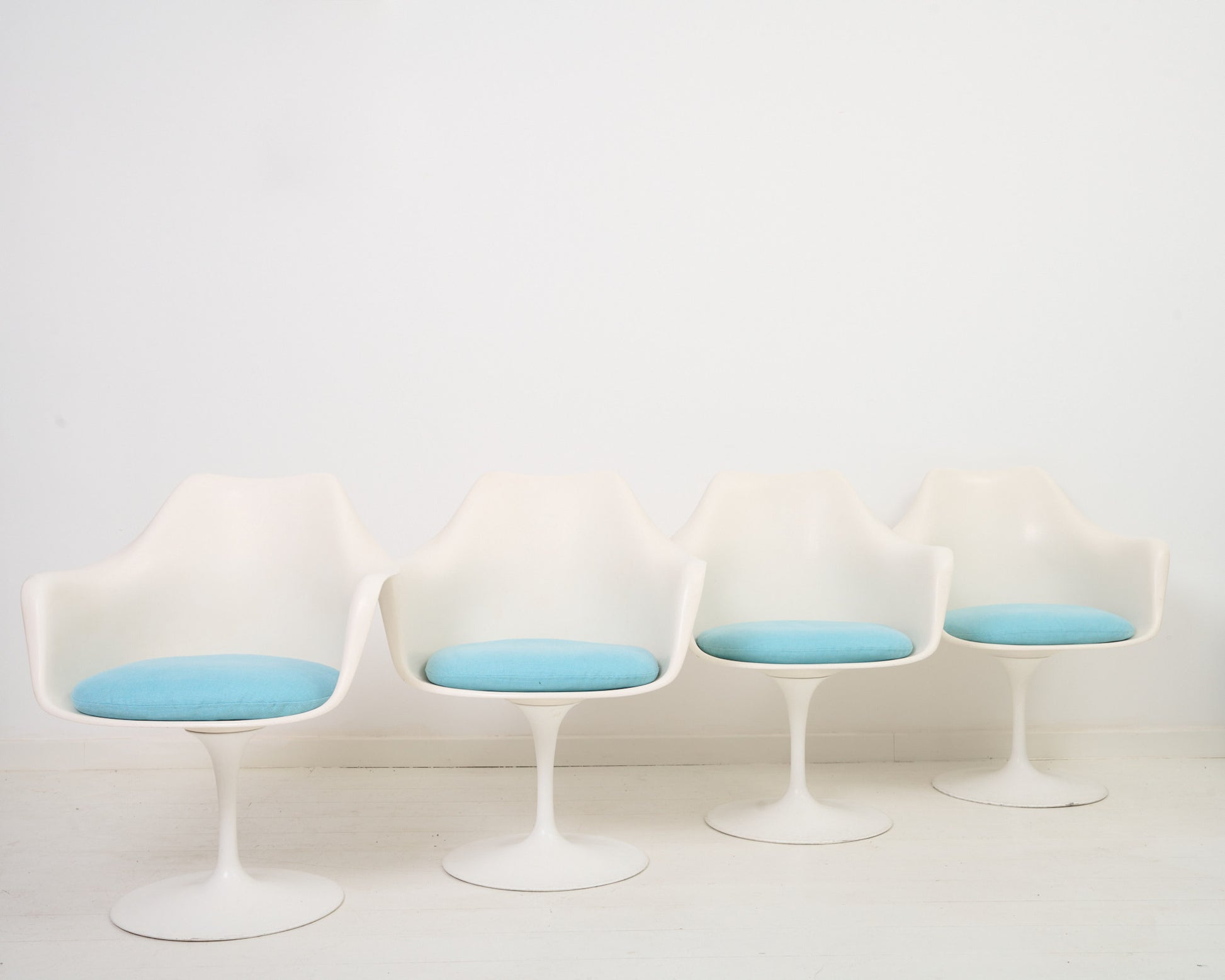 - Paire de fauteuils "Tulip" par Eero Saarinen pour Knoll international des années 70. La coque en fibre de verre aux lignes arrondies repose sur un pied en aluminum moulé laqué blanc. Les coussins ont été retapissés en coton et lin bleu ciel, tout en conservant la mousse d'origine. Deux disponibles (soit quatre chaises au total). Bel état, avec de légères traces du temps sur la coque et le pied. Une des chaise ne pivote pas.