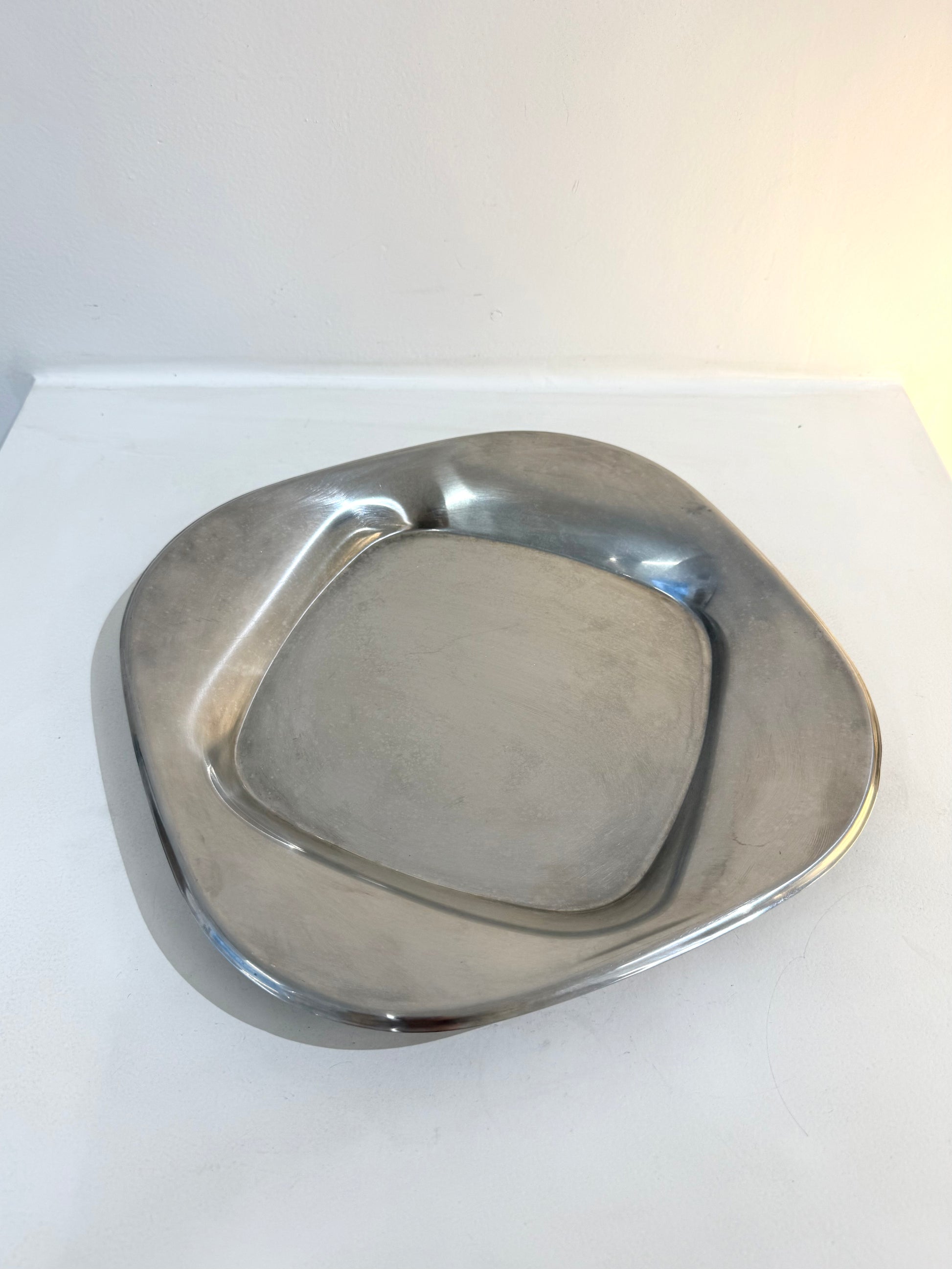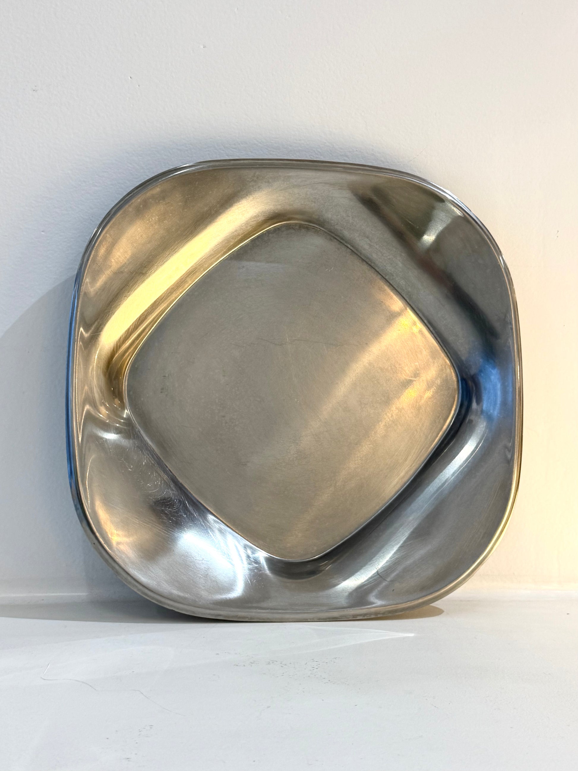 Plat de service en inox italien des années 1970s. Forme carrée arrondie légèrement creuse. Très bel état.