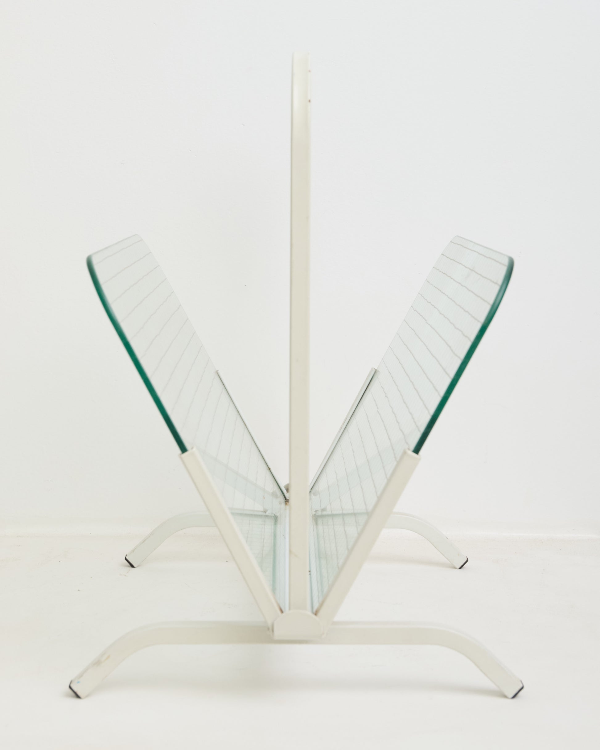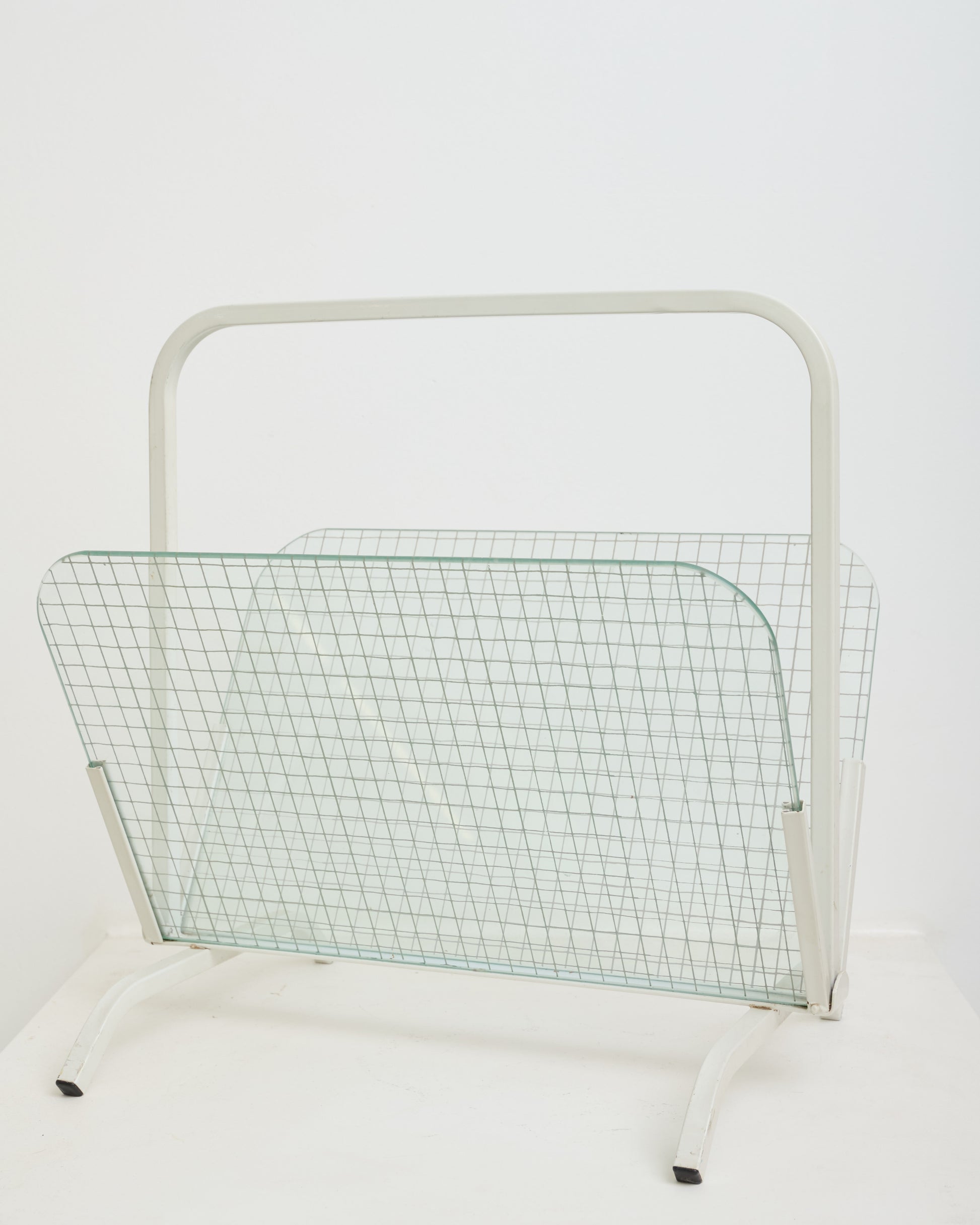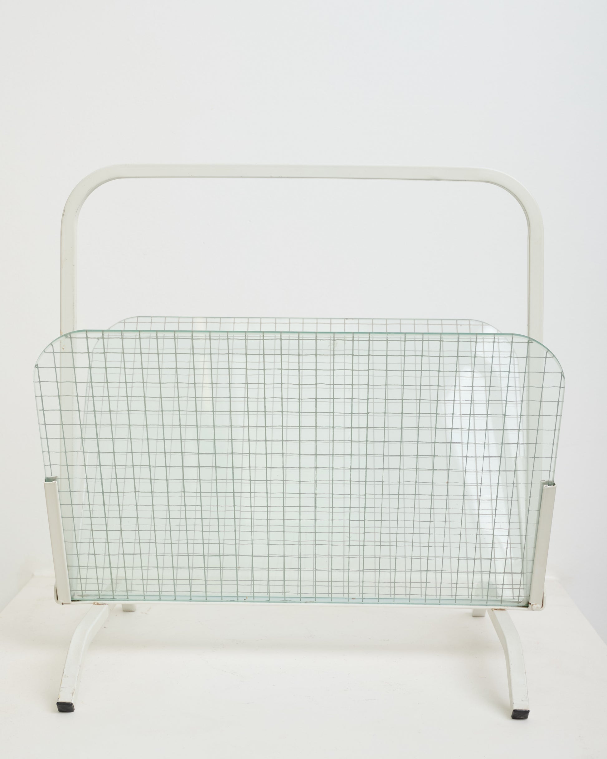 Porte-revues en verre transparent à carreaux des années 70. Structure métal peint en blanc. Bel état, quelques rayures sur le métal.