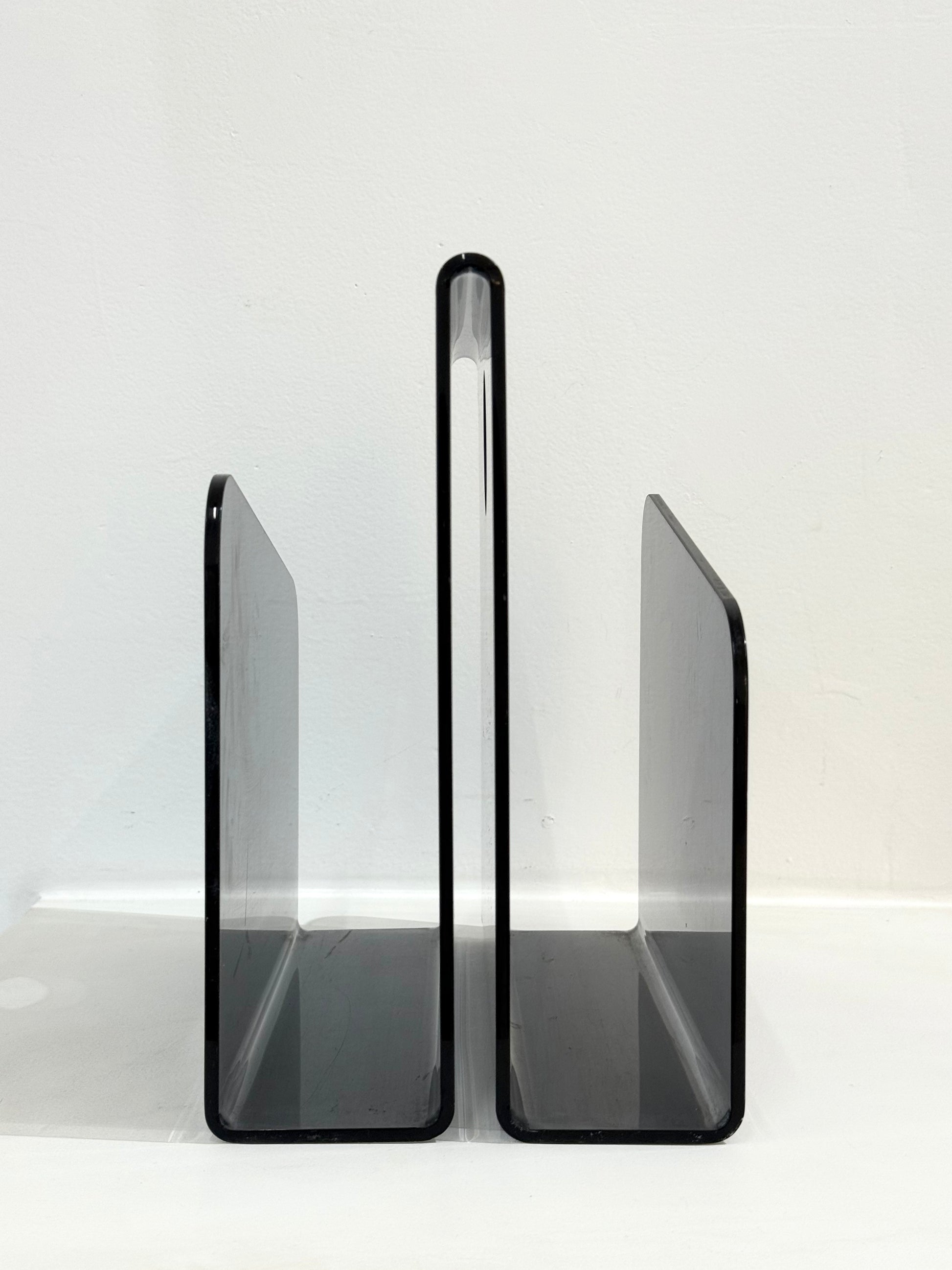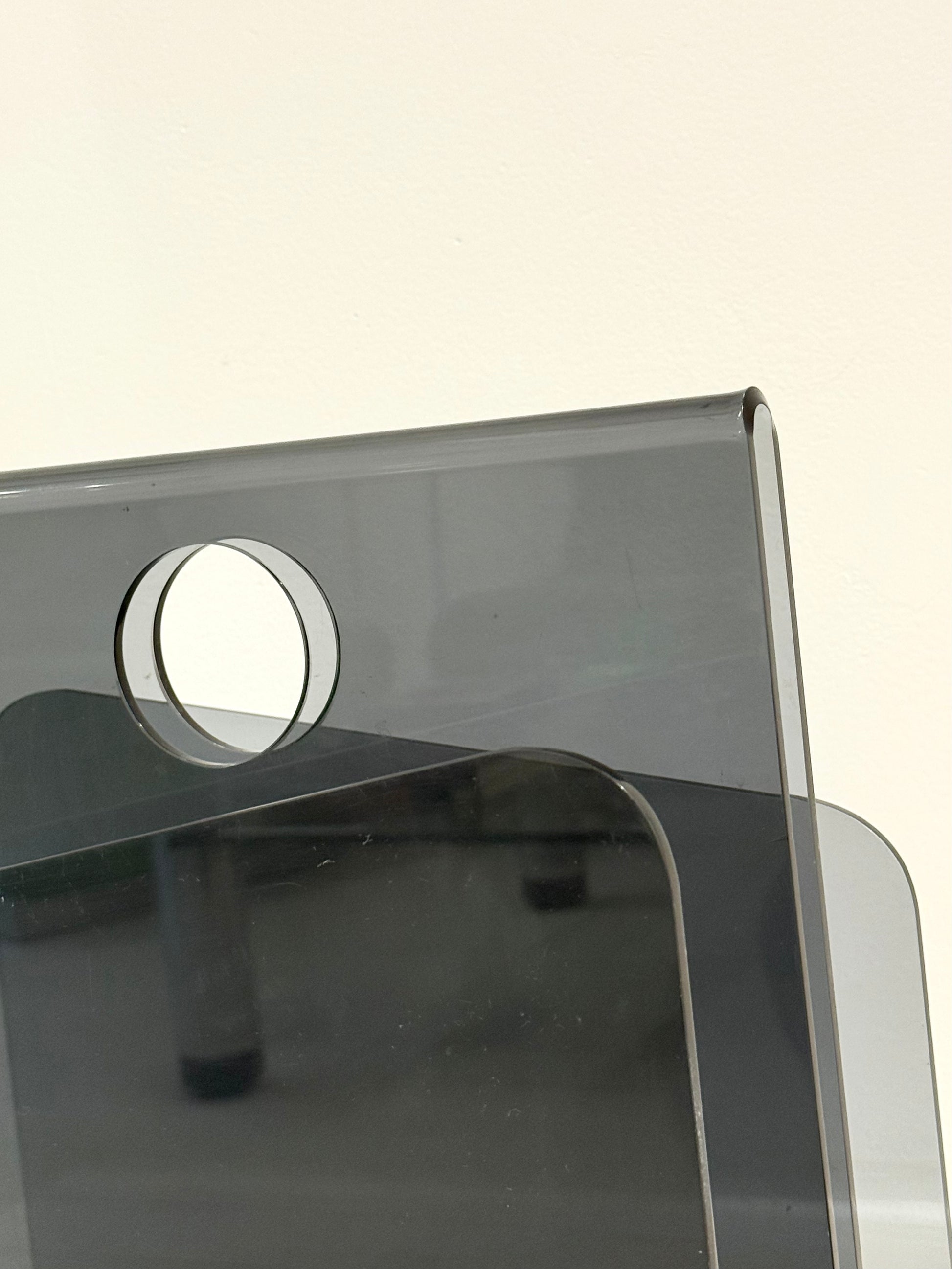 Porte-revues en plexiglas fumé gris des années 70-80. Style space age. Bel état, aucune fissure mais quelques traces légères.