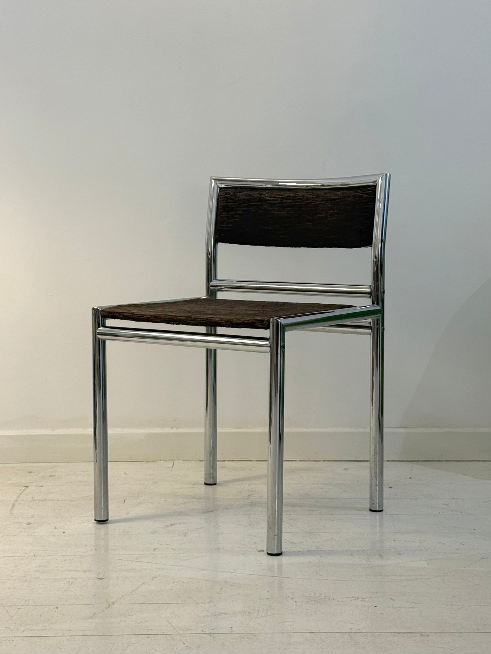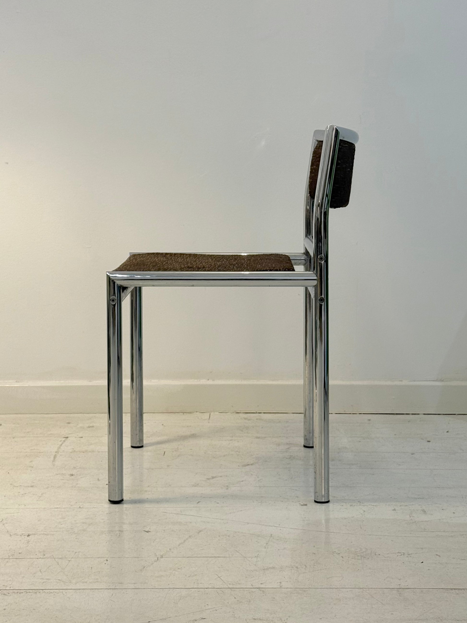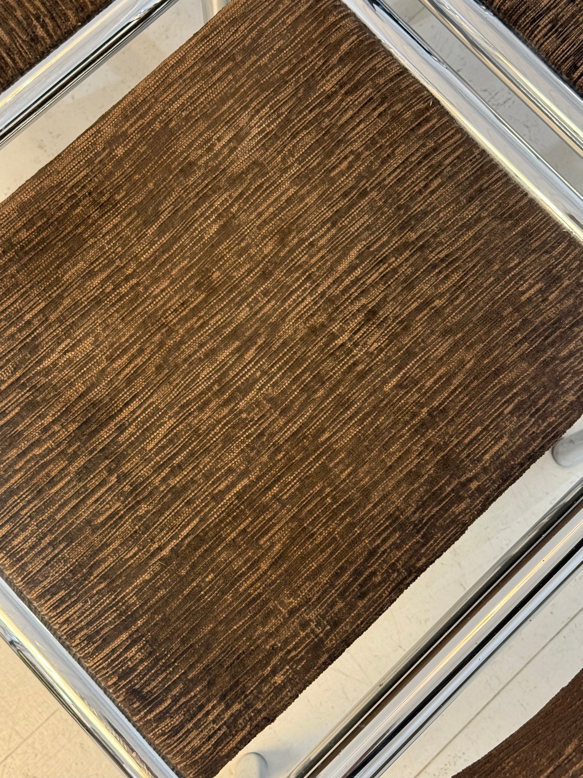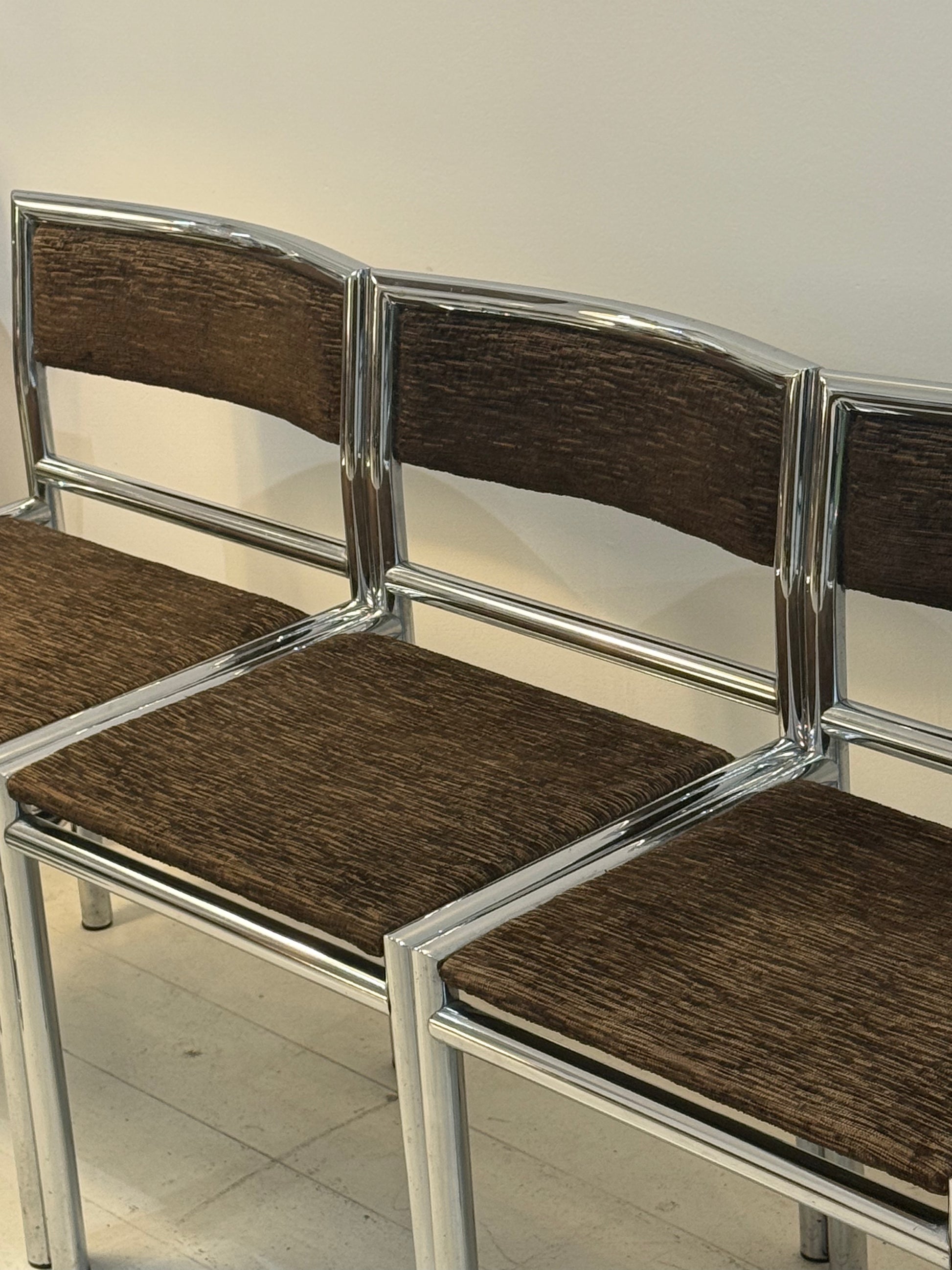 Quatre chaises tubulaires chrome et velours, 1970s. Tissu chiné marron et beige. Très bel état, quelques piqûres sur le chrome.