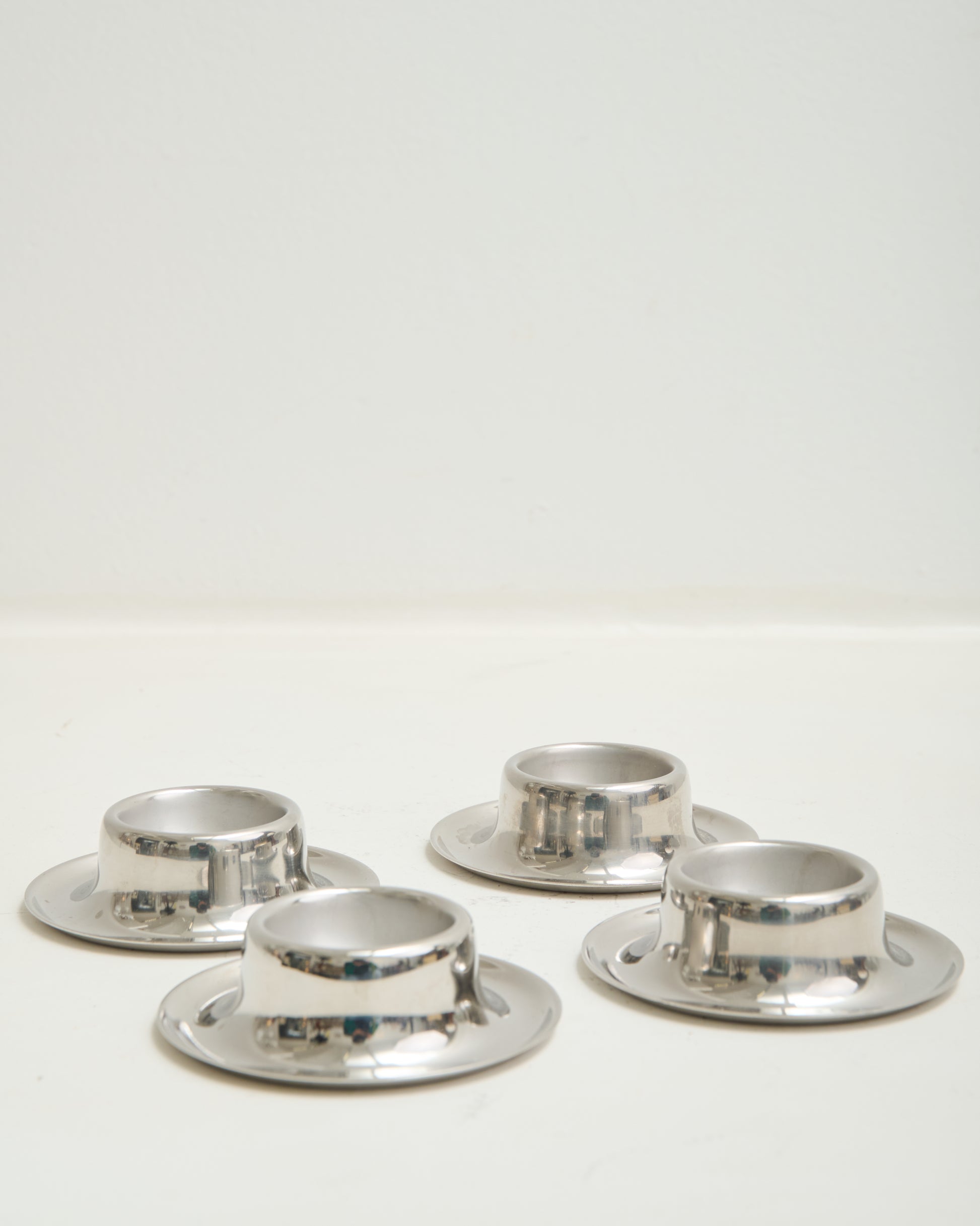 Quatre coquetiers ronds space age en métal chromé des années 70. Inox 18/10. Très bel état.