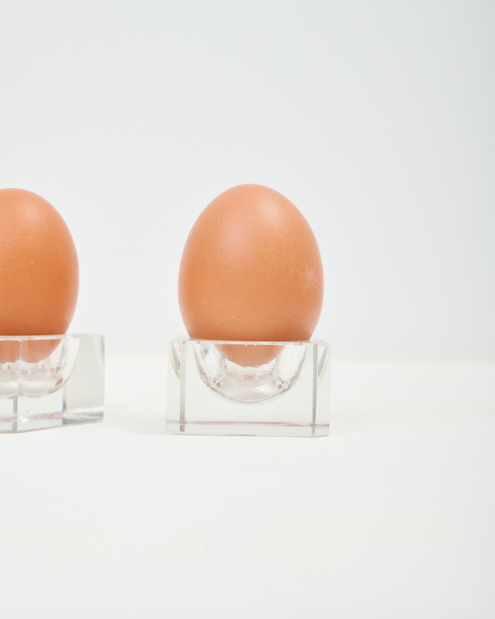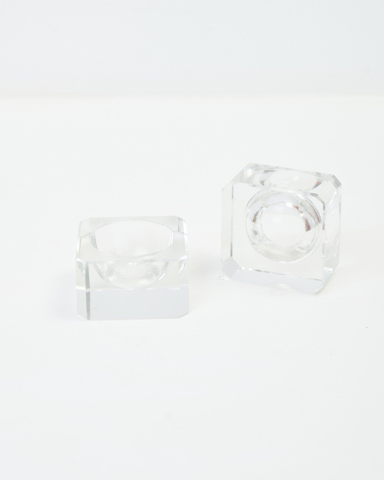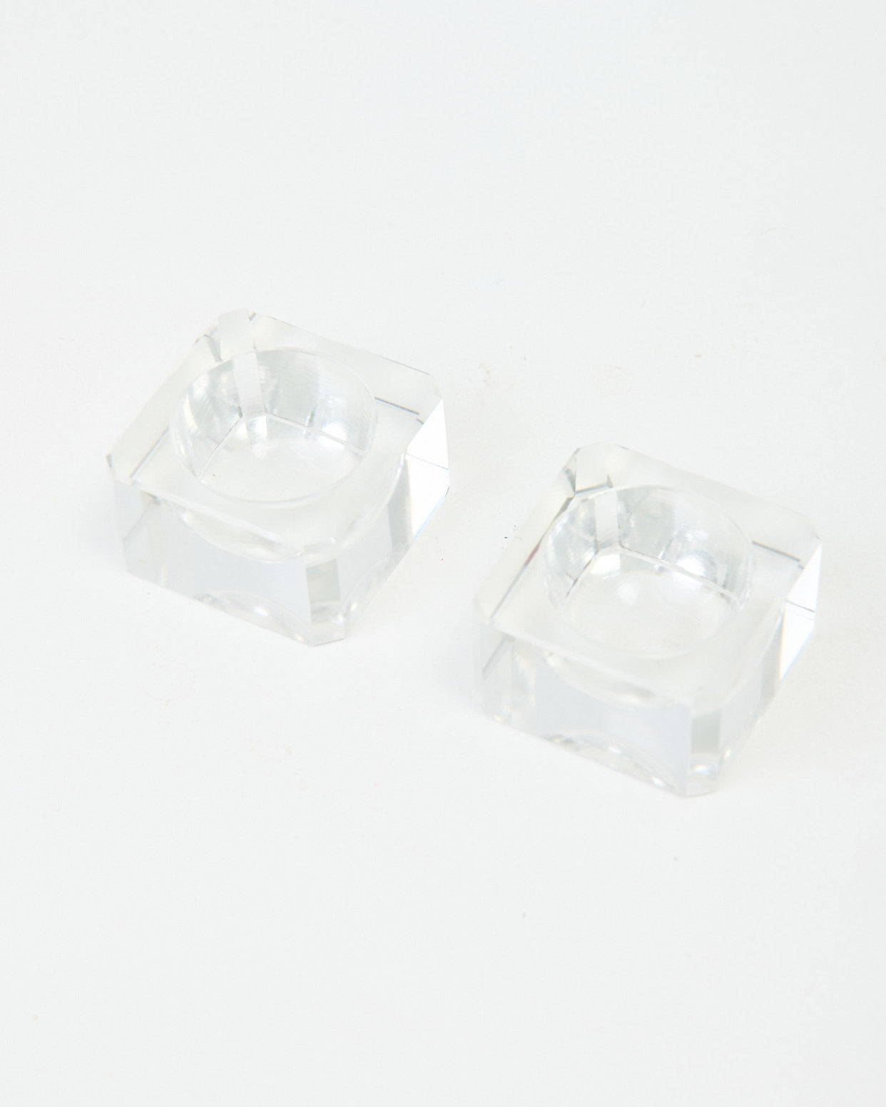 Duo de contenant en verre de forme cubique et creusée. Utilisation en tant que salière et poivrier ou en coquetier. Très bel état.