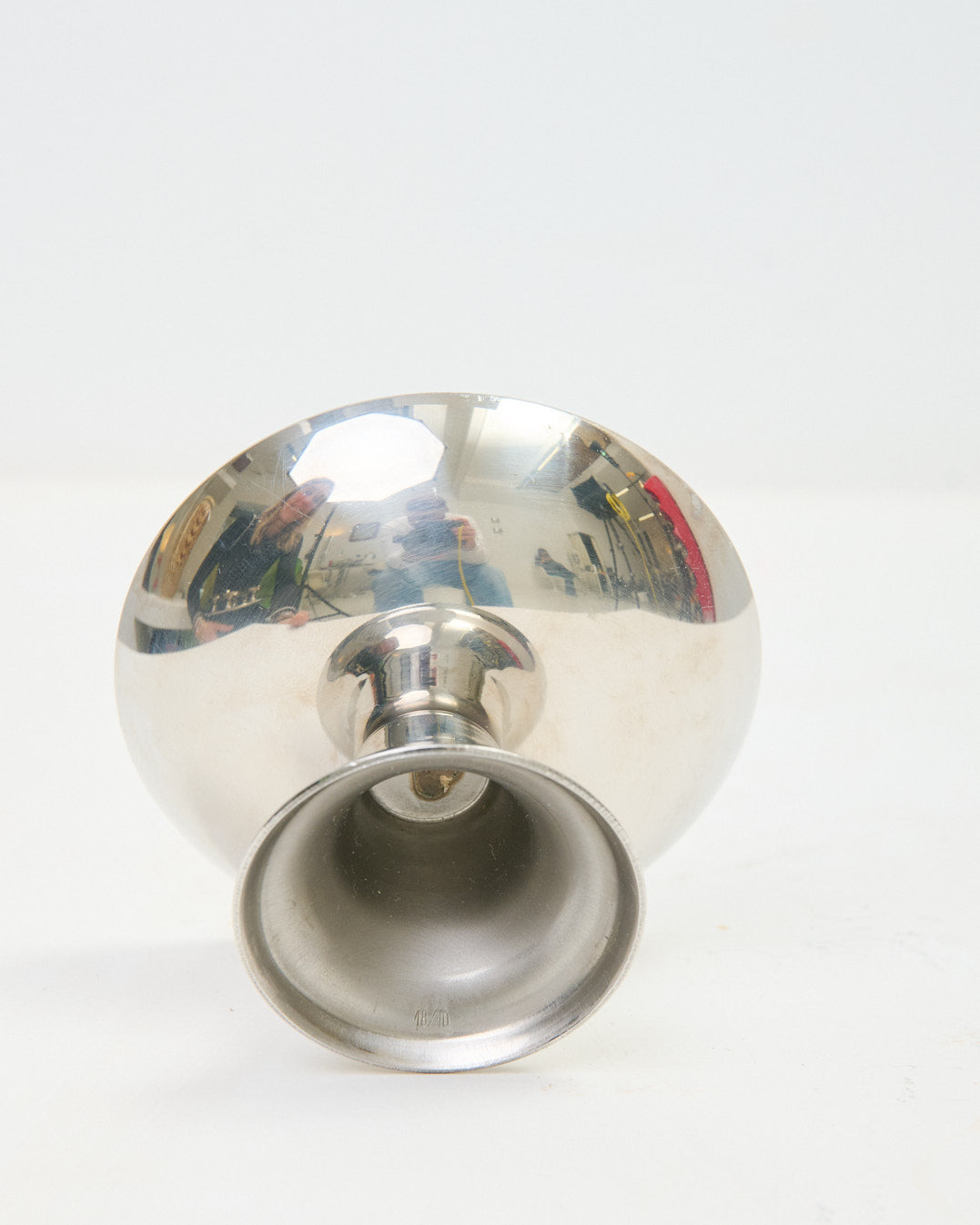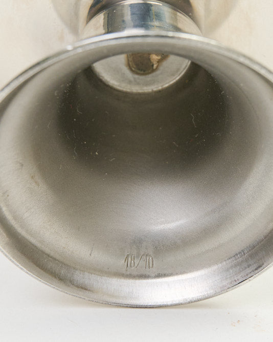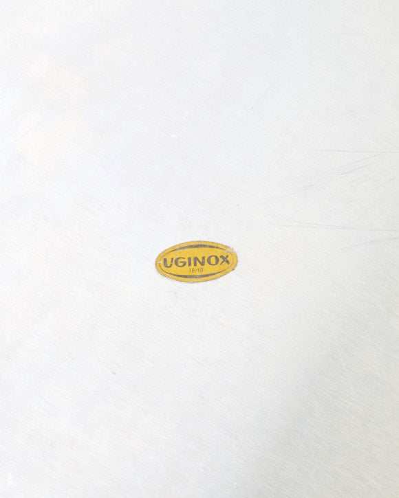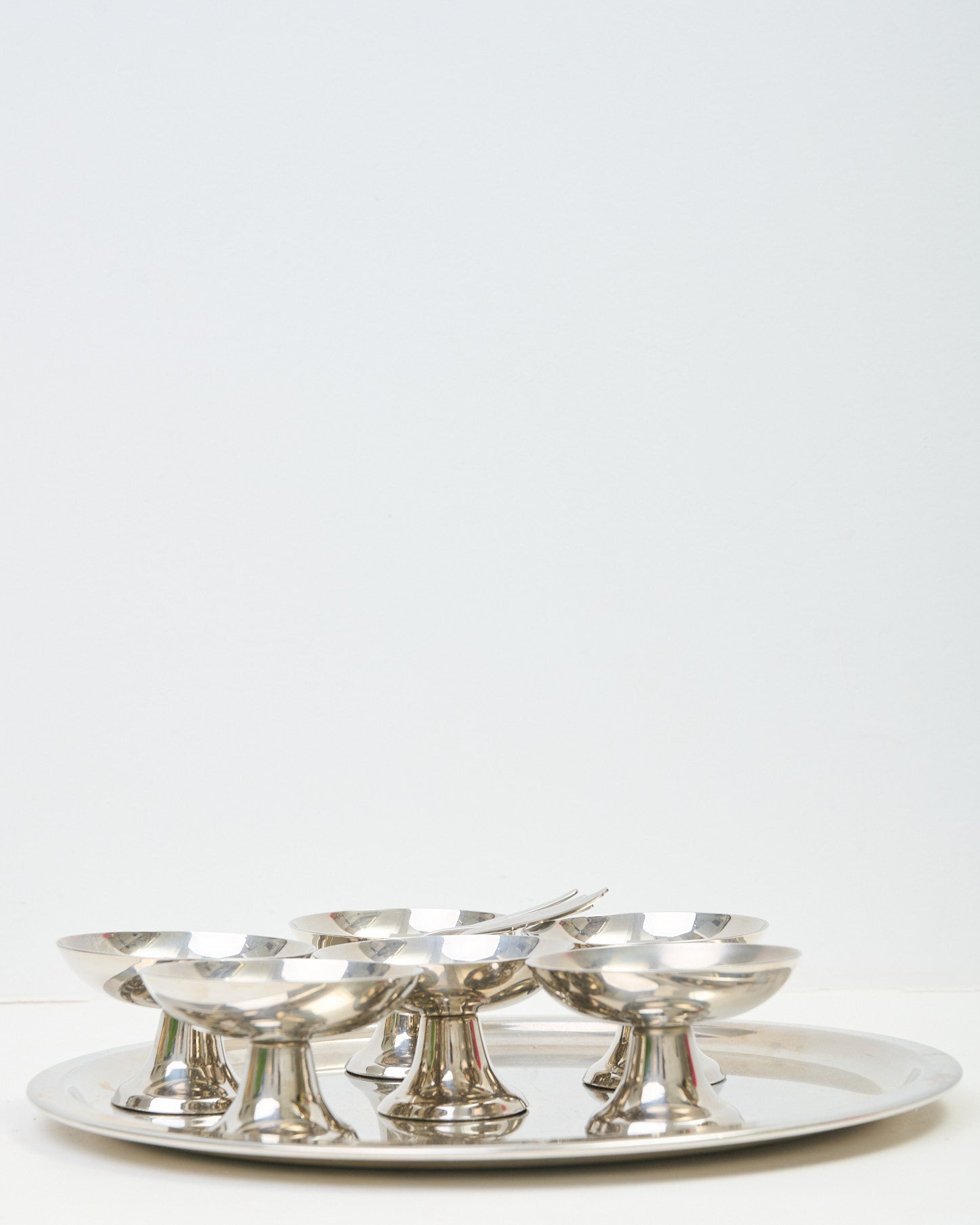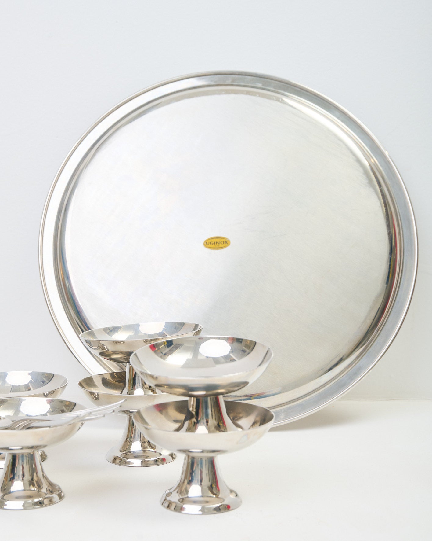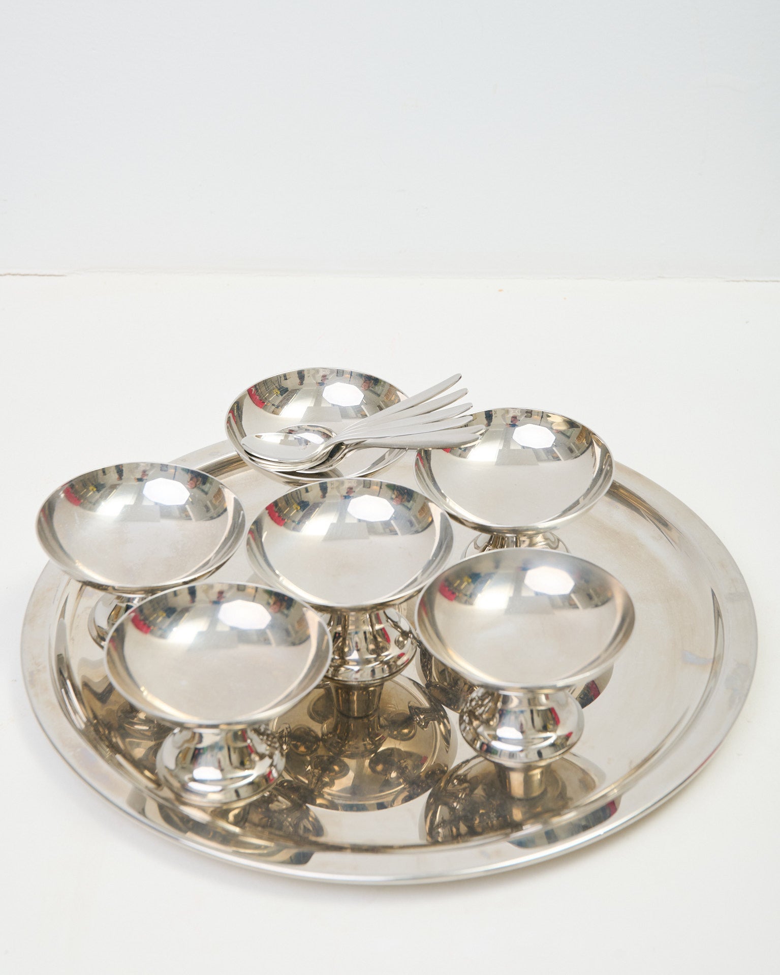 Service à glace en inox dans les années 70. Composé de six coupes à dessert en inox avec pied tulipe et un plateau rond. Bel état malgré de légères rayures sur le plateau.