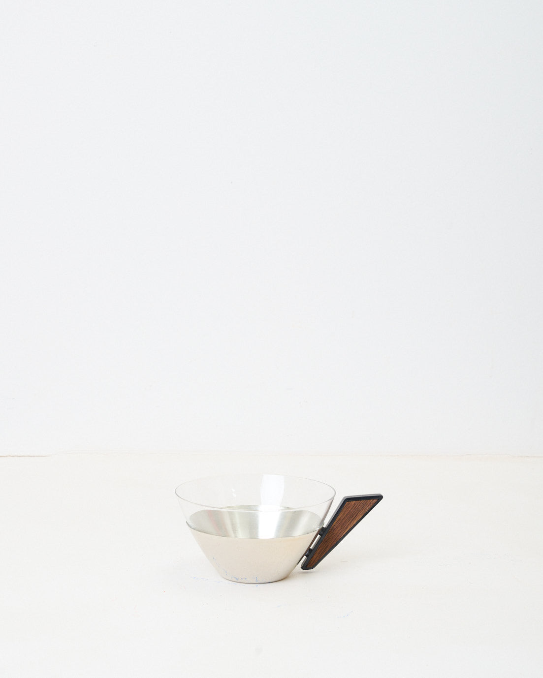 Quatre tasses à café du milieu des années 60 de forme originale. La partie en verre est dissociée du socle en métal. Socle en métal chromé avec poignée en plastique et bois. Très bel état.