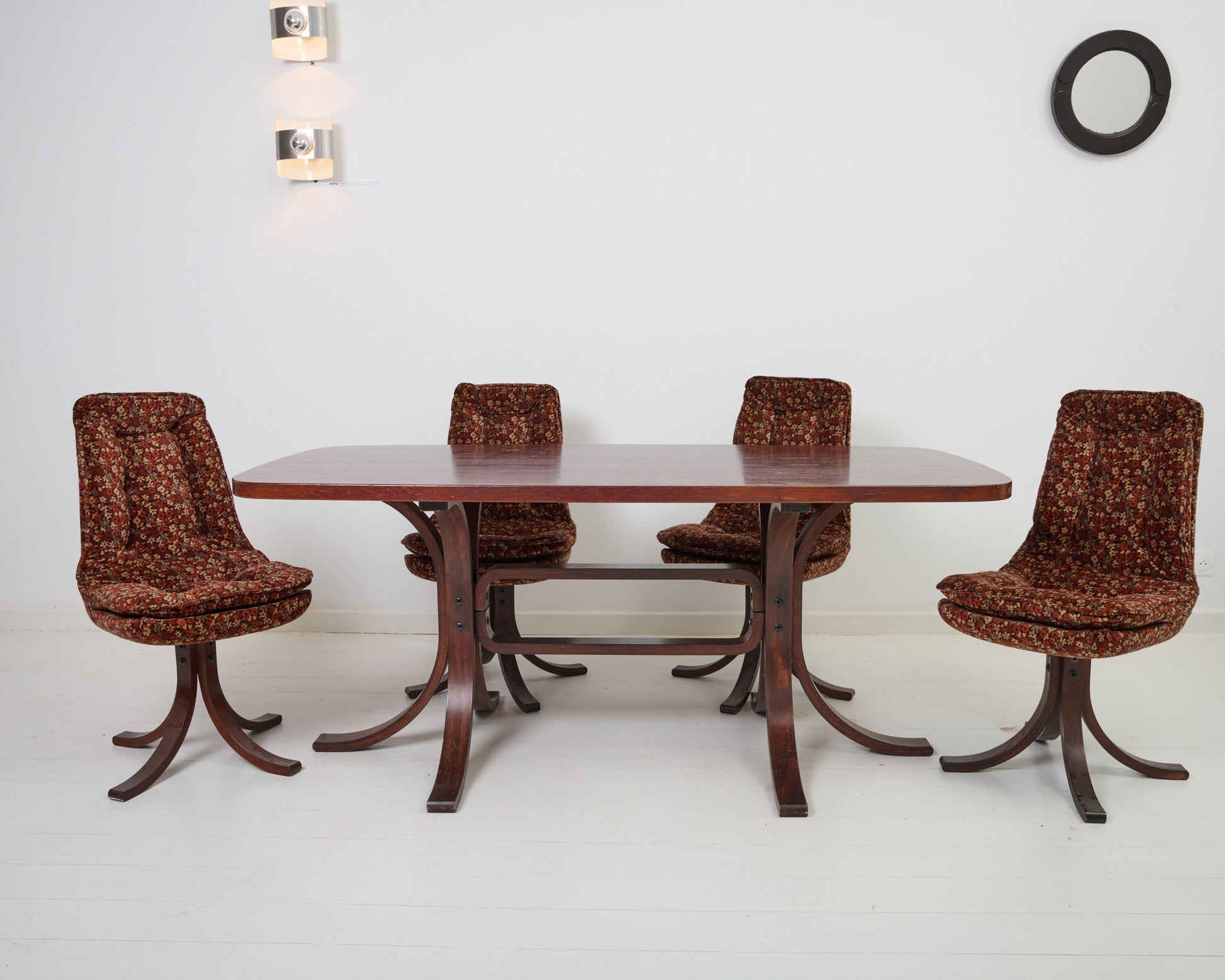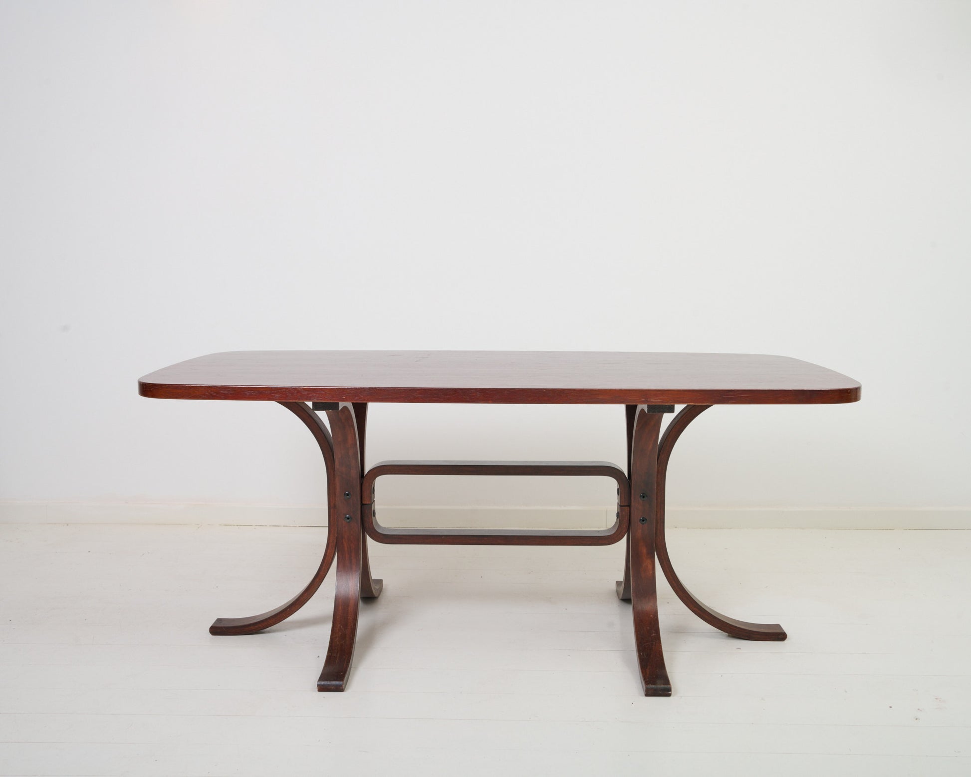 Table à manger en bois courbé des années 70. Possibilité de mettre un plateau en verre. Très bel état malgré quelques traces du temps (une vis a été remplacée pour tenir le pied).
