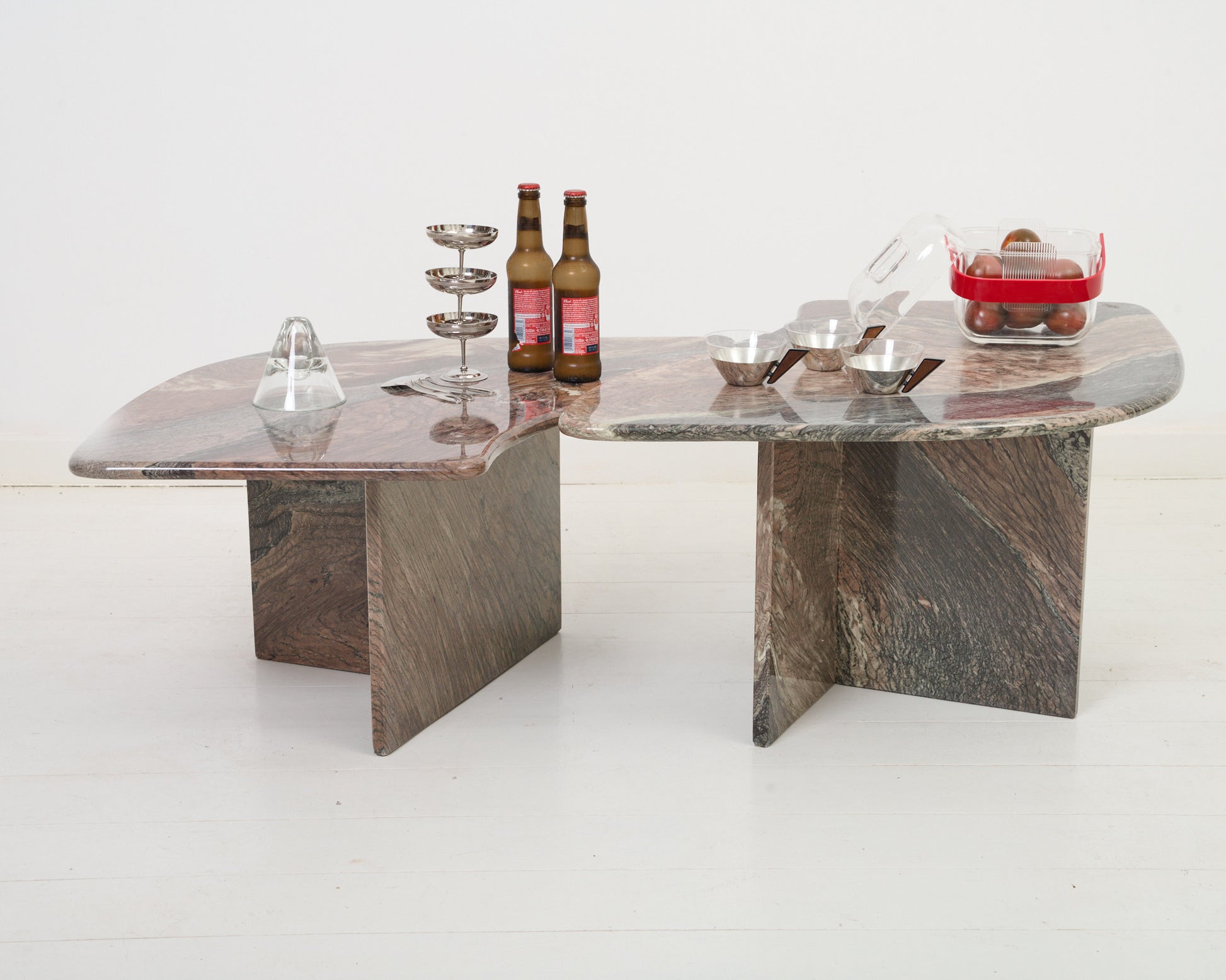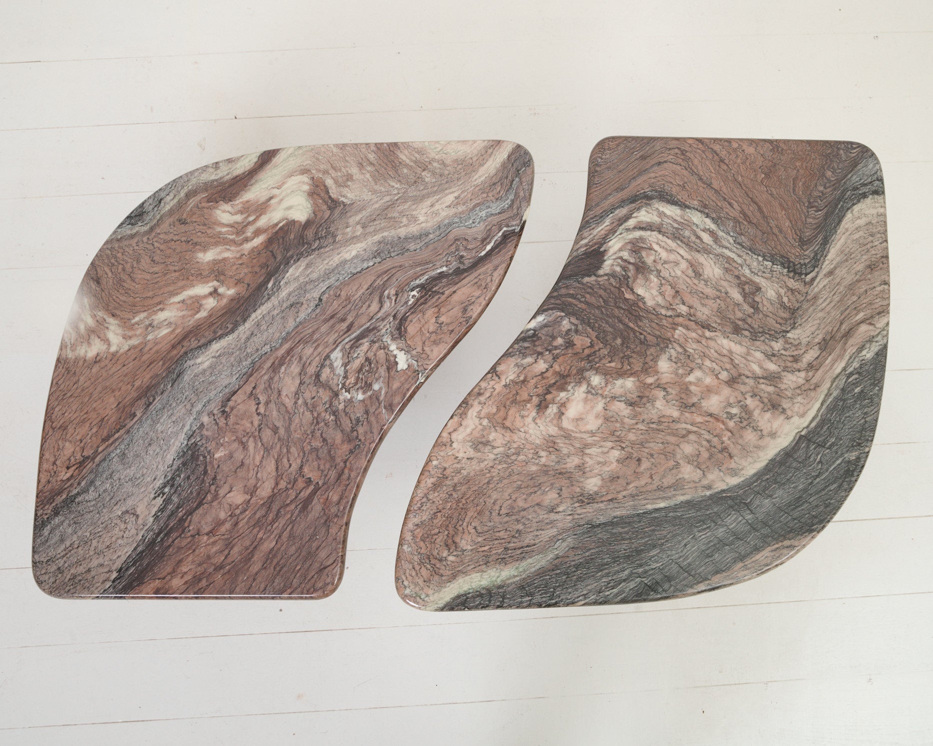Table basse en deux parties de forme libre en marbre "cipollino". Le mabre cipolin est un marbre originaire de Toscane, cipollino signifiant "oignon" en italien car il est parcouru de nervures de couleurs variées. Plateaux de deux hauteurs différentes, pieds centraux à trois pans. Très bel état.