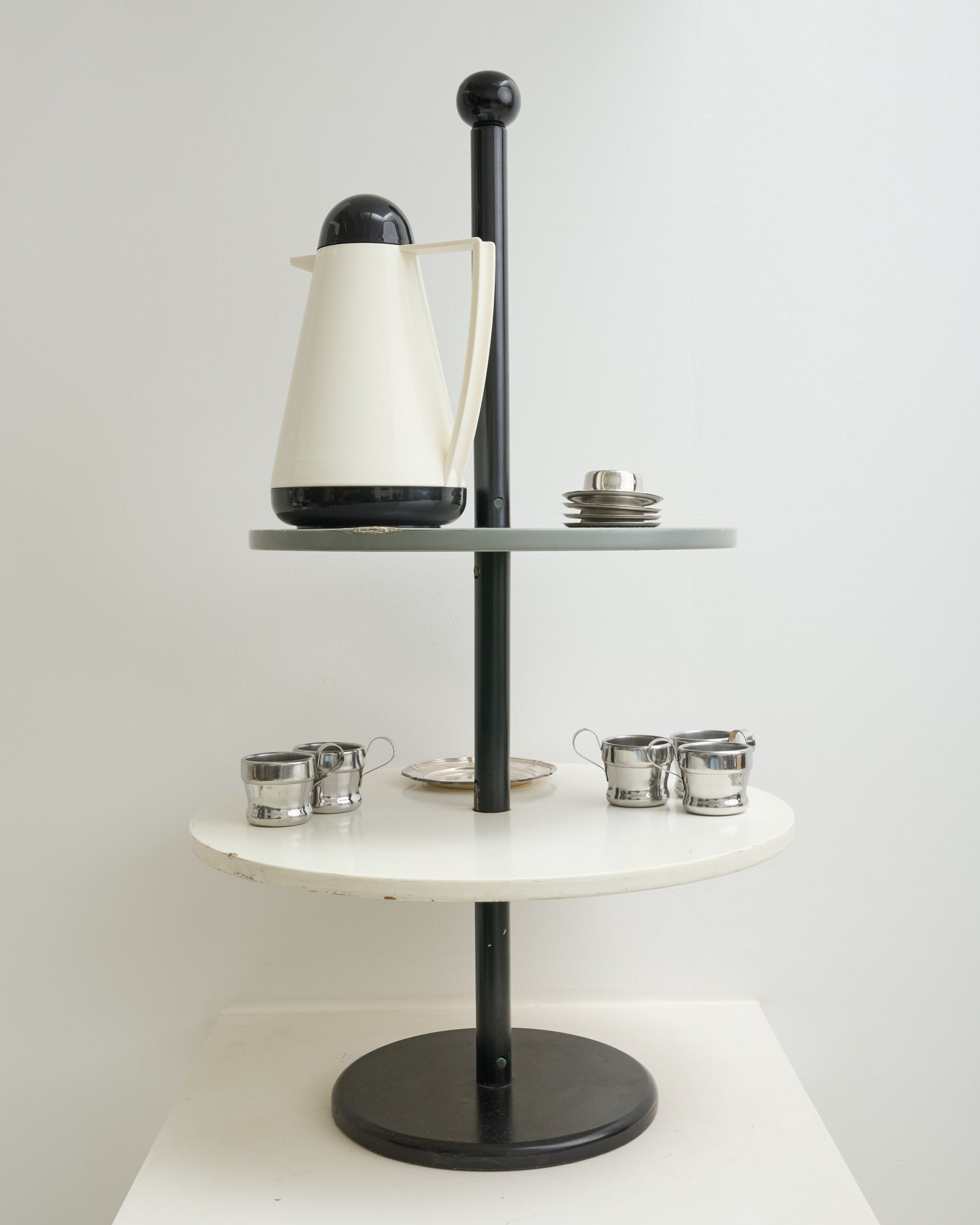 Table d'appoint par Achille Castiglioni pour Zanotta, Italie, dans les années 70-80. Tricolore avec la structure noire, et un premier plateau gris et un deuxième plateau blanc plus large. Bel état malgré quelques traces du temps : manques au niveau de la peinture à certains endrois.